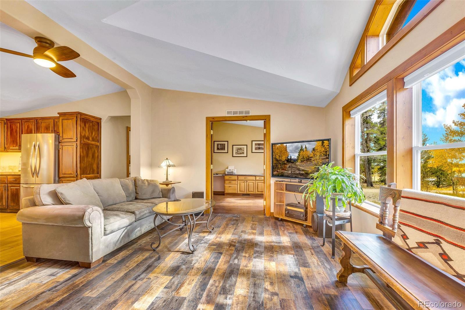 Discover your ideal mountain retreat in Foxtail Pines, just 9 minutes from historic Fairplay and 23 miles from World Class skiing in Breckenridge! This 4 bed/3 bath home combines seclusion & treed living with modern convenience and nearby access to world-class recreation. Enjoy privacy & adventure on your treed and secluded 2-acre lot, beautifully situated in a quiet aspen grove. The home is located on a peaceful cul-de-sac with the HOA's private fishing pond just down the street. Only a mile from National Forest access and tons of prime hiking & biking trails. Close to premier fishing, camping, and mountain climbing—including Mount Sherman, one of Colorado's infamous 14ers! Enjoy the quiet without sacrificing convenience—you're only about 1/2 mile from pavement! Some recent upgrades include a newly remodeled kitchen, new flooring, new lighting, updated bathrooms, and more! The updated primary bath features a modern freestanding tub and a beautiful tiled walk in shower. Large windows throughout the home maximize natural light and showcase the stunning surroundings. Soak up the Colorado sunshine on the XL deck, or cozy up next to the efficient wood stove! Peace of mind is built in with quick-heating radiant Cove Heaters in 2 of the bathrooms, a new natural gas water heater, and a 6-year old roof. Work or stream easily with StarLink already set up—a reliable source for mountain internet! And...the heated, insulated 2-car garage and 8 x 12 storage shed are icing on the cake! This is the perfect full time or part time home!