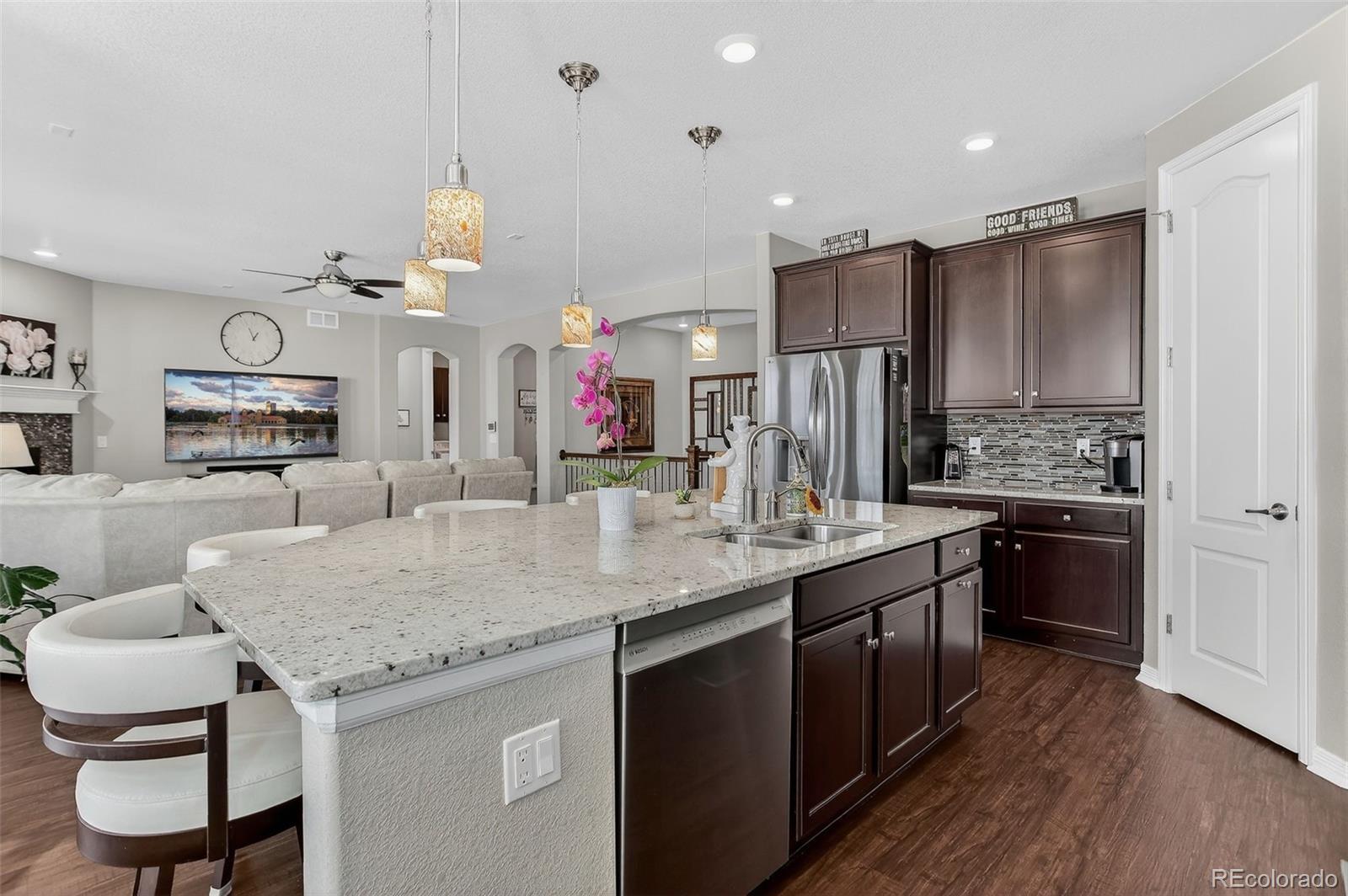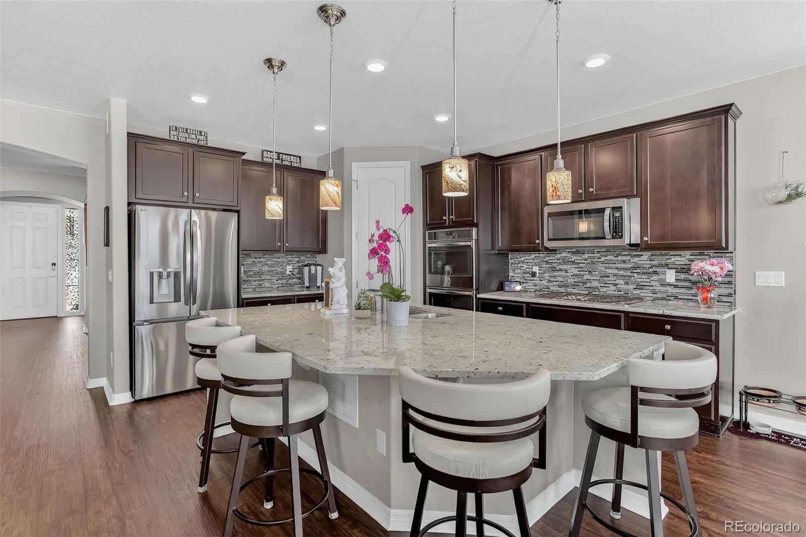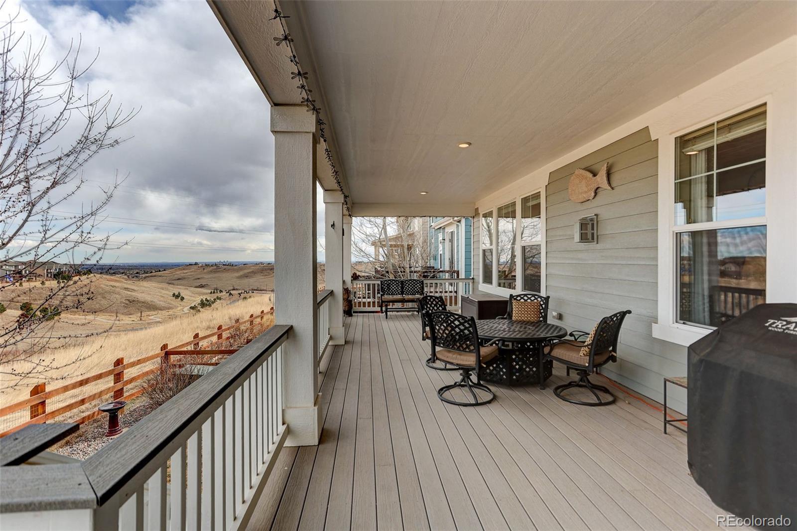 Impeccably maintained and exceptionally clean, this stunning 4-bedroom, 3-bath home offers comfort, space, and breathtaking views of downtown Denver. From the moment you arrive, the charming front porch welcomes you in. Step inside to an inviting open floor plan designed for both everyday living and entertaining. The spacious kitchen features granite countertops, a double oven, a brand-new dishwasher, and plenty of prep space for hosting with ease. The cozy fireplace anchors the main living area, creating a warm and inviting atmosphere. The large primary suite is a true retreat, complete with a luxurious 5-piece bath, walk-in large closet, and generous space to unwind. Two other bedrooms and main floor laundry round out the main level. Downstairs, the beautifully finished basement expands your living area with a massive family room, wet bar, an additional bedroom with a large walk-in closet, and a ¾ bath—perfect for guests or multi-generational living. Two separate storage areas provide plenty of room for organization. Step outside to the oversized back deck and take in the amazing views of downtown Denver—ideal for relaxing evenings or entertaining under the Colorado sky. The 3-car finished garage is a standout feature, complete with built-in cabinets and a painted floor for a clean, polished look. This home truly checks every box: location, views, condition, and thoughtful upgrades throughout. Don’t miss your opportunity to make it yours!