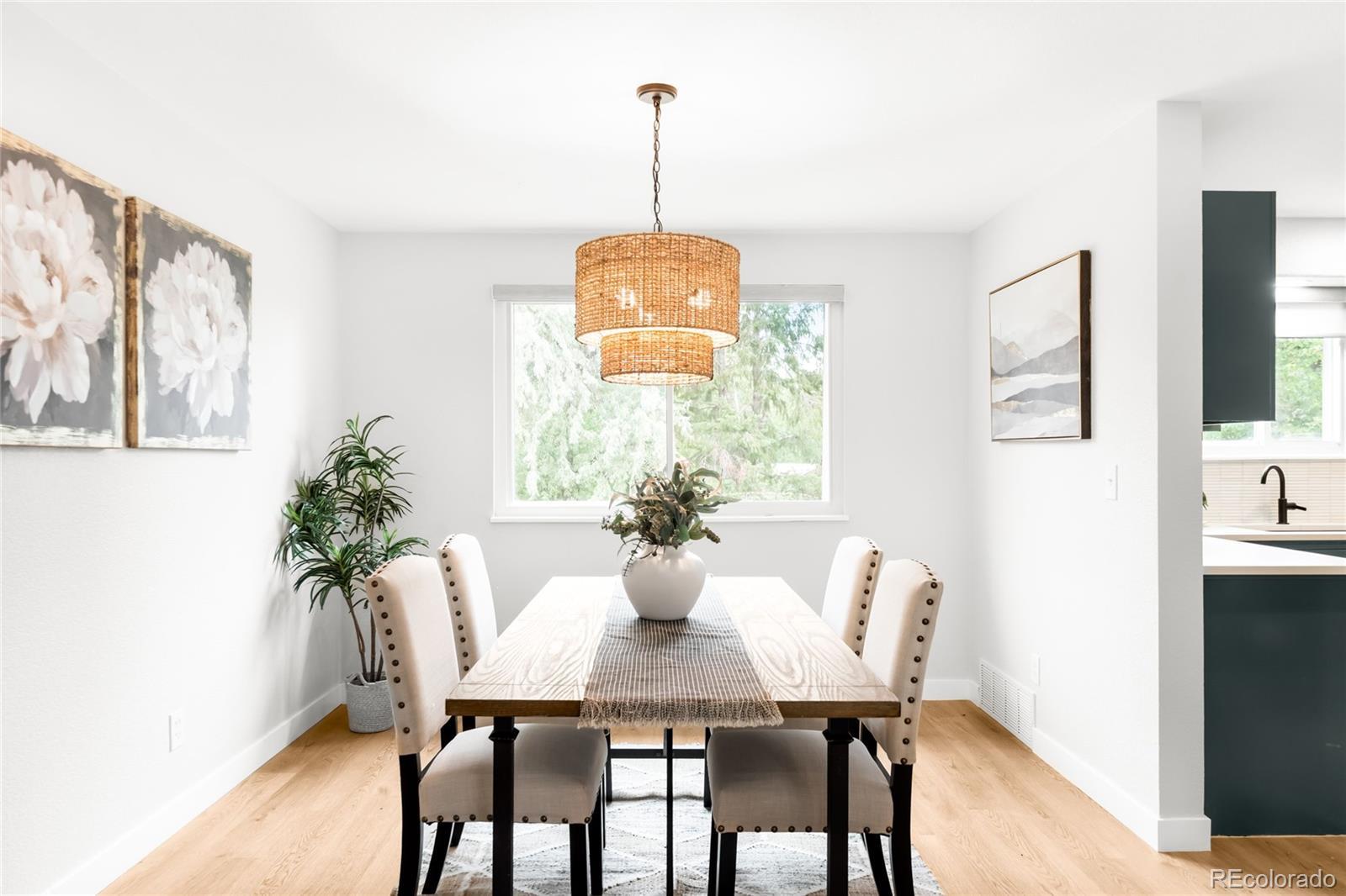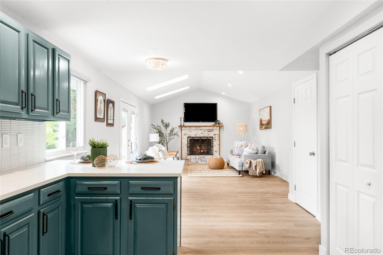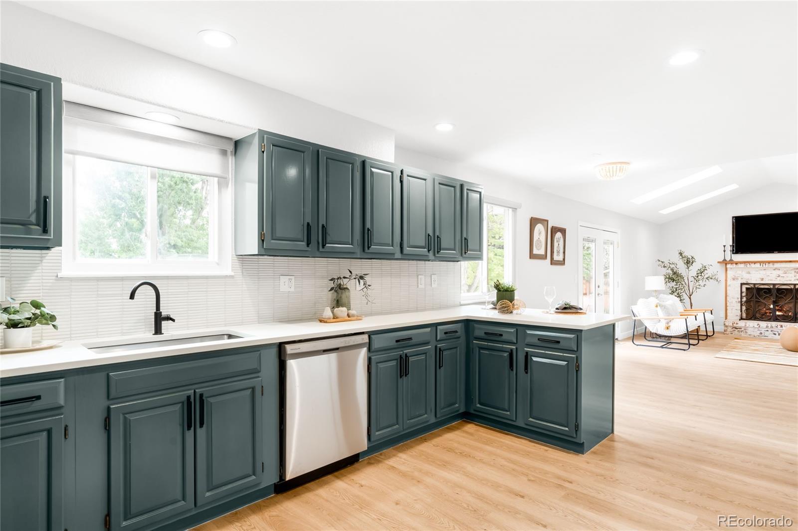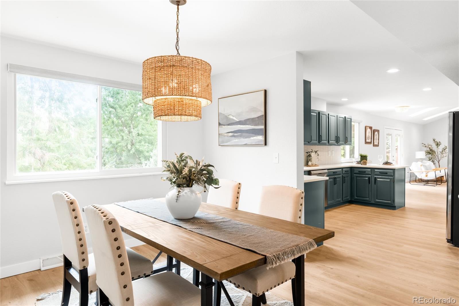 Nestled on a peaceful cul-de-sac in Ridgeview Hills North, this beautifully updated residence offers space, style and an ideal location. Set on a generous corner lot with mature trees and bonus RV or boat parking, this home welcomes with a covered front porch and timeless curb appeal. New flooring and fresh paint create a crisp, modern canvas throughout a bright, thoughtfully designed layout. A formal living room is bathed in natural light from a wide bay window, while a statement light fixture crowns the dining room. The updated kitchen shines with new appliances, ample cabinetry and a peninsula with seating — perfect for casual meals. A vaulted living area with skylights and a cozy fireplace adds warmth and volume. The spacious primary suite includes an en-suite bathroom and generous closet space. Outside, a large, fenced-in backyard offers endless potential for personalization. Just one block from the elementary school, this home presents an exceptional opportunity in Centennial.