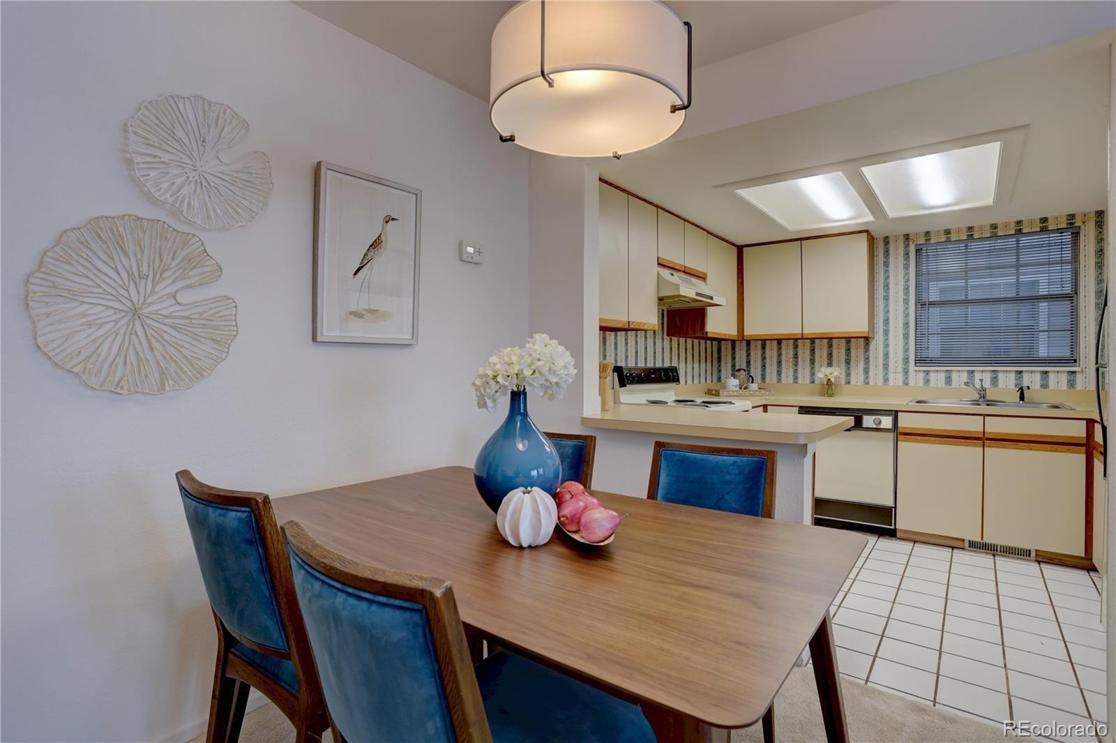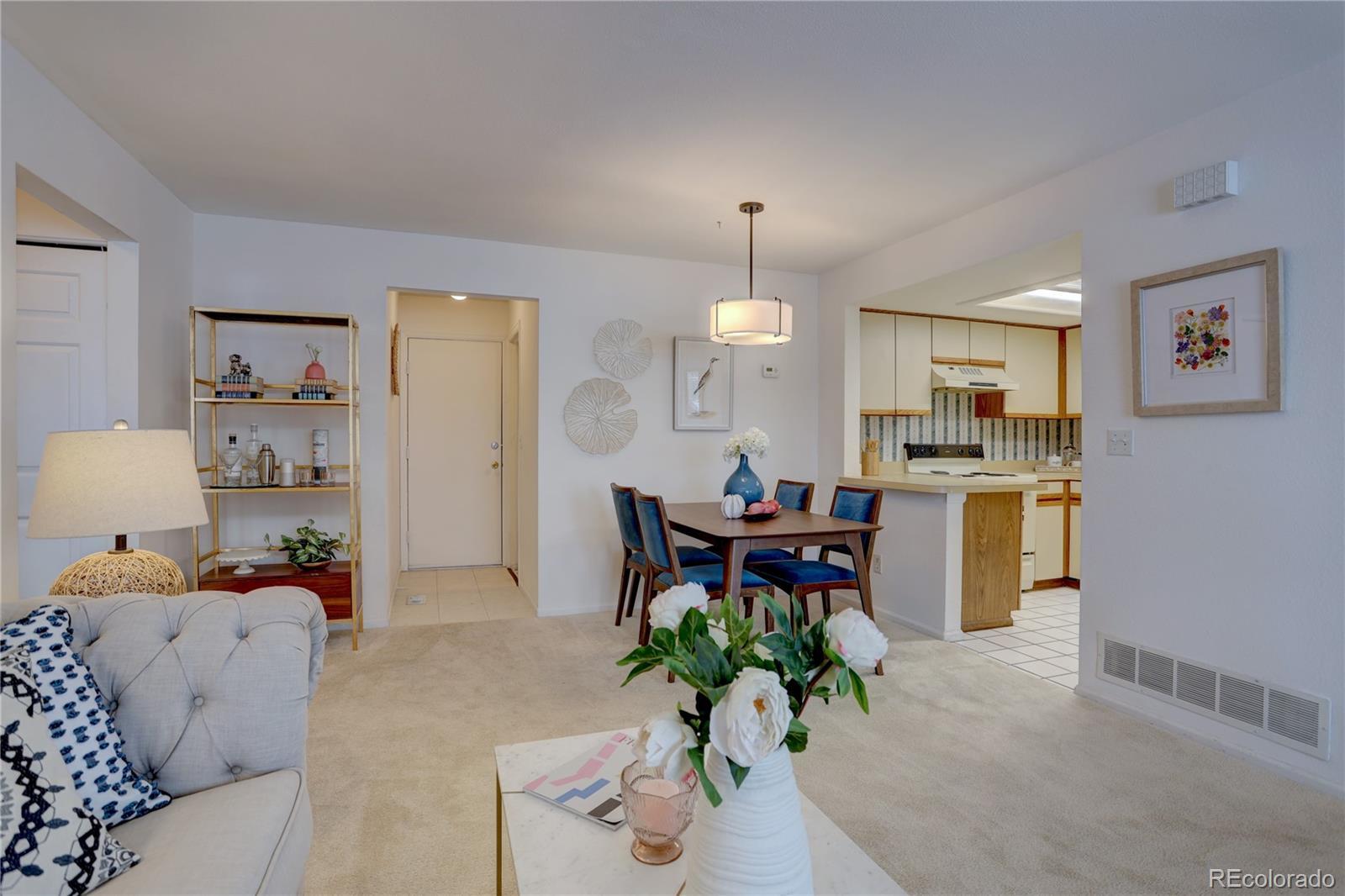 Ideally situated on a quiet block, this cozy condo is light bright and inviting. Located within the Cherry Creek School District, this home welcomes you in with a peaceful covered patio that looks out onto green space. Inside, is a great room area with tons of natural light, a stylish mantled brick fireplace, and plenty of space for a dining table. The kitchen has plenty of cabinet space and vintage touches. The primary bedroom is bright and spacious – with a huge window, brand new carpet and double closets. The en suite bathroom has a newer shower stall, tile flooring and a spacious linen closet just off the bathroom. The laundry and utility room are just off the attached one car garage, and both have ample storage space. The neighborhood pool, clubhouse and tennis courts are just down the street and Utah Park and Indoor Pool are just a few blocks away. Local eateries, entertainment and night life are also nearby as well as well as miles of biking and walking trails. Buyer to verify neighborhood schools.Taxes shown above include a senior tax exemption. The total taxes are $1221.00 according to Araphahoe County Assessor. Buyer to verify tax information.