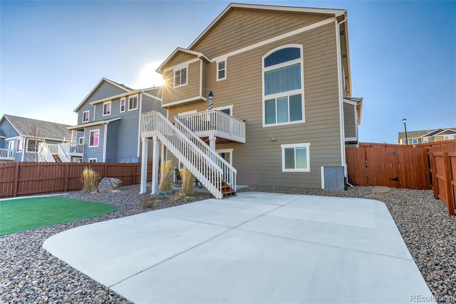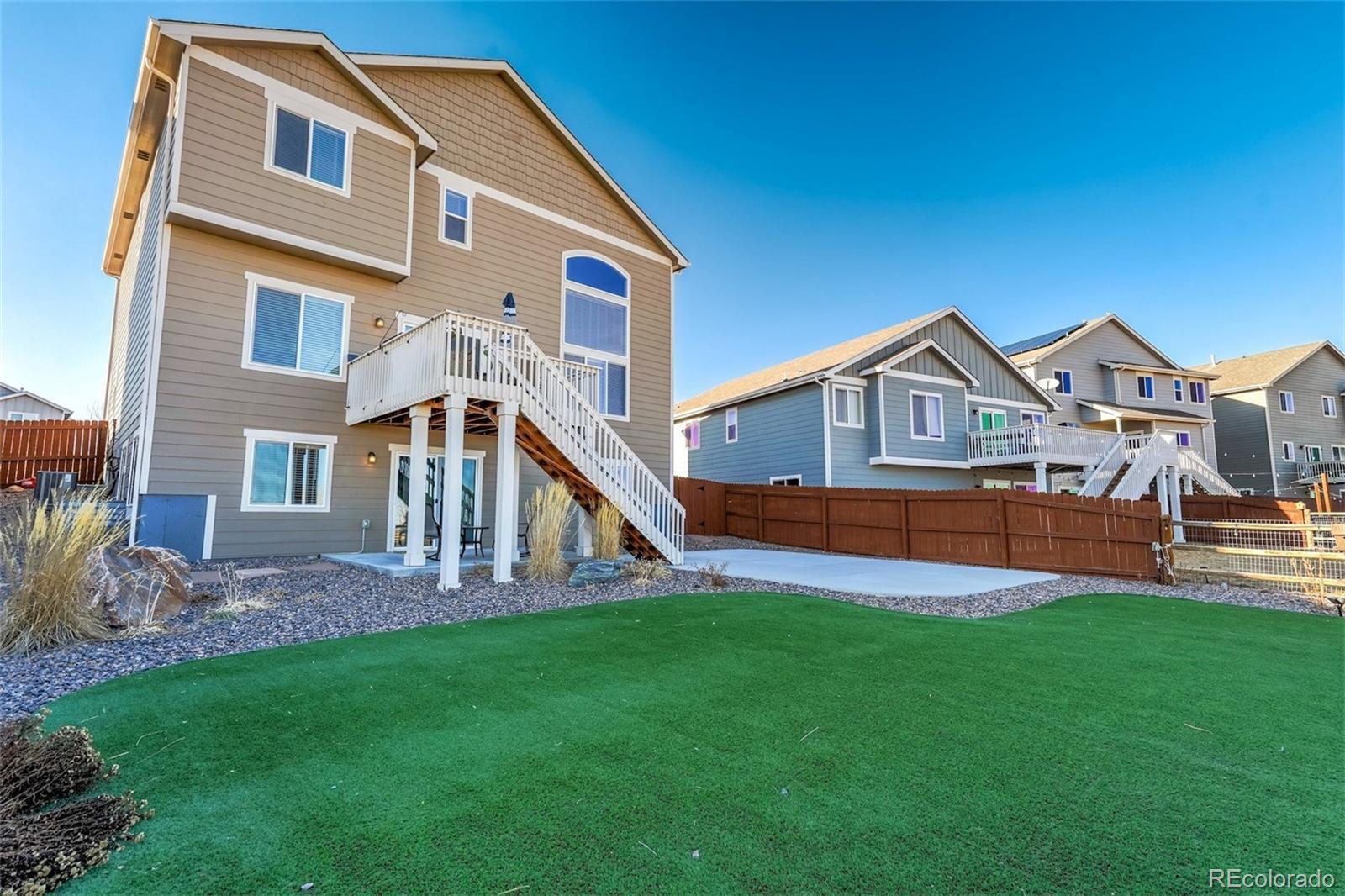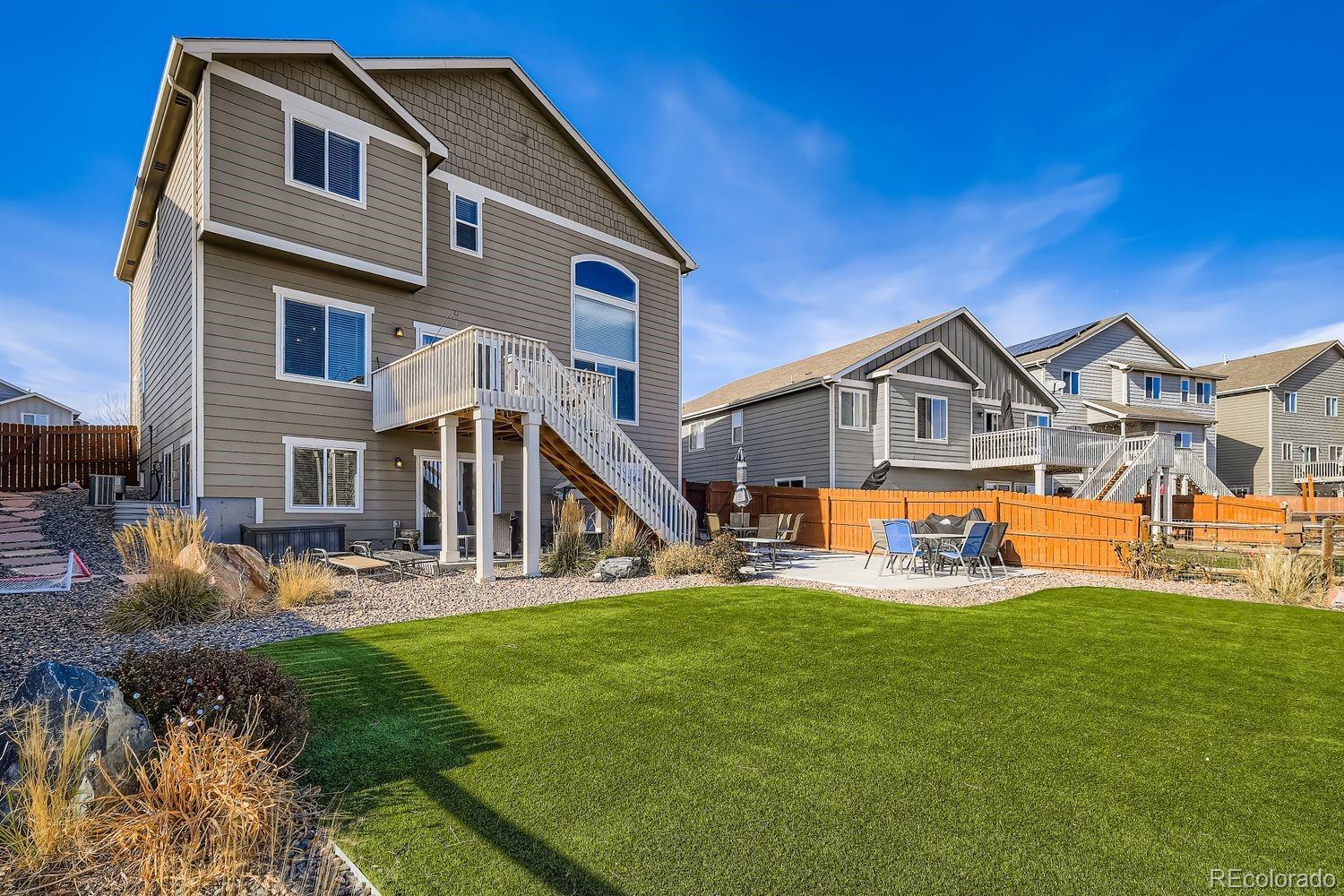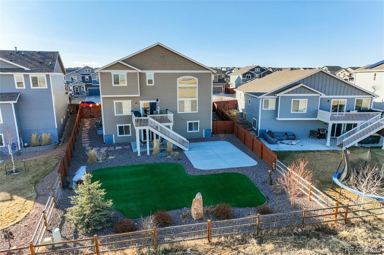 Welcome to this two-story stunner nestled in the highly sought-after Vistas at Meridian Ranch community! This spacious 5-bedroom, 3.5-bath home offers the perfect blend of style, comfort, and functionality. Step inside to find soaring ceilings that fill the main living area with natural light, creating an open and inviting atmosphere. A beautiful office or library overlooks the living room, ideal for working from home or quiet reading time. The walk-out basement is bright and airy, offering endless possibilities for entertaining, a media room, or guest quarters. Outdoors, enjoy low-maintenance turf, extra concrete patio space, and a new shed—providing ample room for recreation, gatherings, and storage. Relax on your Trex deck, taking in the Colorado sunshine and peaceful surroundings of this well-established neighborhood. Don’t miss the opportunity to own this remarkable home that perfectly combines modern upgrades with timeless design—all within easy reach of Meridian Ranch amenities, top-rated schools, trails, and parks.