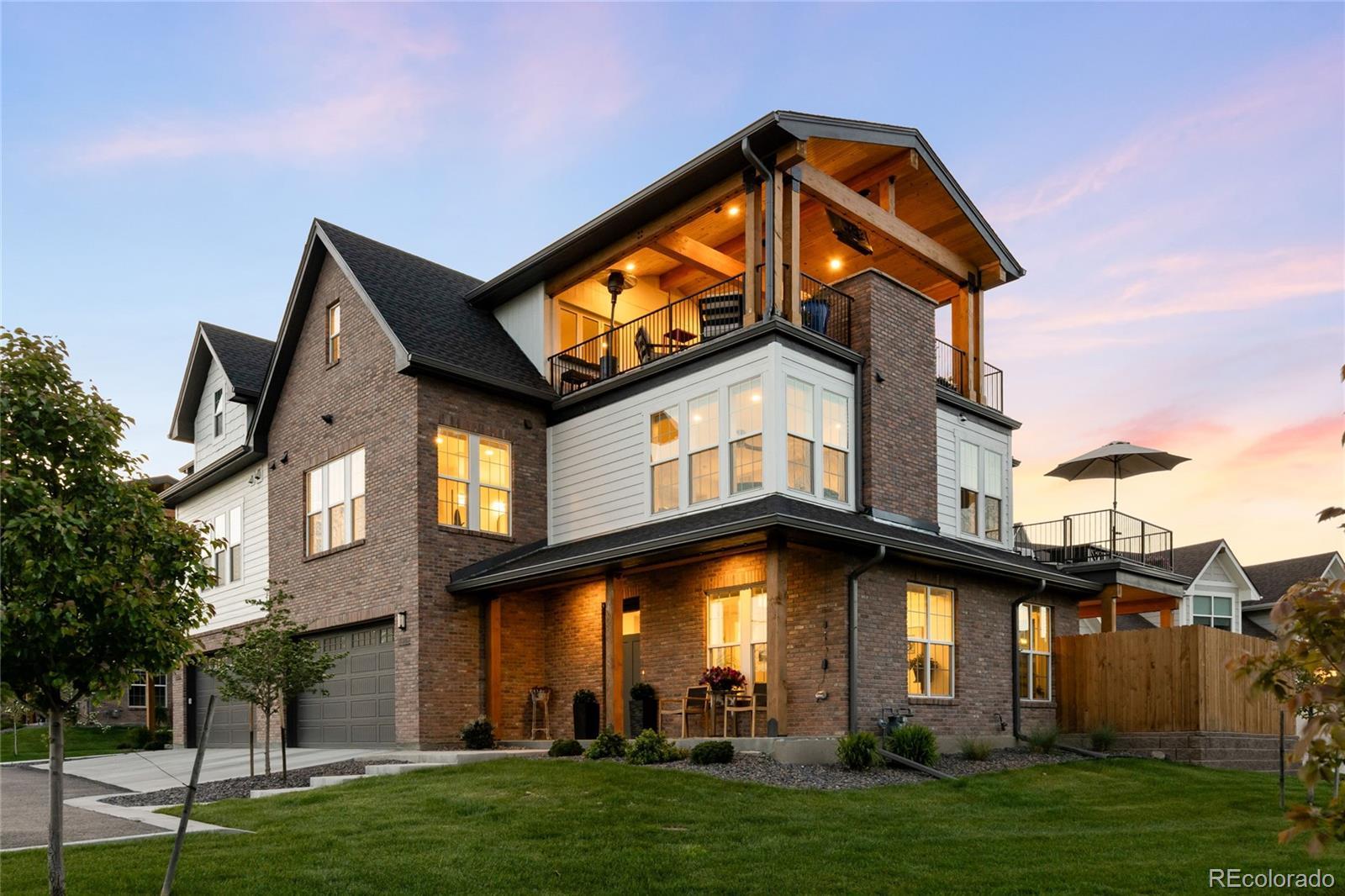 Perched atop a scenic hillside in Hillside Cottages, this model home masterpiece is crafted by esteemed local builder Royal Oak Homes. With unobstructed mountain and city views, this residence is a showcase of elevated living, filled with natural light and refined finishes. The south/east-facing corner lot enjoys premium end placement and privacy. Inside, 8-foot solid core doors, wide-plank engineered hardwoods and designer touches define every space. The gourmet kitchen impresses with Café stainless appliances, a pot filler, vented hood, floating shelves and a statement island. A fenced yard and a covered patio extend off the main level, which also hosts a living room with a sleek fireplace, private office and mudroom area adjacent to the 2-car garage. The sun-drenched primary suite offers a private balcony, spa-like bath and a custom closet. A top-level bonus room with a wet bar opens to an expansive rooftop deck with a fireplace — perfect for relaxing amid panoramic Colorado views.