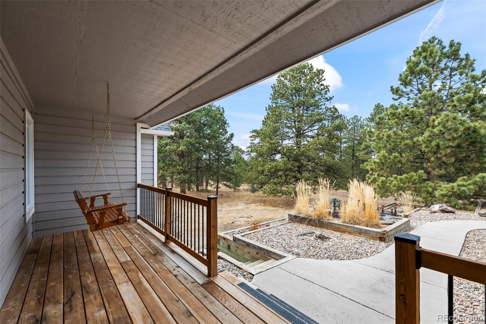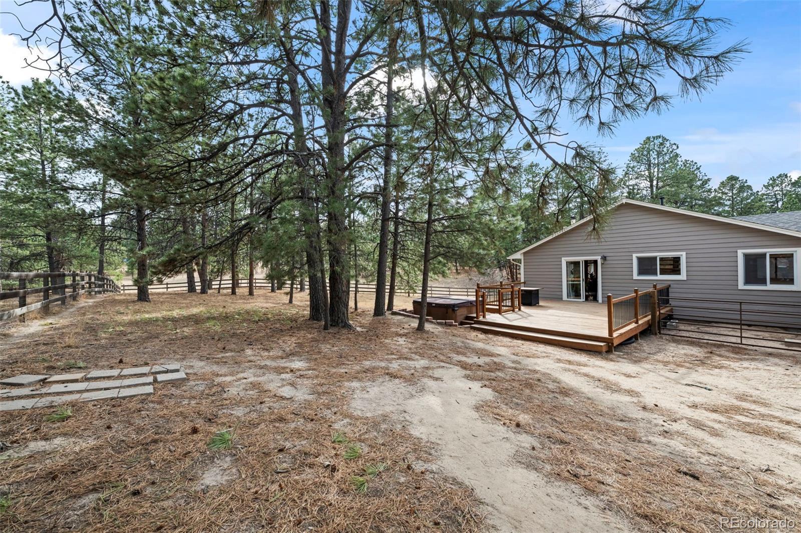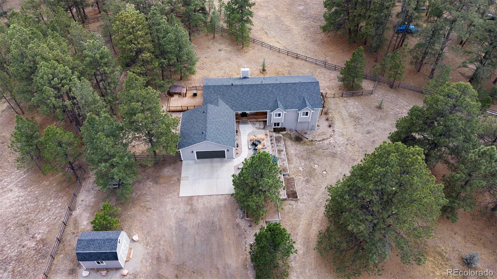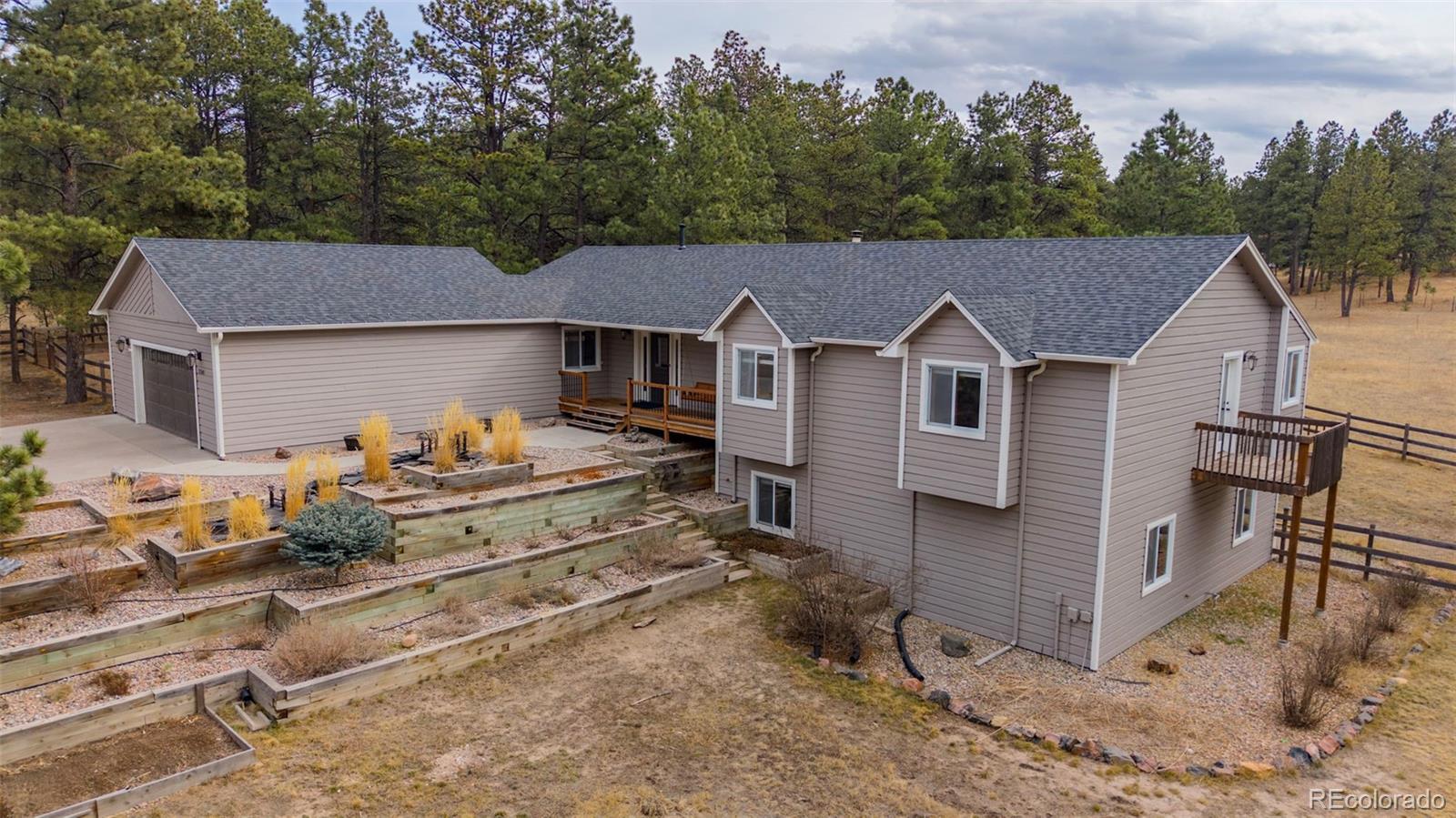 Beautifully updated ranch home with a finished walk-out basement on 2.91 acres of land. There is a trail system that runs throughout the entire area, offering scenic views and a true Colorado lifestyle right out your back door. The property feels private and removed, yet it’s just minutes from main roads with easy access. This well-cared-for home offers the luxury of country living while still being close to everything you need — plus it’s located in a highly desirable school system. The main level features a bright great room with vaulted ceilings and a stone-surround fireplace, along with a gourmet eat-in kitchen complete with a large center island, granite counters, gas cooktop, and stainless steel appliances. The primary suite offers vaulted ceilings, access to the outdoor deck, a walk-in closet, and an updated 5-piece en-suite bath with tile flooring, quartz counters, updated vanity, and a walk-in shower with rainfall showerhead. Two additional bedrooms and a full bath with tile flooring and a shower/tub combo complete the main floor. Interior areas have been refreshed with newer paint. The finished basement expands the living space with a large living room featuring walk-out access to the backyard, a flex/bonus room with wet bar, dedicated gym space, two additional bedrooms, and a full bathroom with a shower/tub combo. The basement carpet has been recently replaced. Step outside to enjoy the peaceful setting from the spacious deck — the perfect place to relax, entertain, or take in the serene surroundings. The yard features a beautiful koi pond, views, and plenty of room to roam. A storage shed provides added functionality and extra storage space. Exterior updates include paint, roof, and gutters, adding to the home’s overall value and curb appeal. Don't miss out on the peace, privacy, updates, and accessibility this exceptional property provides.
