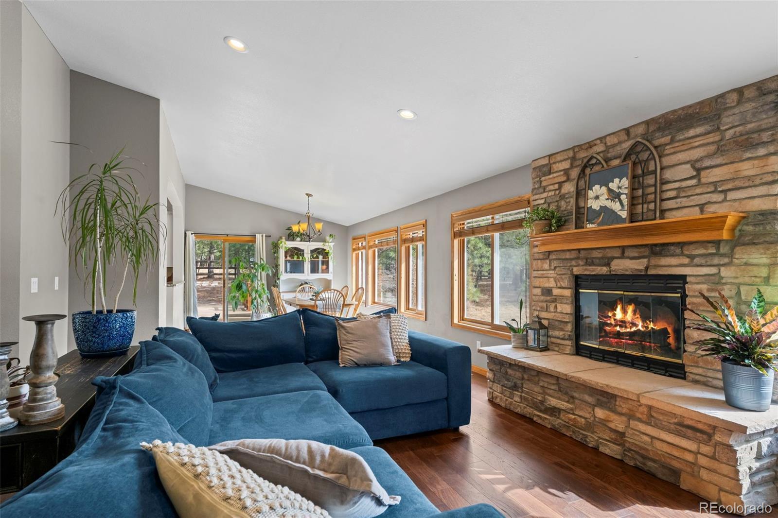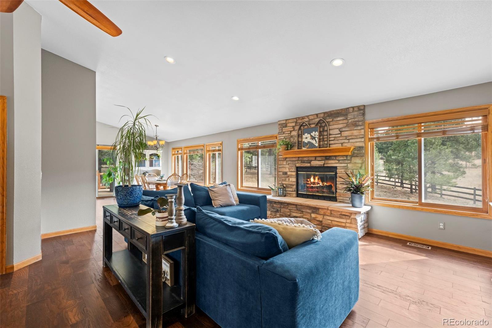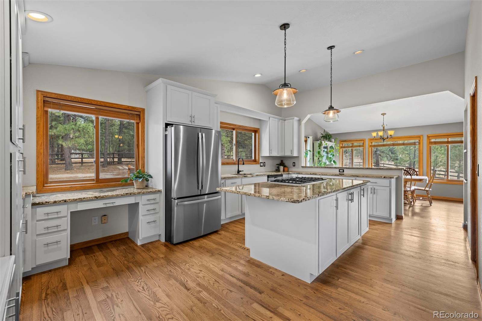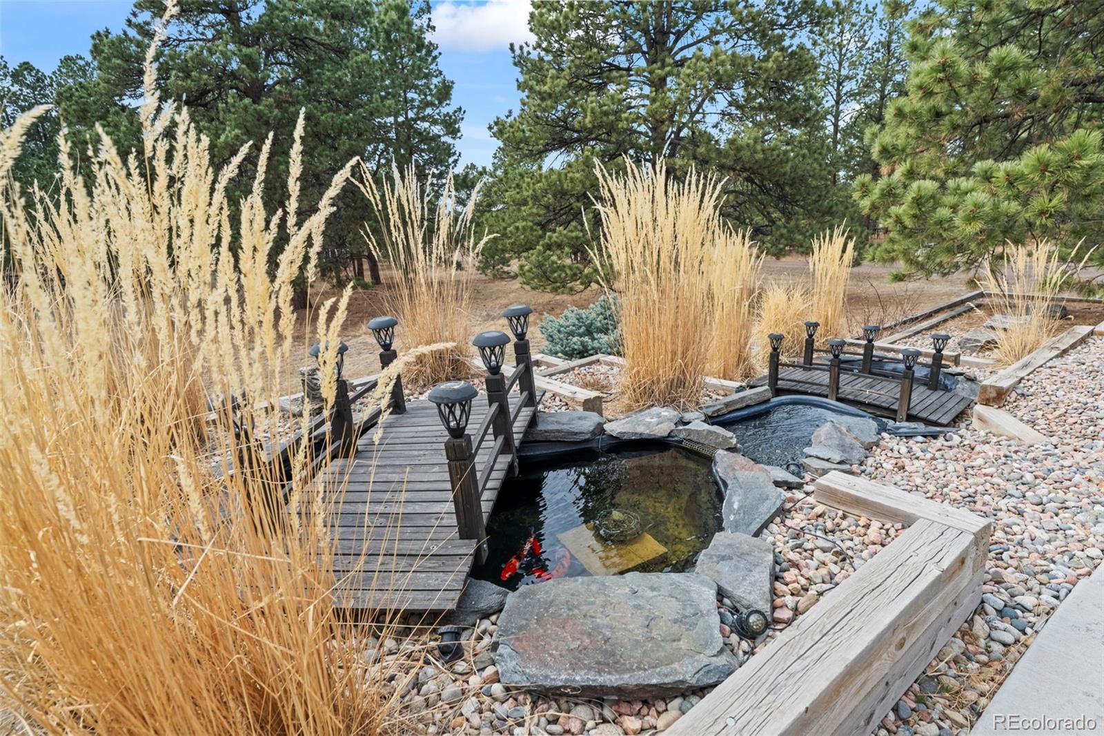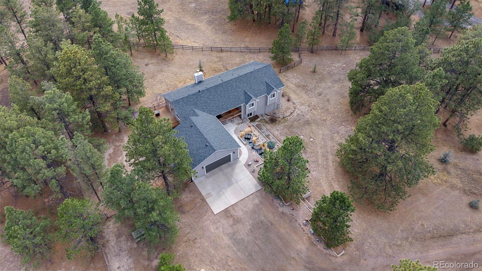 Beautifully updated ranch home with a finished walk-out basement on 2.91 acres of land. There is a trail system that runs throughout the entire area, offering scenic views and a true Colorado lifestyle right out your back door. The property feels private and removed, yet it’s just minutes from main roads with easy access. This well-cared-for home offers the luxury of country living while still being close to everything you need — plus it’s located in a highly desirable school system. The main level features a bright great room with vaulted ceilings and a stone-surround fireplace, along with a gourmet eat-in kitchen complete with a large center island, granite counters, gas cooktop, and stainless steel appliances. The primary suite offers vaulted ceilings, access to the outdoor deck, a walk-in closet, and an updated 5-piece en-suite bath with tile flooring, quartz counters, updated vanity, and a walk-in shower with rainfall showerhead. Two additional bedrooms and a full bath with tile flooring and a shower/tub combo complete the main floor. Interior areas have been refreshed with newer paint. The finished basement expands the living space with a large living room featuring walk-out access to the backyard, a flex/bonus room with wet bar, dedicated gym space, two additional bedrooms, and a full bathroom with a shower/tub combo. The basement carpet has been recently replaced. Step outside to enjoy the peaceful setting from the spacious deck — the perfect place to relax, entertain, or take in the serene surroundings. The yard features a beautiful koi pond, views, and plenty of room to roam. A storage shed provides added functionality and extra storage space. Exterior updates include paint, roof, and gutters, adding to the home’s overall value and curb appeal. Don't miss out on the peace, privacy, updates, and accessibility this exceptional property provides.