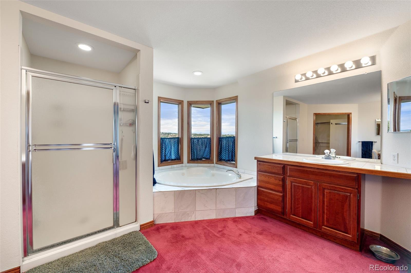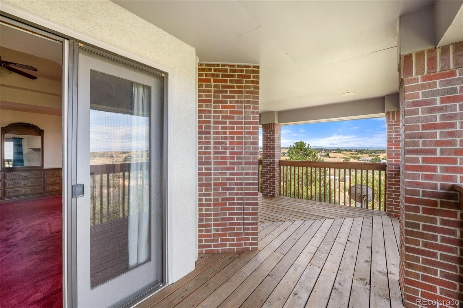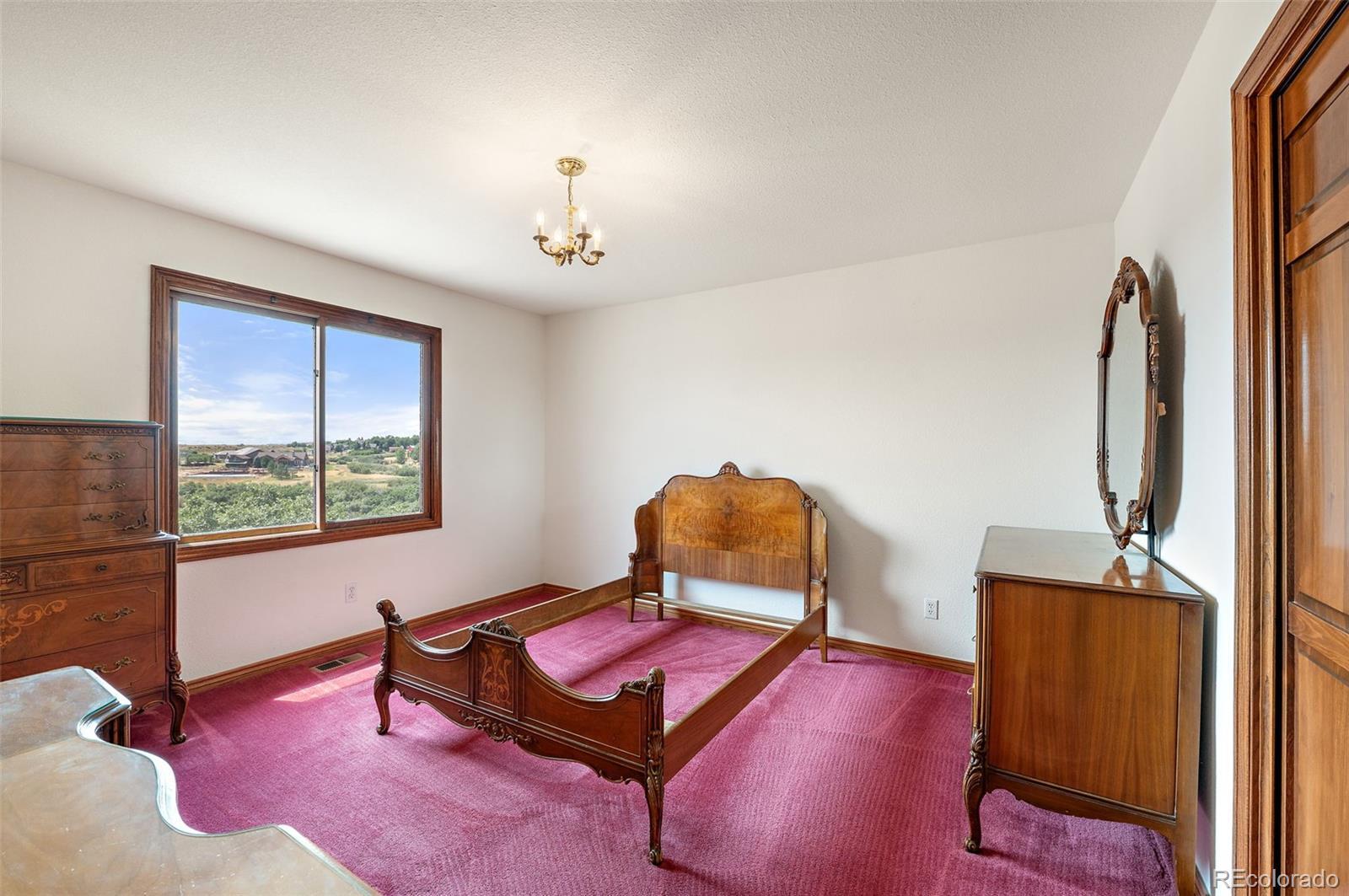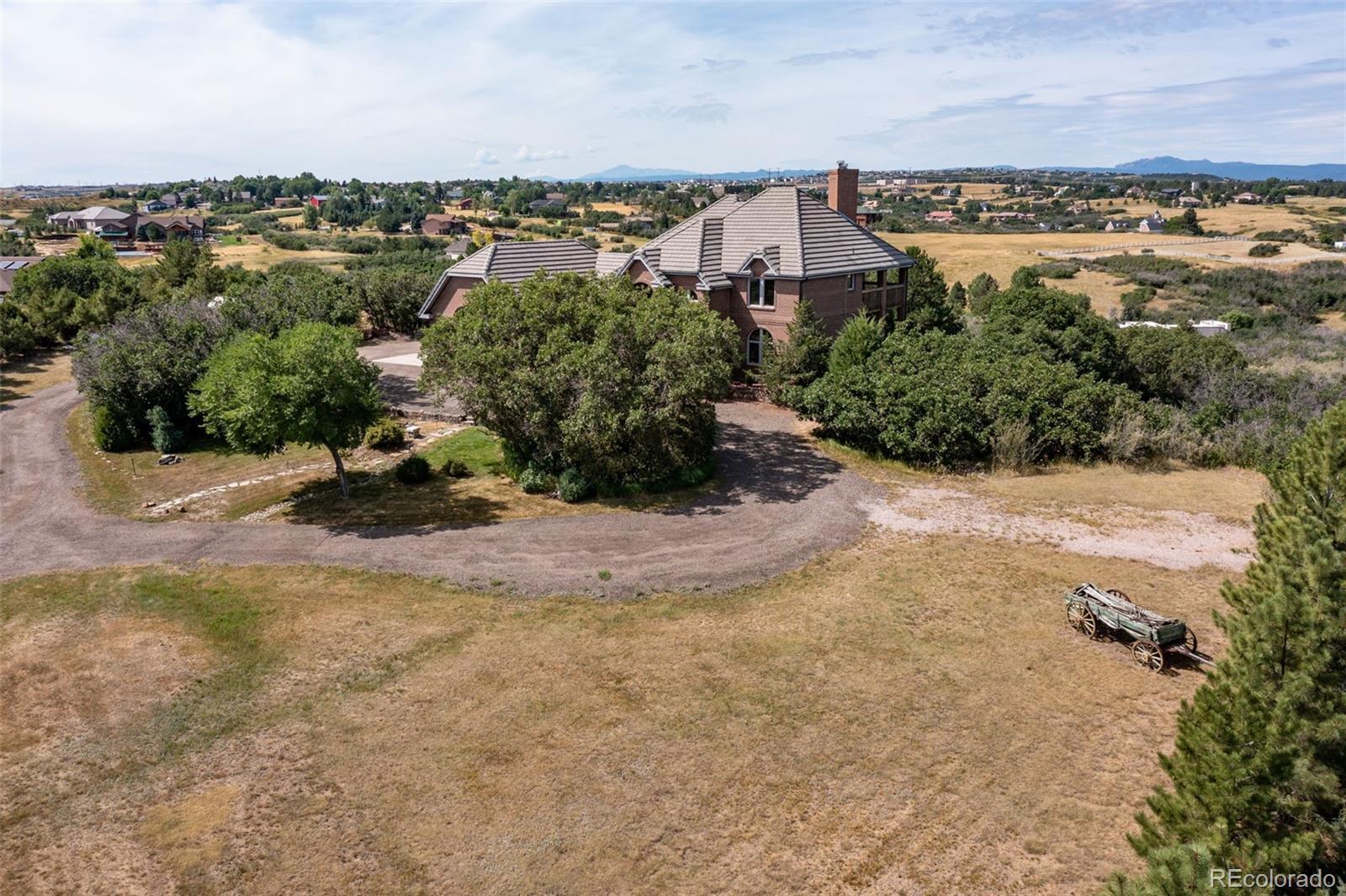 Gorgeous red brick home with 3 Bedrooms and 3.5 bathrooms on 5 acres with views of Pikes Peak to Longs Peak just south of DTC. This home offers a remote private feel just outside conveniences of the city. The main living area offers kitchen with walk in pantry, and large eat in area with views of the mountains that connects to a covered patio. In addition, there is a family room, formal dining and living room with fireplace, half bath, and laundry room. The second level includes 3 bedrooms all of which have their own bathrooms - Yes, 3 en-suite bedrooms. The primary bedroom includes a 5 piece en-suite with huge walk in closet and fireplace. From the primary bedroom, walk out to the covered deck to enjoy relaxing views and sunsets over Pikes Peak to Longs peak. Large front patio facing east to enjoy eating outside in the shade. This property is surrounded by Oak sage, and <150> Ponderosa pine and Juniper trees that were planted 25+ years ago. Expect regular visits from the local wildlife as well. The 3 car garage offers a work shop area, car lift in one bay, hard air lines plumbed throughout the garage and to basement, and drains in the floor. There is plenty of space on the property to park boats, RV’s, trailers, etc… The 1800 sq ft walk out basements awaits your design to make it your own getaway. Additional upgrades include: Central vacuum system, complete sprinkler and drip system, water softener, cement tile roofing, and available chimney stack in basement. Property is about 5 minutes to Castle Village shopping and dining, and a short commute to DTC.