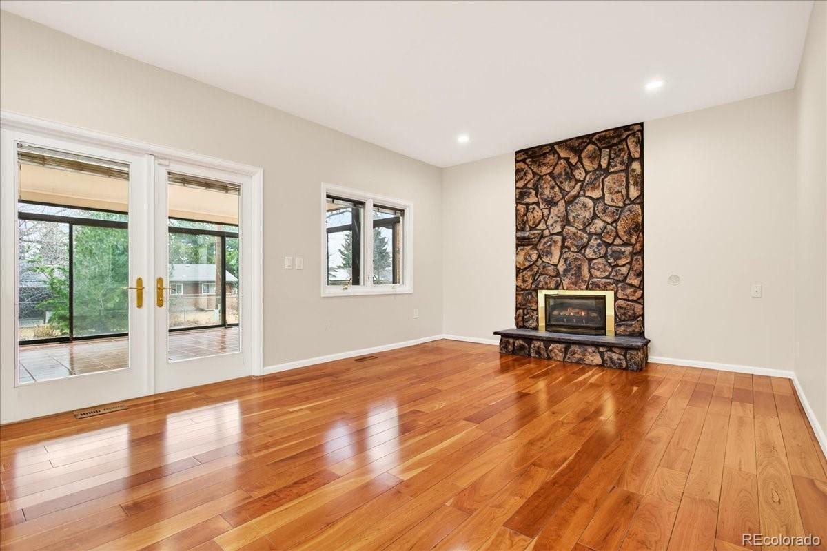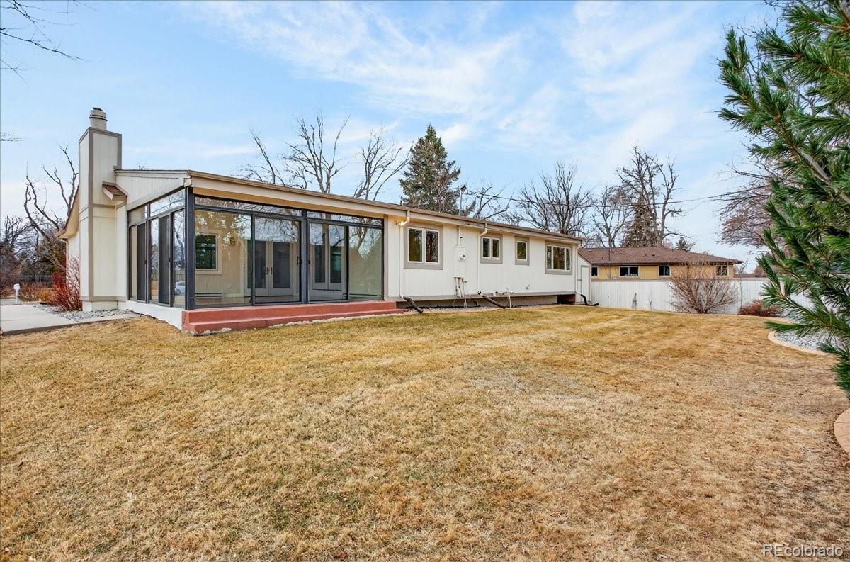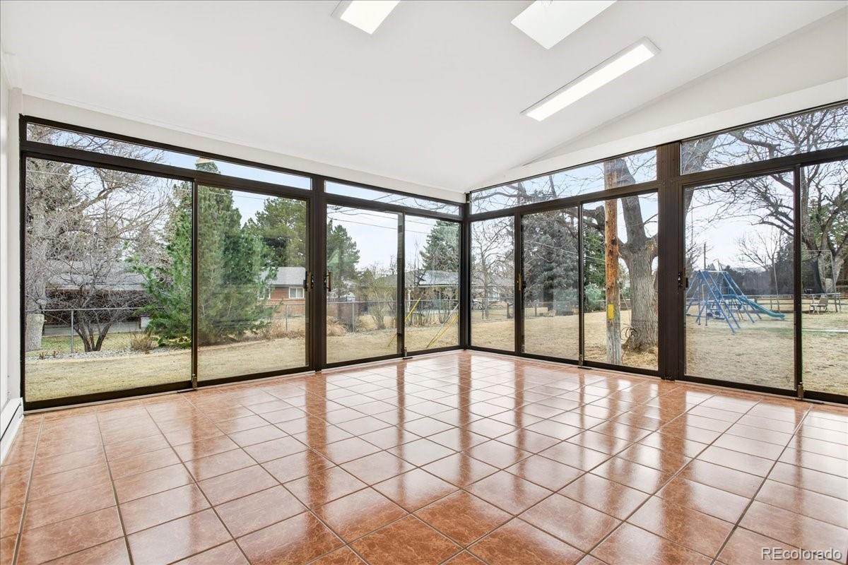 EXCELLENT 4 BED/3 BATH RANCH HOME IN WALNUT HILLS IN THE DESIRABLE CHERRY CREEK SCHOOL DISTRICT! Enjoy an ideal location close to trails & parks, Dry Creek shopping including Tony's Market, walking distance to the elementary/middle schools. This diligently maintained home is highly energy efficient featuring a solar powered water heater, on demand water, Trane 94% efficient furnace/AC, triple pane Pella windows. Inside, you'll find a bright open floorplan with the convenience of single-level living. Notice the premium cherrywood flooring, abundant natural light streaming from seven oversized skylights, three fitted with custom shades. The chef-inspired kitchen overlooks the backyard and showcases new appliances including a 5-burner gas range, large Corian island/counters, cherry cabinets, large pantry & built-in desk. Host great parties in the spacious sunroom with all new glass doors opening to the backyard, the perfect setting for year-round entertaining. The formal dining area includes an expansive granite serving counter with generous storage. Adjacent is the family room with gas fireplace. The sunny living room features a bay window. You'll love the oversized main floor primary suite with walk-in closet & 3/4 bath with dual vanity. The secondary bedrooms feature custom Murphy beds with coordinating desks & cabinetry to maximize the space. The main floor guest bath offers a jetted tub. There is newer carpeting in all bedrooms and throughout the finished basement which provides additional living space: ample rec/entertainment room, bedroom, 3/4 bath & storage room. You have a utility shed with skylight, garage with epoxy coated floors & extensive storage. The backyard is low maintenance with mature landscaping & full sprinkler system. A wide street provides ample parking, and you're welcomed by a friendly neighborhood. Nearby parks include Hunters Hill Park, Walnut Hills & Willow Creek Park. So many reasons to make this great home yours!