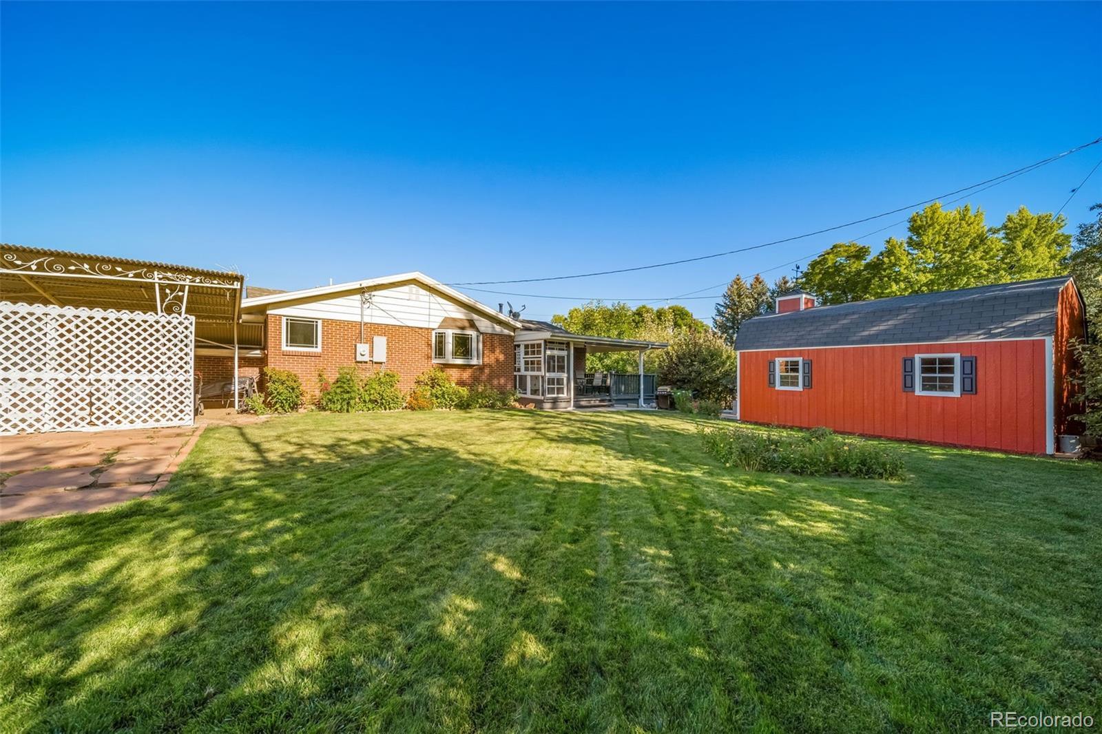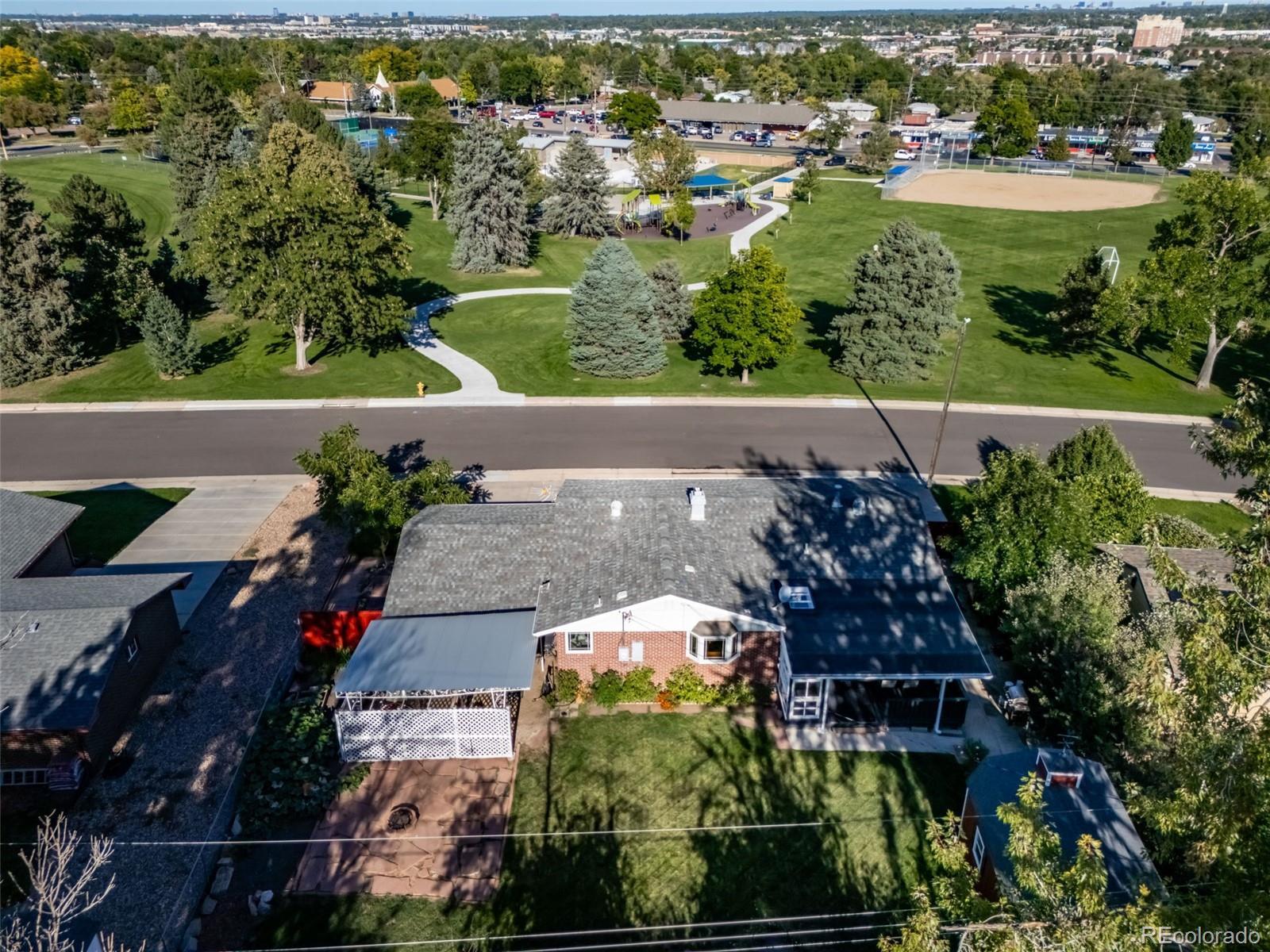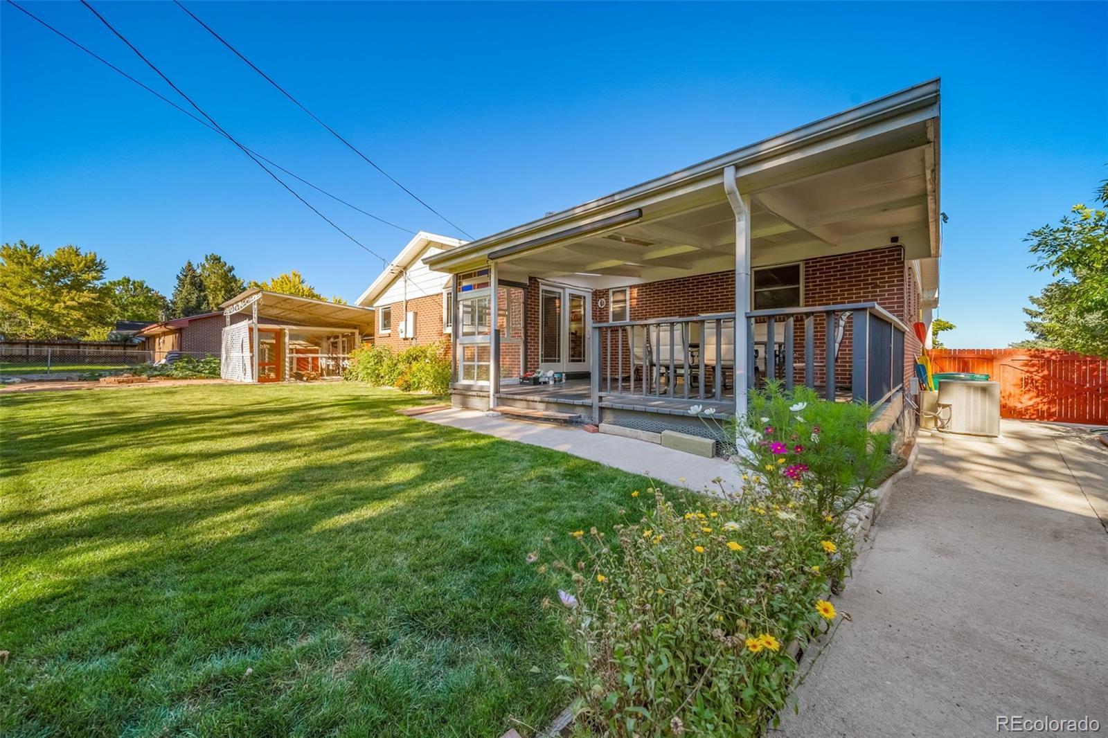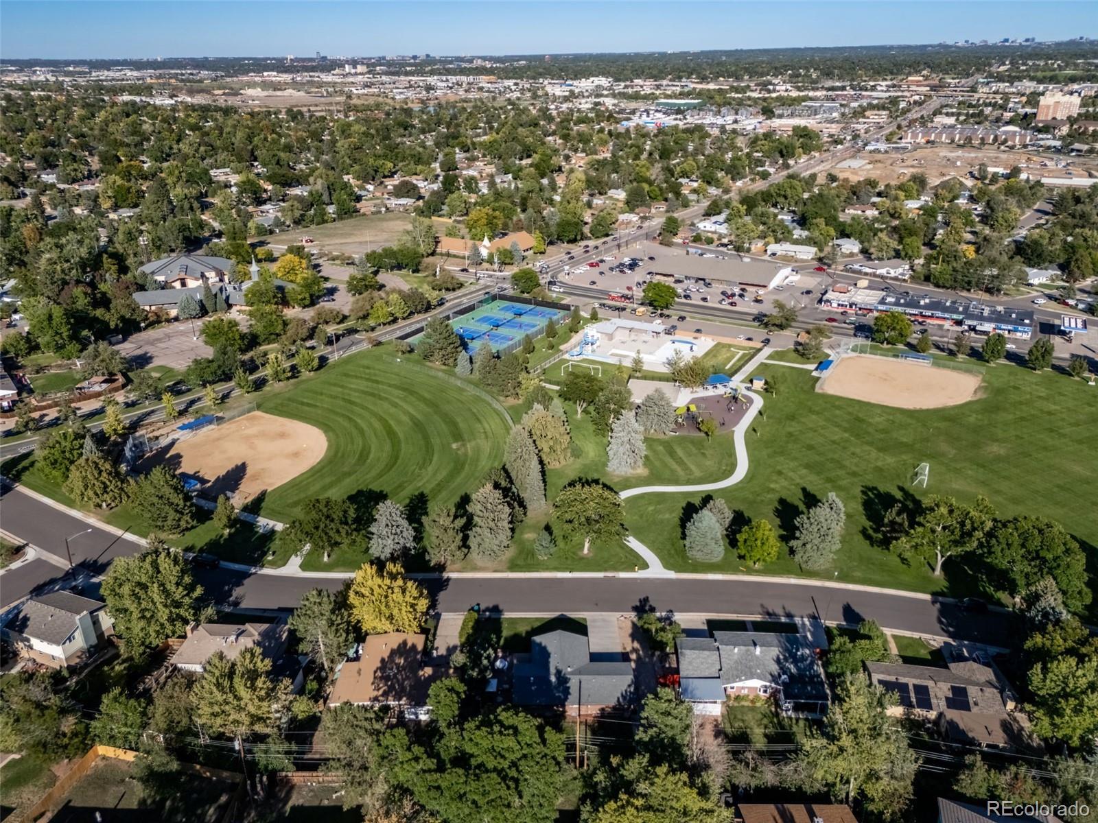 Location! Location ! Location ! Situated across from an incredible park with baseball and soccer fields, tennis court, and South Suburban District swimming pool, country club living without the fees and expense. Welcome home to this elegant and wonderful, solid brick bi- level home with tremendous street appeal with six columns adorning the front porch. With an abundance of natural light, this beautiful bright home is extremely open and inviting with wonderful living spaces inside and outside for family, friends and entertaining. Upon entry you will be welcomed into the spacious living room open to the kitchen which opens to the dining room with woodburning fireplace. The primary suite with half bath and another spacious bedroom and full bath complete the upper level. On the lower level, there are two very generous bedrooms and a spacious family room/media room. Relax and unwind on your covered and shaded spacious deck which overlooks the large fenced backyard with a 20 x 12 shed for hobbies, workshop and toys. Enjoy your garden area and additional covered area with chicken coop. Lots of parking space with the attached oversized two car garage, two driveways and additional room for RV and storage. Lots of room for toys, ideal for a contractor. This fabulous location is close to shopping, dining and downtown Littleton with light rail and many upscale restaurants.