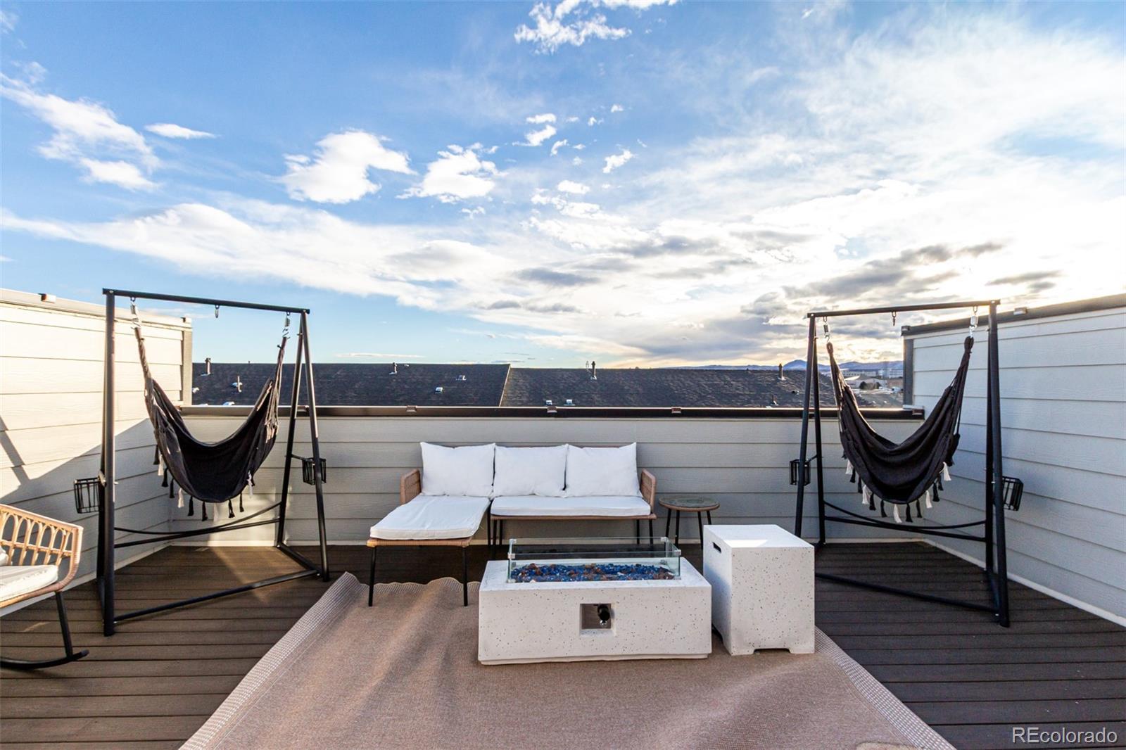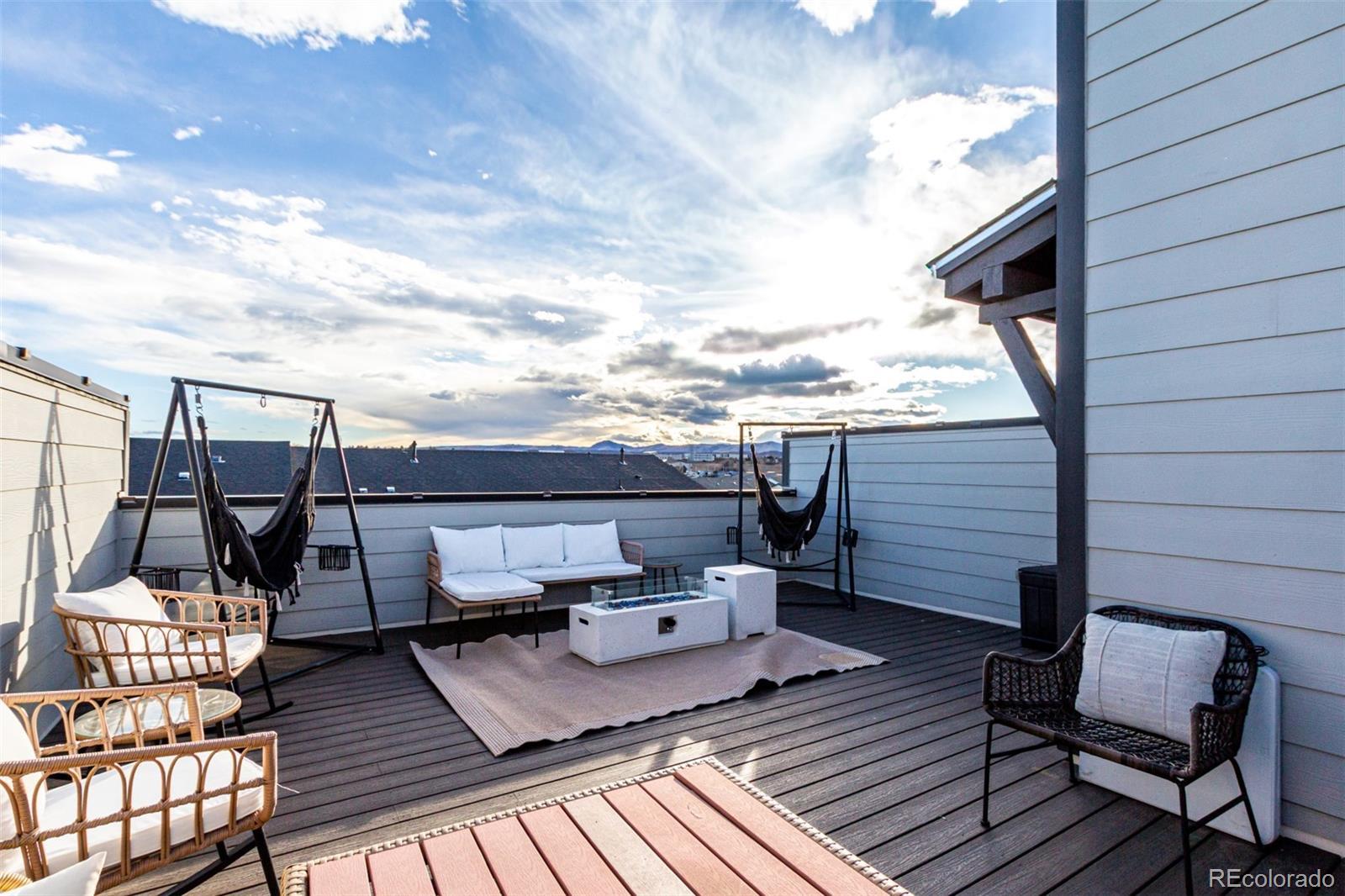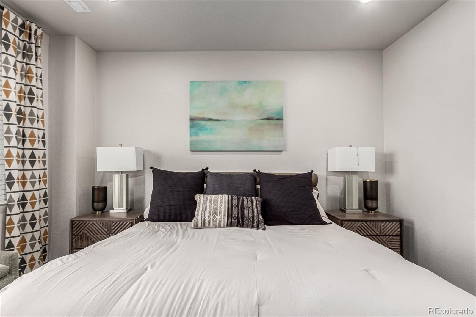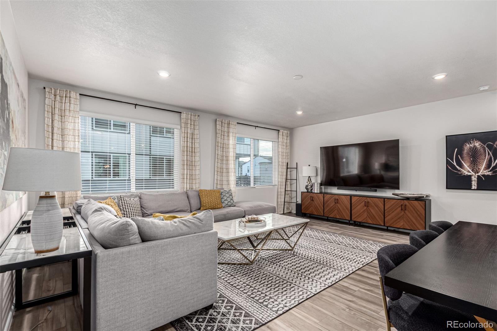 Beautifully designed and ideally located, this former model townhome offers refined living in one of Arvada’s most convenient locations. Located just minutes from the charm of Olde Town Arvada and the light rail for an easy commute into Denver, this home blends modern design with an unbeatable location. The open kitchen features crisp white cabinetry, a large granite island, stainless steel appliances, and two generous pantries, perfect for everyday living and entertaining! Just off the kitchen, a covered balcony provides a comfortable outdoor extension of the space. The main living area is bright and inviting with high ceilings, expansive windows, and upgraded lighting and technology throughout. On the main level, a versatile bonus room with a private en suite bathroom offers flexibility to suit your lifestyle, ideal as a non-conforming bedroom, home office, gym, guest space or whatever your heart desires! The primary suite is thoughtfully designed with the convenience of a dedicated laundry room located just steps away, making daily routines effortless. Clean lines and intentional design carry throughout the home, creating a timeless, contemporary feel. The best part, a private and large rooftop deck crowns the residence, offering space to unwind, entertain, or enjoy Colorado sunsets and mountain views. Energy-efficient construction and low-maintenance living complete the experience!
