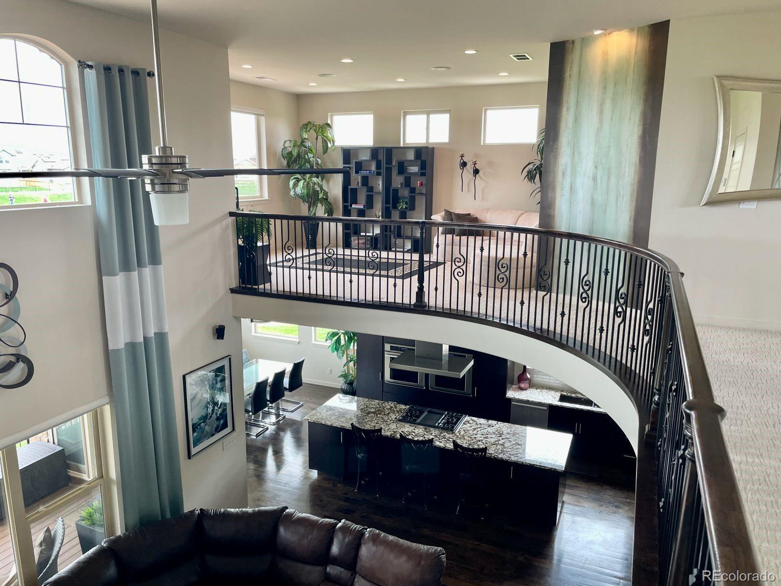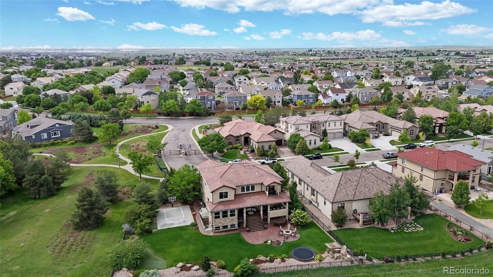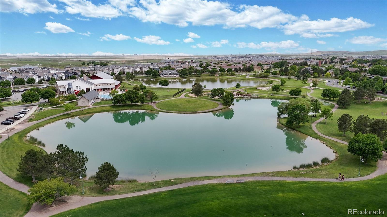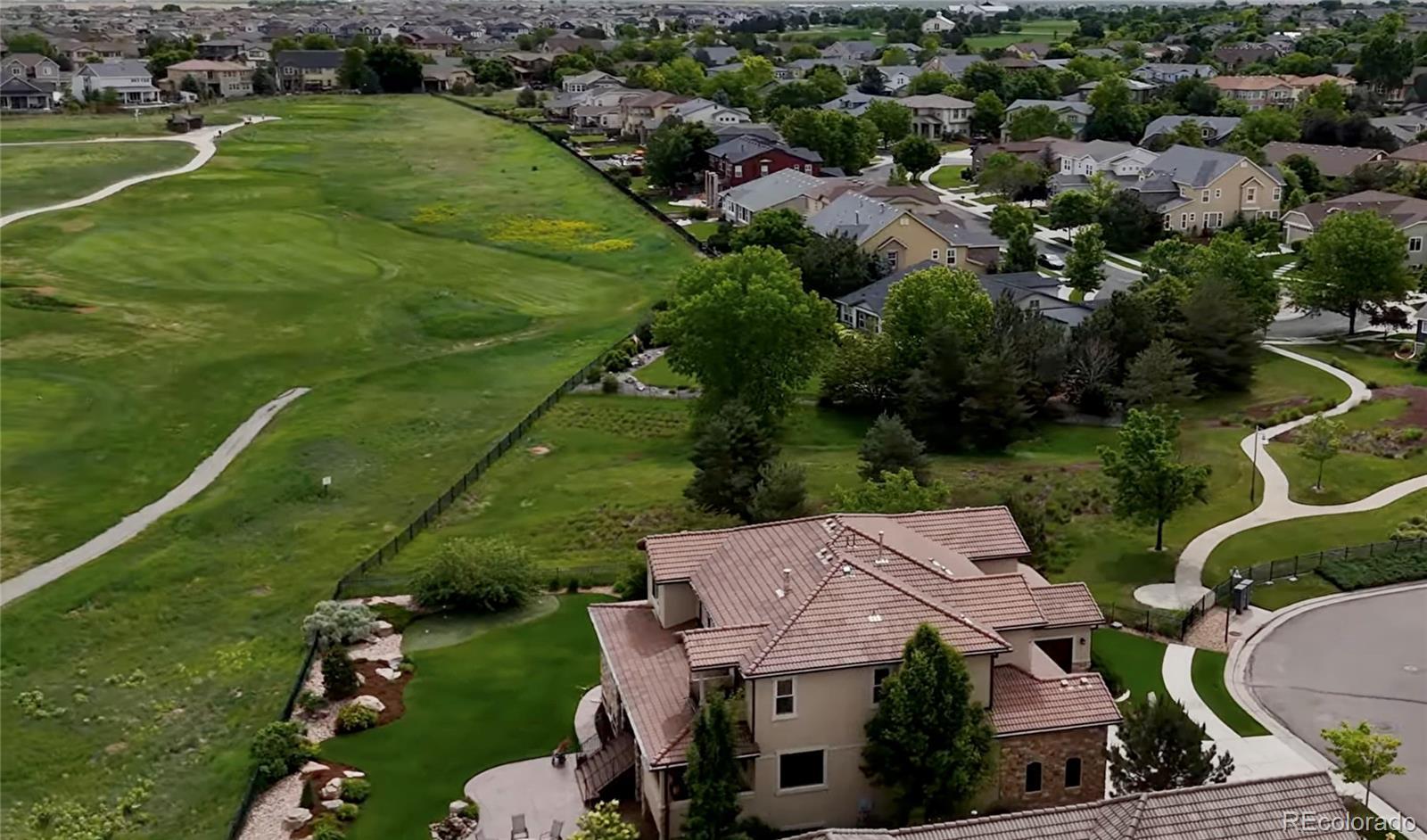 Presenting a one-of-a-kind custom home within The Gallery at Reunion (a premier gated community) situated on a 15,715 sf end lot on the 14th green of Buffalo Run golf course. Enjoy stunning views of the greenbelt, golf course, Rocky Mountains and Colorado sunsets. Step inside to contemporary elegance, featuring a double radius staircase, artist-painted accent walls, Corbett Vertigo lighting, arched doorways, rich wood banisters, hand trowel wall texture, HD Silhouette window coverings, and 20' vaulted family room with a dramatic 3-D tile accent wall and 62" linear fireplace. Connect over meals prepared in a gourmet kitchen with massive granite center island, custom floor-to-ceiling cabinetry, Thermador appliances (including double ovens and gas stove w/griddle), 2 full-sized refrigerators, walk-in pantry, whole-house water purification system, butler/wine nook and expansive kitchen dining area with picturesque views. Ignite outdoor family fun with an underground trampoline, gas-line fire pit, putting green, horseshoe pit and basketball court with Mega Slam 60 adjustable hoop. Relax under the 35'x12' covered patio with ceiling fans, speakers, concrete bar top and gas grill, alongside a tranquil water feature, professional landscaping and stamped concrete patios. Engage in indoor recreation in the garden-level basement accessible by indoor and outdoor stairway. Basement includes gaming area, exercise room (convertible to a bedroom), kitchenette and high-end home theater, featuring 4K Pro Cinema Laser Projector, Black Diamond 100" screen, built-in surround sound, 3 rows of movie seating and Elan (now Nice) control system for lights, automation and whole-home audio. Retreat to one of three large secondary bedrooms, or the Primary bedroom suite with balcony, coffee nook, custom closet and dual spa shower towers. Experience Reunion amenities: recreation center, pools, coffee shop, parks, trails, lakes and community events. Discover the lifestyle you've always dreamed of!
