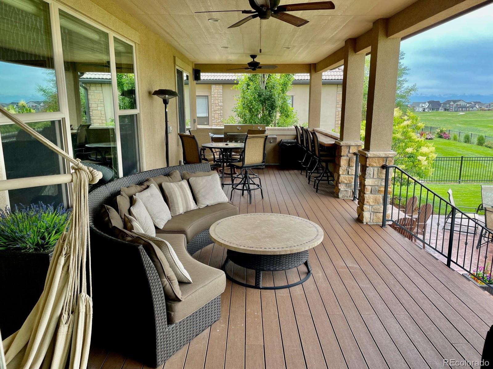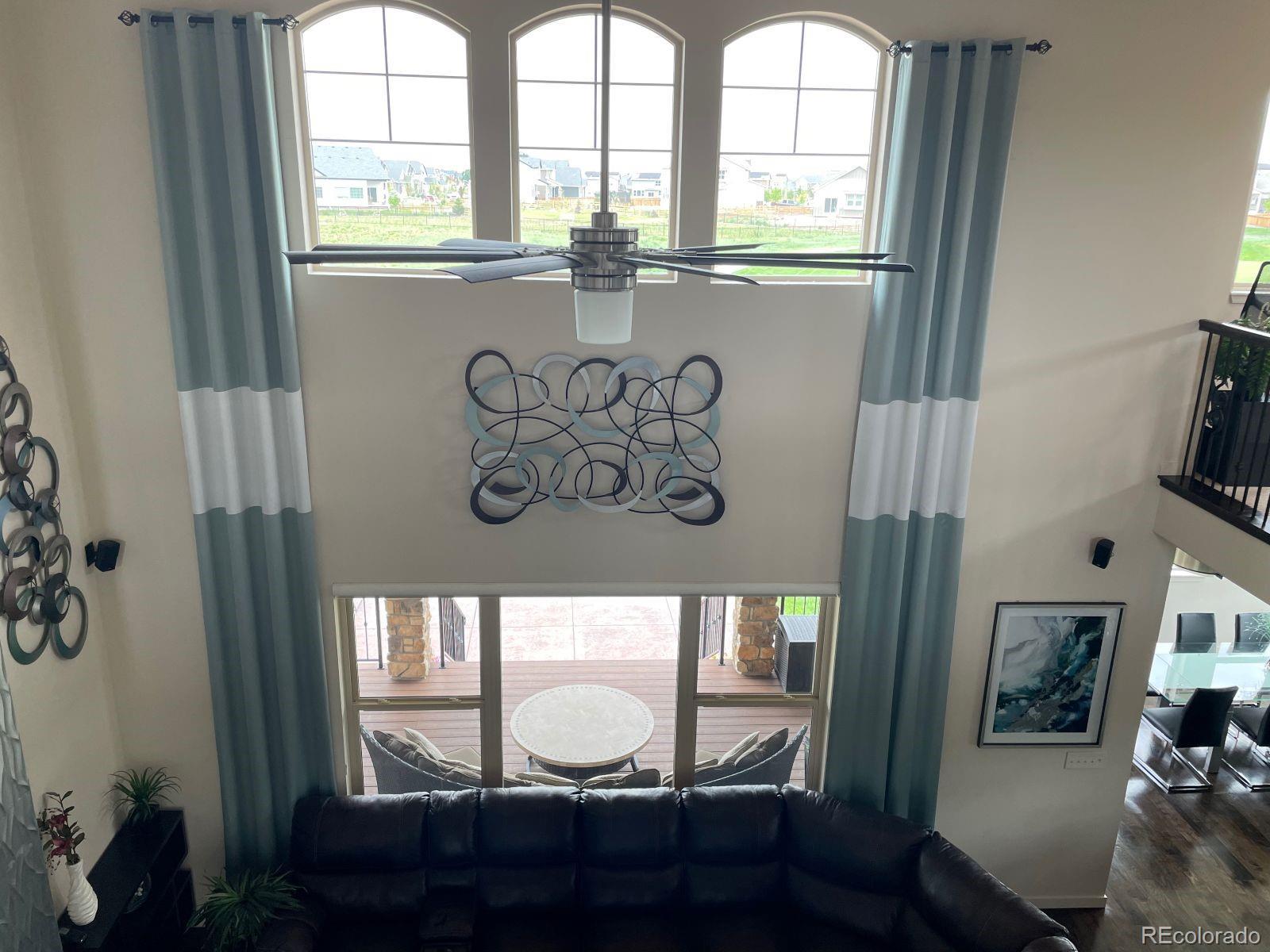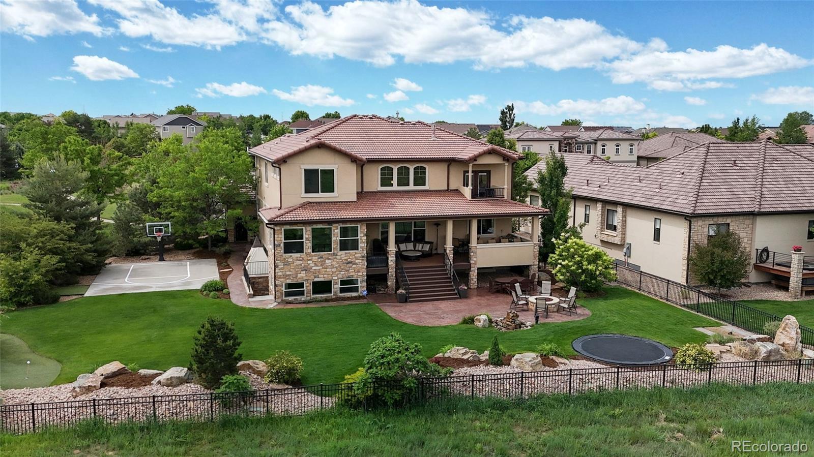Presenting a one-of-a-kind custom home within The Gallery at Reunion (a premier gated community) situated on a 15,715 sf end lot on the 14th green of Buffalo Run golf course. Enjoy stunning views of the greenbelt, golf course, Rocky Mountains and Colorado sunsets. Step inside to contemporary elegance, featuring a double radius staircase, artist-painted accent walls, Corbett Vertigo lighting, arched doorways, rich wood banisters, hand trowel wall texture, HD Silhouette window coverings, and 20' vaulted family room with a dramatic 3-D tile accent wall and 62" linear fireplace. Connect over meals prepared in a gourmet kitchen with massive granite center island, custom floor-to-ceiling cabinetry, Thermador appliances (including double ovens and gas stove w/griddle), 2 full-sized refrigerators, walk-in pantry, whole-house water purification system, butler/wine nook and expansive kitchen dining area with picturesque views. Ignite outdoor family fun with an underground trampoline, gas-line fire pit, putting green, horseshoe pit and basketball court with Mega Slam 60 adjustable hoop. Relax under the 35'x12' covered patio with ceiling fans, speakers, concrete bar top and gas grill, alongside a tranquil water feature, professional landscaping and stamped concrete patios. Engage in indoor recreation in the garden-level basement accessible by indoor and outdoor stairway. Basement includes gaming area, exercise room (convertible to a bedroom), kitchenette and high-end home theater, featuring 4K Pro Cinema Laser Projector, Black Diamond 100" screen, built-in surround sound, 3 rows of movie seating and Elan (now Nice) control system for lights, automation and whole-home audio. Retreat to one of three large secondary bedrooms, or the Primary bedroom suite with balcony, coffee nook, custom closet and dual spa shower towers. Experience Reunion amenities: recreation center, pools, coffee shop, parks, trails, lakes and community events. Discover the lifestyle you've always dreamed of!