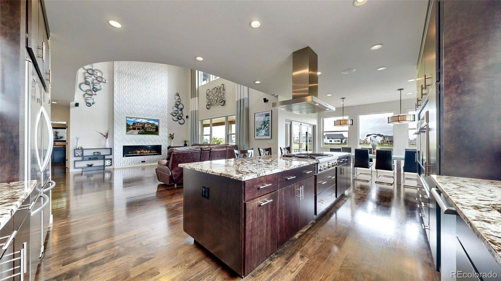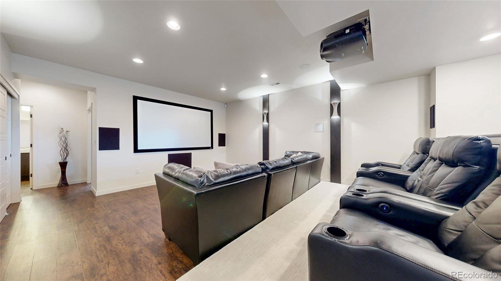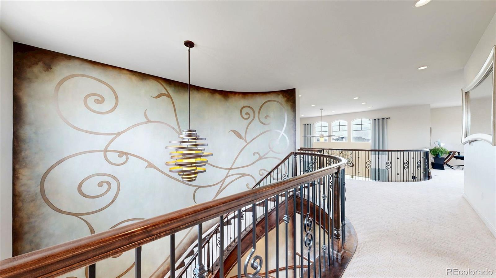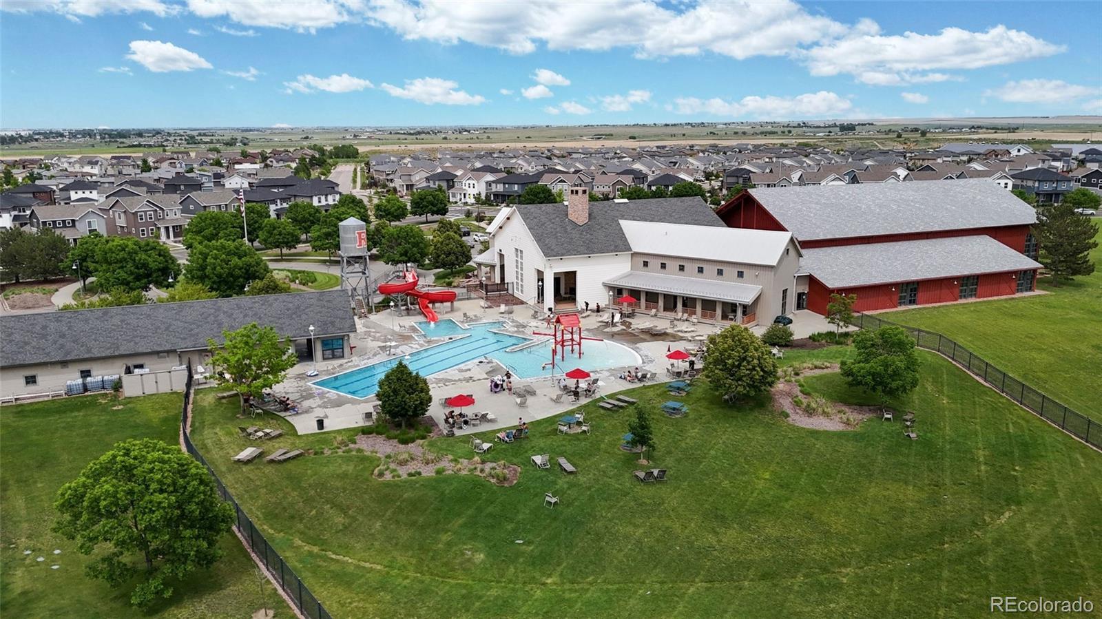 Presenting a one-of-a-kind custom home within The Gallery at Reunion (a premier gated community) situated on a 15,715 sf end lot on the 14th green of Buffalo Run golf course. Enjoy stunning views of the greenbelt, golf course, Rocky Mountains and Colorado sunsets. Step inside to contemporary elegance, featuring a double radius staircase, artist-painted accent walls, Corbett Vertigo lighting, arched doorways, rich wood banisters, hand trowel wall texture, HD Silhouette window coverings, and 20' vaulted family room with a dramatic 3-D tile accent wall and 62" linear fireplace. Connect over meals prepared in a gourmet kitchen with massive granite center island, custom floor-to-ceiling cabinetry, Thermador appliances (including double ovens and gas stove w/griddle), 2 full-sized refrigerators, walk-in pantry, whole-house water purification system, butler/wine nook and expansive kitchen dining area with picturesque views. Ignite outdoor family fun with an underground trampoline, gas-line fire pit, putting green, horseshoe pit and basketball court with Mega Slam 60 adjustable hoop. Relax under the 35'x12' covered patio with ceiling fans, speakers, concrete bar top and gas grill, alongside a tranquil water feature, professional landscaping and stamped concrete patios. Engage in indoor recreation in the garden-level basement accessible by indoor and outdoor stairway. Basement includes gaming area, exercise room (convertible to a bedroom), kitchenette and high-end home theater, featuring 4K Pro Cinema Laser Projector, Black Diamond 100" screen, built-in surround sound, 3 rows of movie seating and Elan (now Nice) control system for lights, automation and whole-home audio. Retreat to one of three large secondary bedrooms, or the Primary bedroom suite with balcony, coffee nook, custom closet and dual spa shower towers. Experience Reunion amenities: recreation center, pools, coffee shop, parks, trails, lakes and community events. Discover the lifestyle you've always dreamed of!