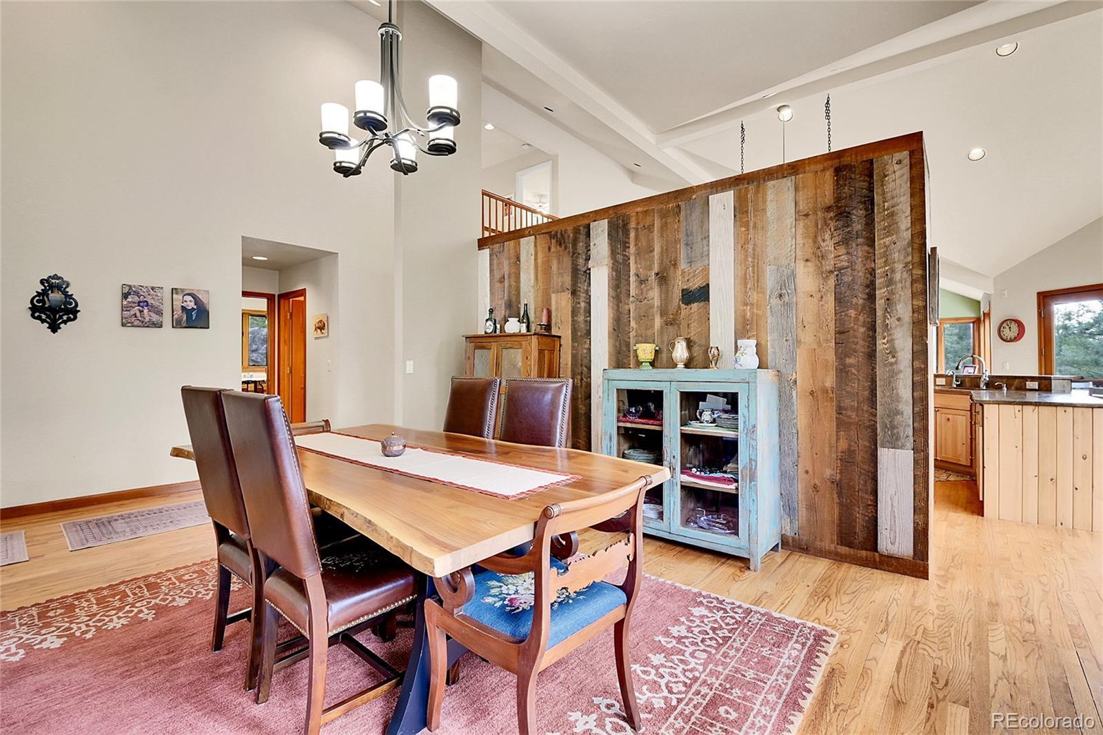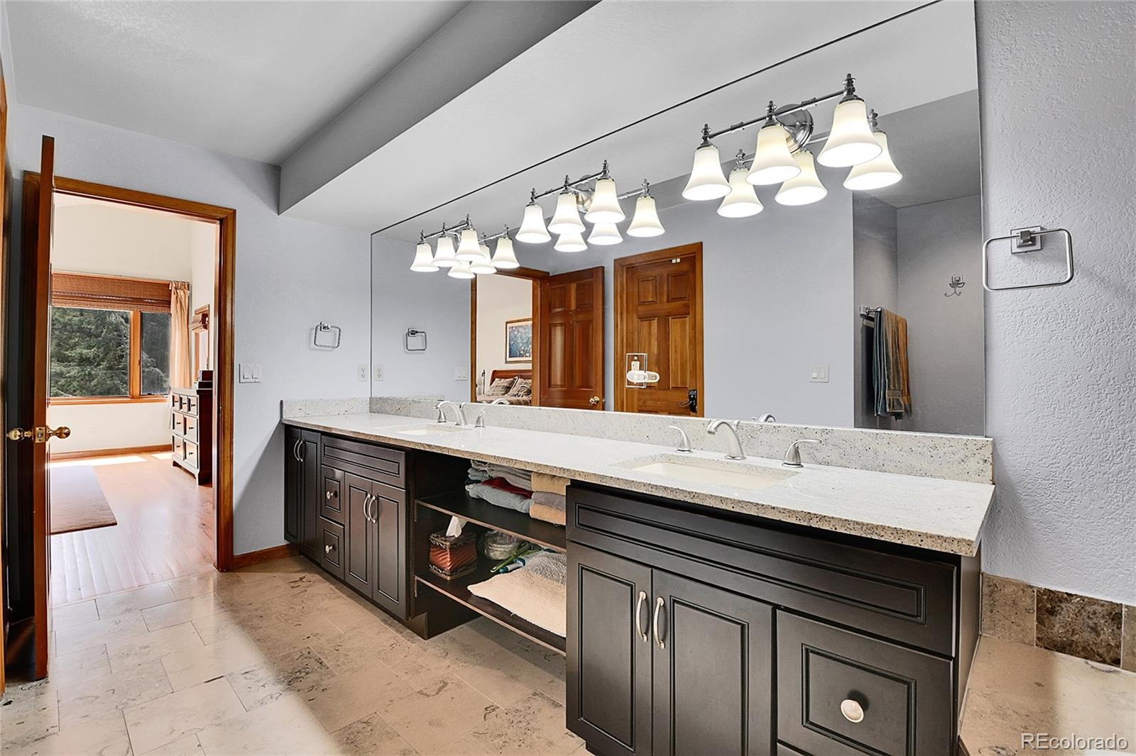Nestled within the exclusive gated community of The Overlook in North Evergreen, Colorado, this exceptional 5-bedroom, 5-bathroom mountain contemporary home spans an impressive 5,425 square feet and sits on a beautifully wooded 2-acre lot adorned with dramatic rock outcroppings. Designed to blend luxury and comfort with the serenity of the outdoors, the home features an expansive private deck—perfect for entertaining or quiet moments surrounded by nature. The open, flowing floor plan connects the living, dining, fully remodeled kitchen, and great room areas, all enhanced by high, soaring ceilings, walls of windows drenched in natural light, and a striking floor-to-ceiling rock fireplace that anchors the space. The living room features a cozy wood-burning stove, while the office and great room are warmed by their own gas fireplaces, creating intimate, inviting environments throughout. Gourmet enthusiasts will be impressed with the remodeled, custom chef’s kitchen, equipped with top-tier Sub- Zero and Wolf appliances, a gas cooktop, oven, Wolf convection steam oven, warming drawer, Breccia Montana Leathered Granite counters, a spacious pantry, rich Knotty Alder cabinetry, and a natural stone backsplash that adds warmth and sophistication. The main floor features a luxurious primary suite with a five-piece travertine-tiled bath and granite countertops, along with a dedicated office space offering views of Elephant Butte. The dining room is accented by a rustic barn wood wall. A charming breakfast nook offers floor-to-ceiling corner windows framing the natural beauty outside. Upstairs offers 2 en-suite bedrooms. The lower level has 2 bedrooms, a family room, and an exercise room. With natural gas hot water heat, a new high-impact shingle roof, a newly paved driveway, and proximity to Open Space, schools, shops, dining, ski areas, and downtown Denver (just 30 minutes away), this home perfectly balances mountain living and modern convenience.