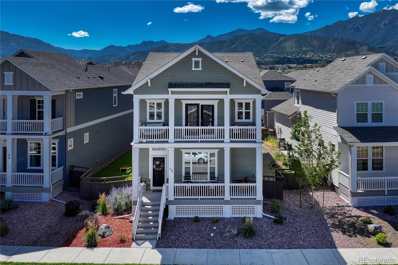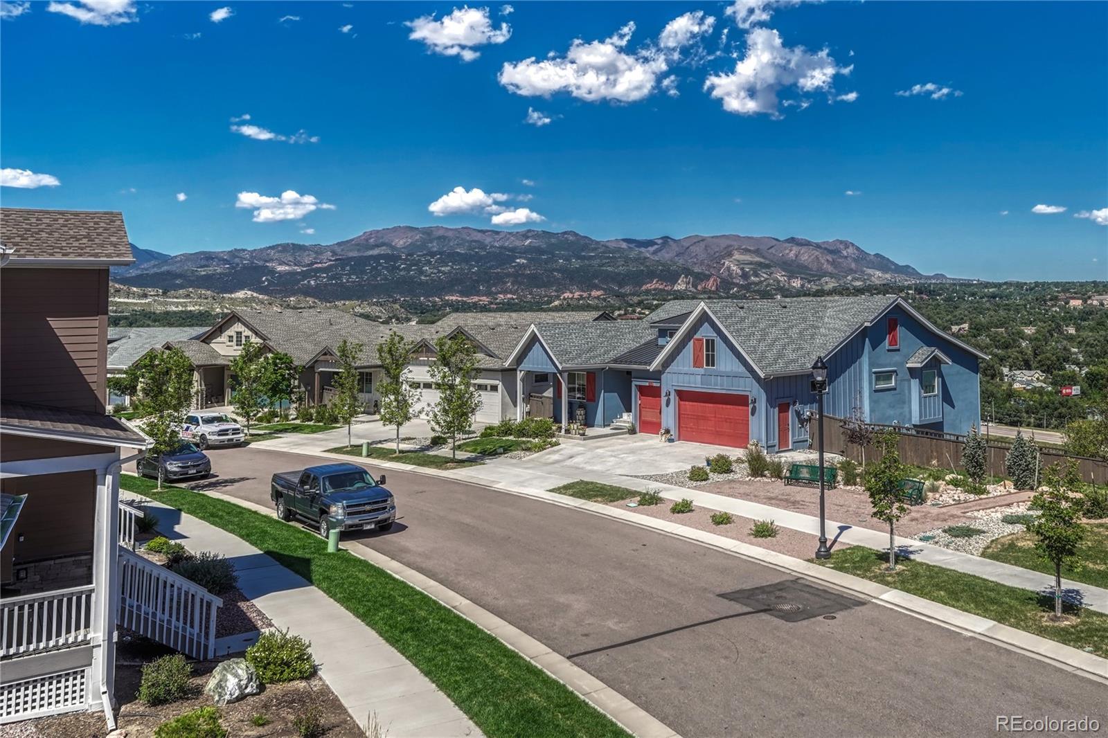 Gorgeous Two-Story Home | New LVP Main-Level/Luxury Carpet Upstairs | Oversized Primary Suite | Finished Basement! Picturesquely situated in the quiet neighborhood of Gold Hill Mesa, this 4BR/3.5BA, 3,500+sqft residence seamlessly incorporates thoughtful design choices and a fabulous midcentury flair. Boasting a brand-new roof, the move-in ready home enchants further with a covered front porch (Trex), rustic exterior stacked stone accents, and beautiful landscaping. Upon entering the meticulously-maintained home, you immediately notice the voluminous vibe with high 9’ ceilings, gorgeous NEW LVP floors, designer-inspired color palette, updated light fixtures, main-level half-bathroom, and an elegant home office with French doors. Entertain with immense ease in the open concept gourmet kitchen, which mesmerizes with stainless-steel appliances, stunning 42” custom cabinetry, quartz countertops, fashionable textured backsplash, gas stove, Samsung refrigerator, garbage disposal, coffee bar, built-in microwave, walk-in pantry, and a breakfast bar island. Guests may easily relax in the adjoining living area, or enjoy a few appetizers in the stylish dining area. Explore the upper-level with luxury carpet to discover a mod loft for easy relaxation. Oversized for maximum comfort, the primary bedroom dazzles with two walk-in closets, balcony access boasting city and Garden of the Gods views, and a luxurious ensuite with a custom step-in rain shower, quartz countertops, and dual sinks. Finally, the finished basement impresses with a large family room, custom “Chicago-style” built-in wet bar, spacious bedroom, full bathroom, and a storage room. Other features: 2-car garage with high ceilings, laundry room, radon mitigation system, fenced-in side yard with turf, covered patio, quick access to Fort Carson, Air Force Academy, Shriever, and Peterson, close to shopping, hospitals, and entertainment, near I-25 for easy commutes to Denver and Downtown Colorado Springs, and more!