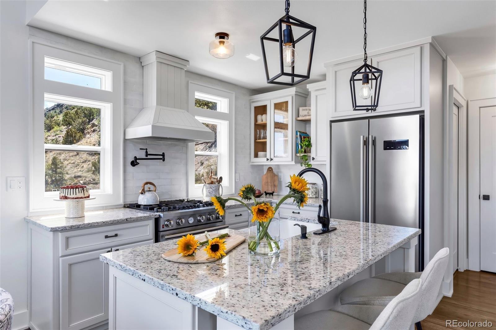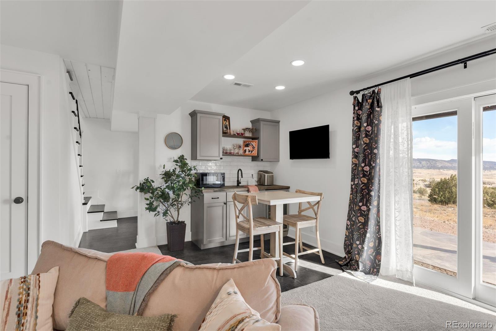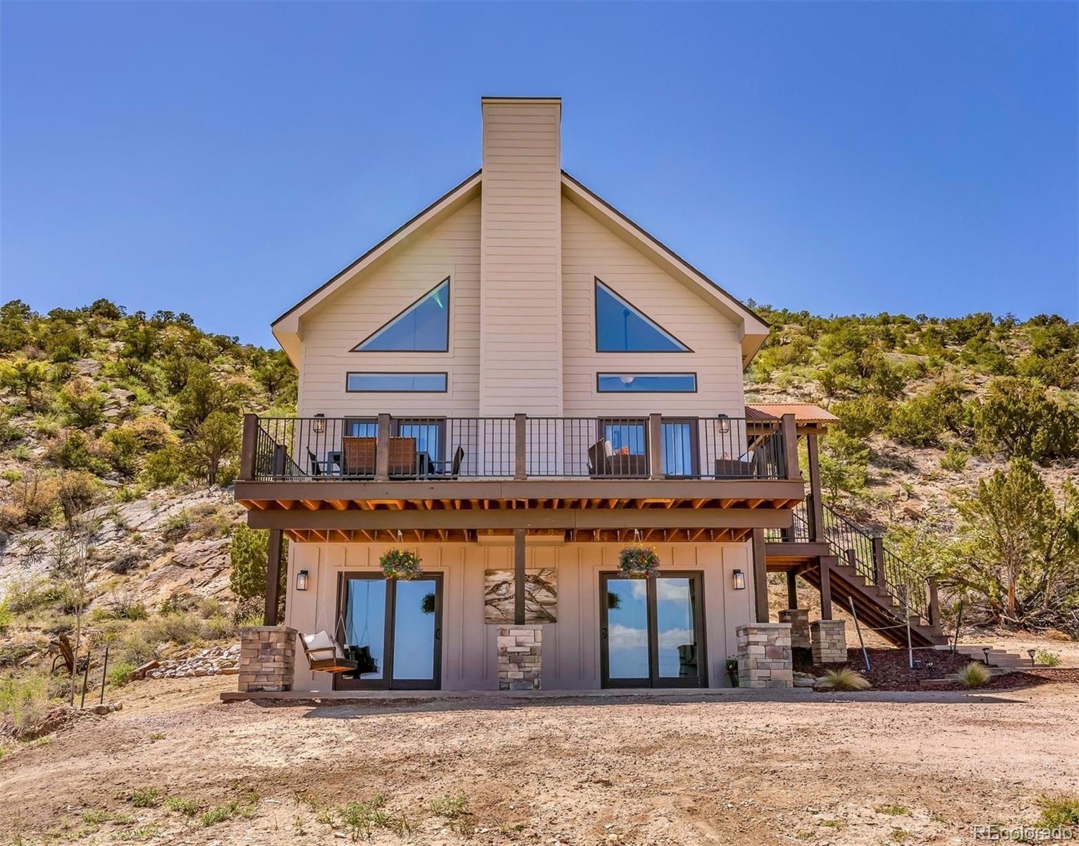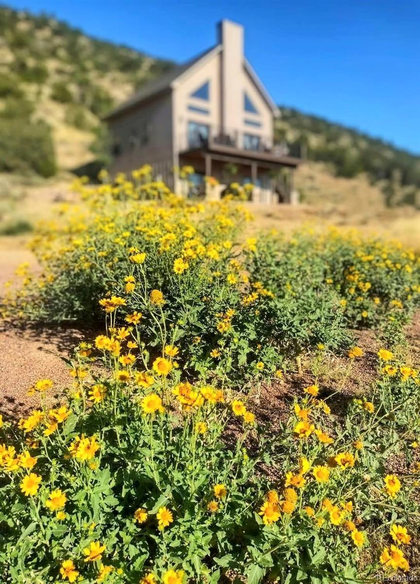 Gorgeous mountain cottage perched in the foothills on 35 private, low maintenance acres just 7 minutes to downtown. Gated, private valley with sweeping views of Canon City and the surrounding mountain ranges. Every detail is custom quality on this contractor's home, with an unmistakable attention to detail. Partially fenced for horses. Custom timber post frame barn has been plumbed for radiant heat and a future bathroom. Possible ADU? 3 bedrooms and 3 bathrooms plus loft, rec space and full kitchenette make this home truly fun and functional. Basement could potentially be rented separately. There is an RV pad with water, 50 amp power and a vault holding tank. The lower level mudroom entrance is beautiful yet functional on those rainy or snowy days. 26' ceilings and wall of windows create a stunning sense of drama in the great room area with passive solar! The spacious upper level Owner's loft boasts a gorgeous bath and a walk-in closet with custom shelving. The kitchen is a cook's delight with a 30" commercial style range and an adjacent walk-in pantry. Blown insulation and HE HVAC provide very low utility bills. The deck affords what are some of the best views in town. A bladder water capture system allows the patio below to stay dry during the rain. The exterior siding is LP, soft glow landscape lighting. Seller will offer to build a detached garage, up to three car, or shop for the buyer at an agreed upon cost. The home can also be sold furnished for a turn key home or STR! The property is very picturesque, blanketed in sunflowers and many other species of cactus and wildflowers. Unique rock formations and remnants of its rich mining history including the evidence of digs, overburden and the original mining cart path are present. It would make a great STR, equestrian STR, possible wedding venue, boarding facility, vacation home or a beautiful primary residence! In a world full of exaggerated AI descriptions, this beautiful home truly is a must see!!