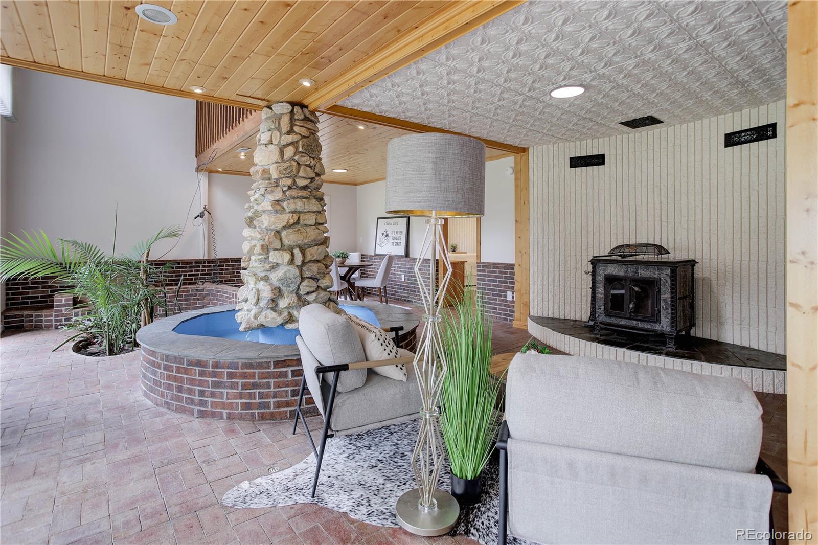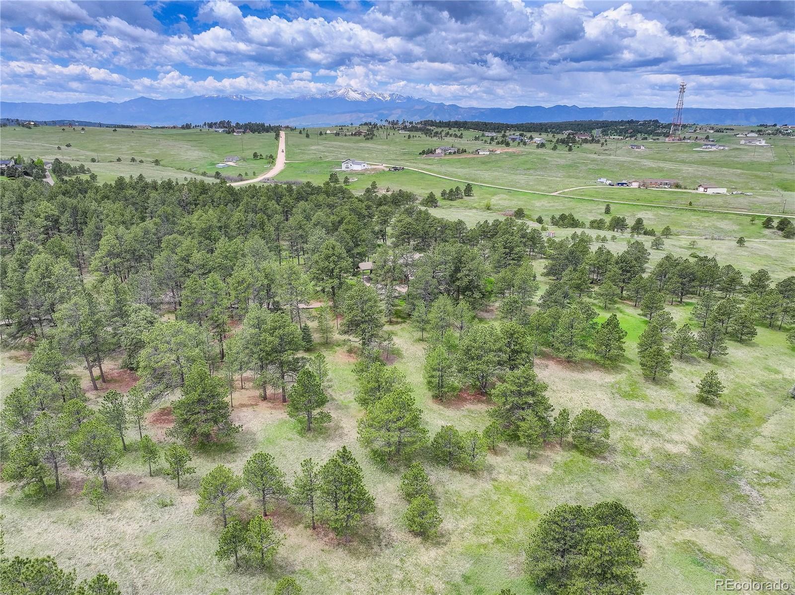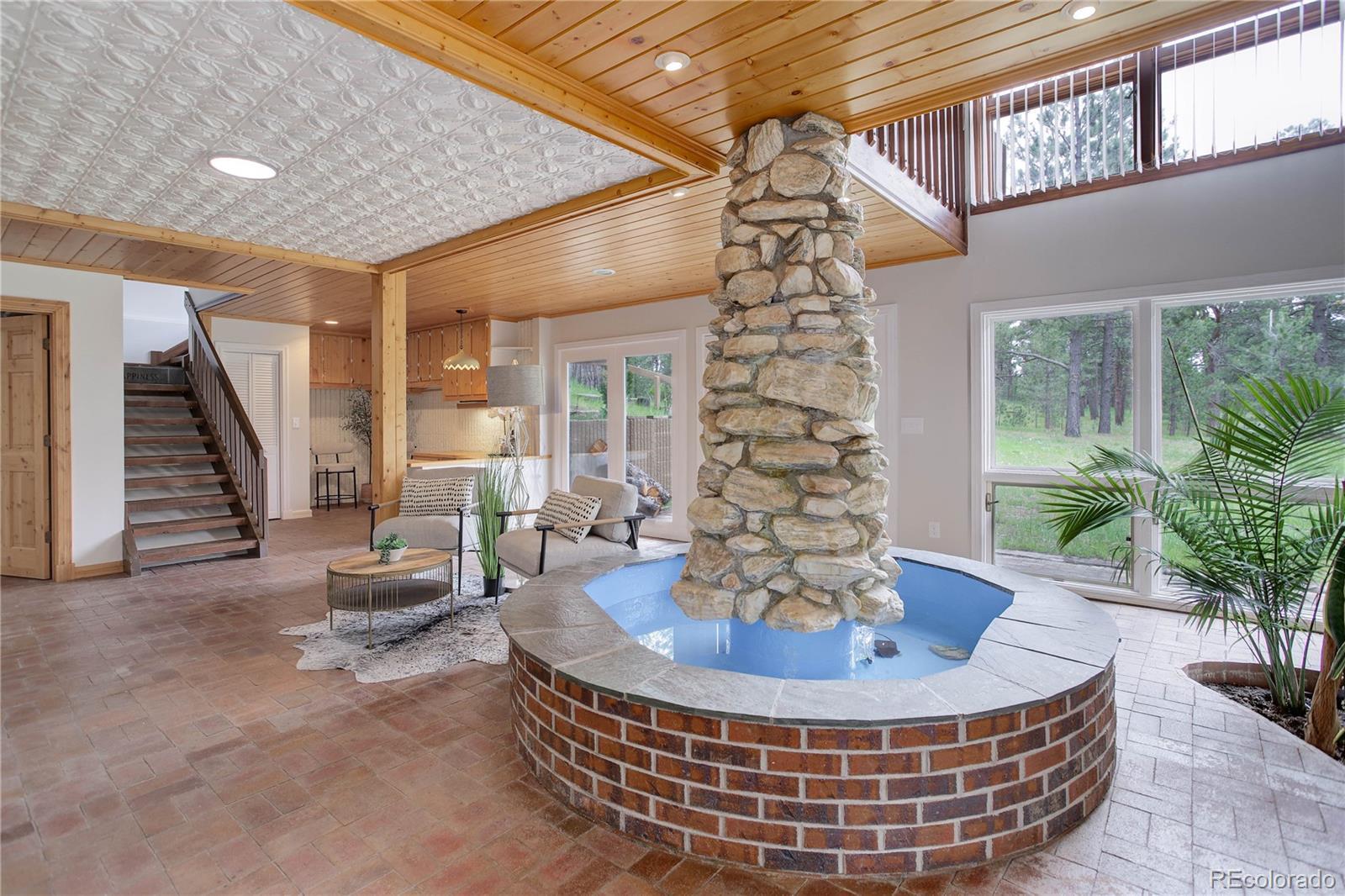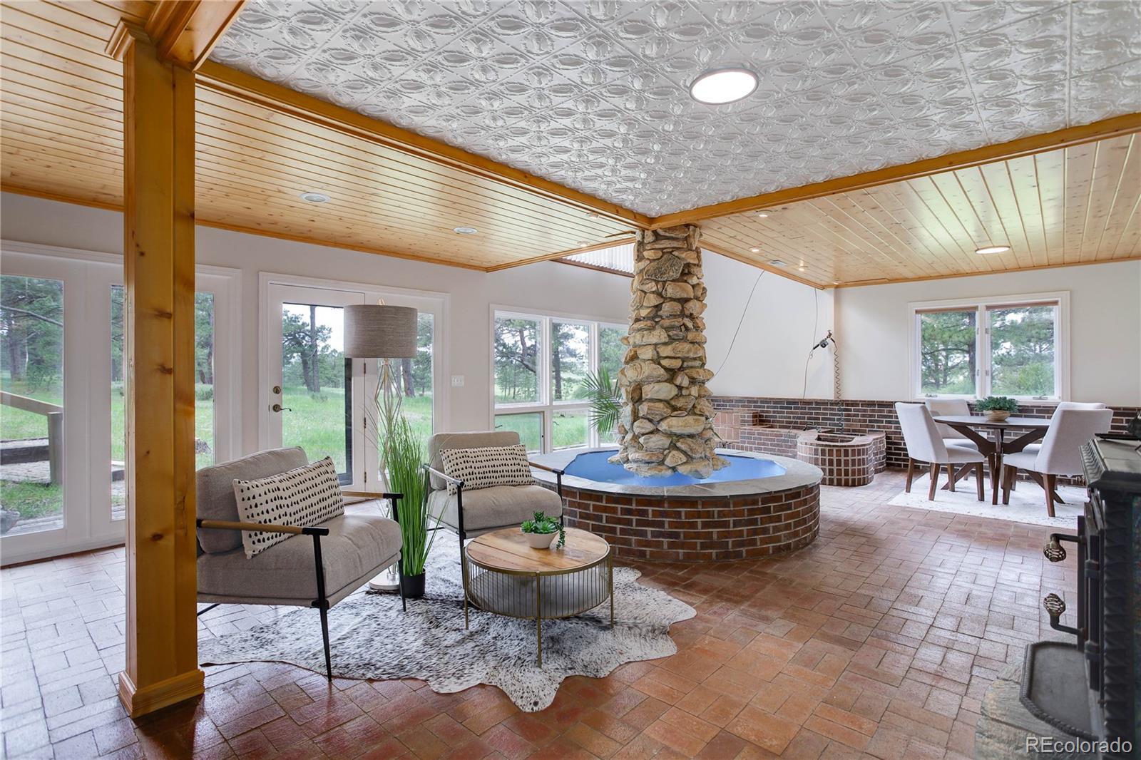 Tucked behind a canopy of mature Ponderosa pines, this tranquil property welcomes with an incredible architectural driveway leading to a portico with porch swing and fenced grounds. The home is surrounded by a multi-level terraced garden with paved walkways and walk-out access. Inside, the living room features soaring wood cathedral ceilings, a dramatic two-story natural rock fireplace, and south-facing windows for relaxing natural views and soothing passive solar warmth. The kitchen offers heated slate floors, a Jenn Air range, a hot water tap, and access to a covered west-facing deck with views stretching to Pikes Peak and the Front Range. The primary suite includes an oversized walk-in closet and an en-suite bath with radiant heat hardwood floors. The upstairs loft doubles as an office with a gas fireplace & built-in floor-to-ceiling shelving and glass-fronted cabinets. This level also offers a bedroom & bath. Downstairs, enjoy the peaceful sound of a cascading waterfall into a circular koi pond, part of a two-story atrium designed for year-round indoor gardening. Off of the walk-out family room, a secondary suite with attached bath is ready to accommodate guests. The finished garage includes an RV-height door and extra deep parking bays. Additional features include two wells, a dedicated workshop, laundry room with sink and chute, and zoning that permits livestock. Approximately half the acreage is mitigated, blending forest and native grass meadow that descends to a pond that is both spring fed & filled by the East Cherry Creek. Wildlife is abundant, and privacy is preserved while still offering easy access to Herring Road.