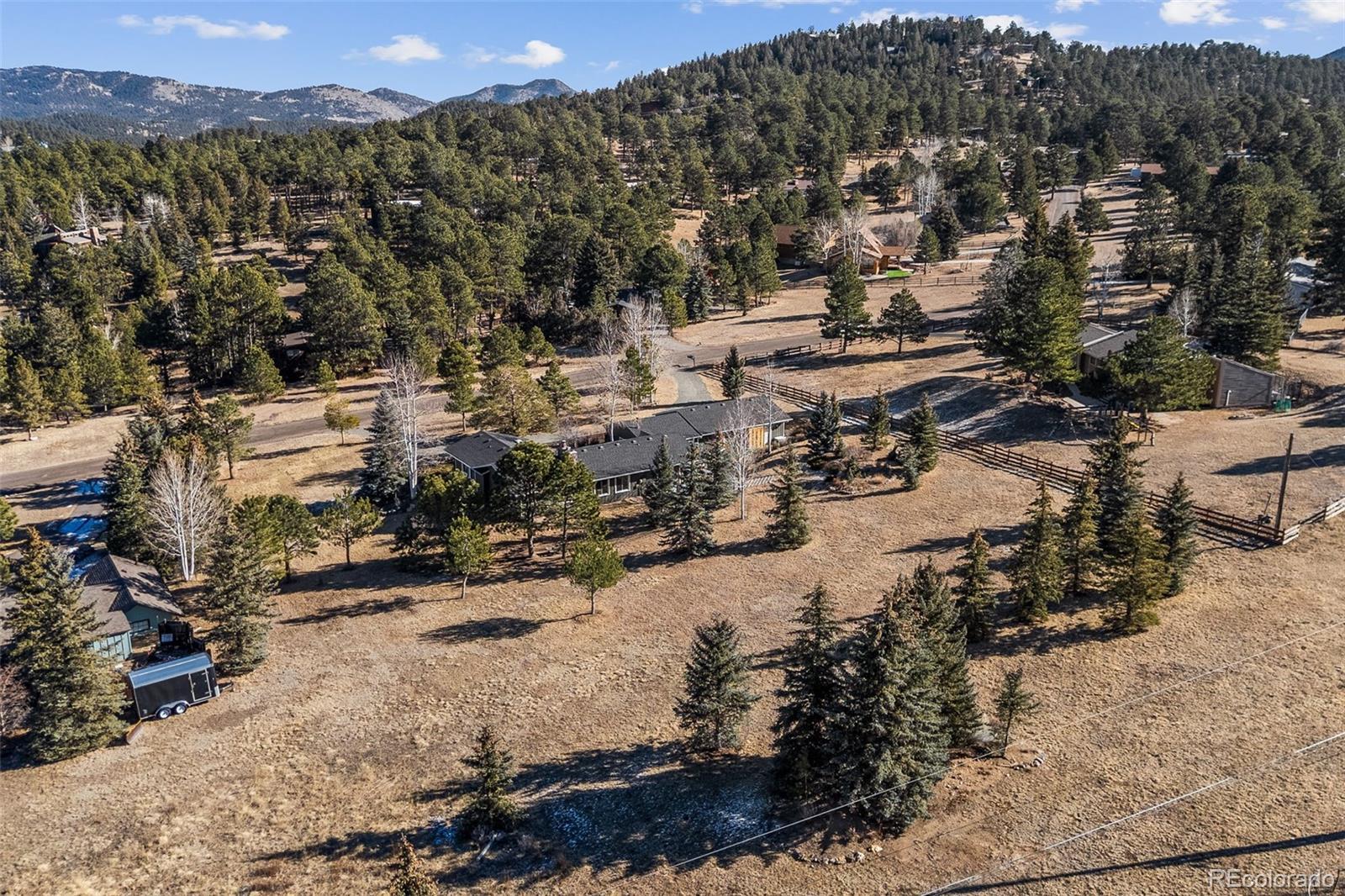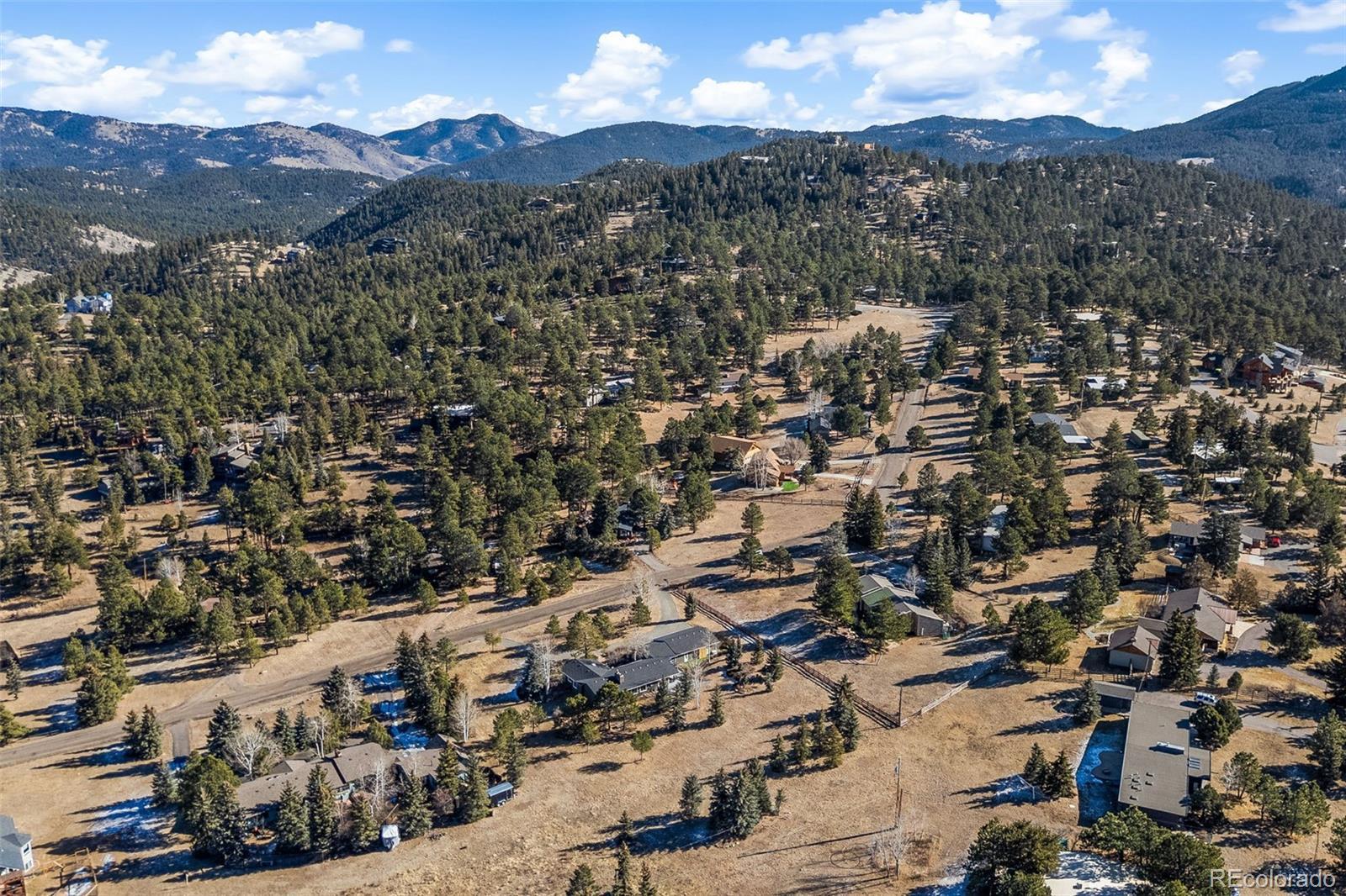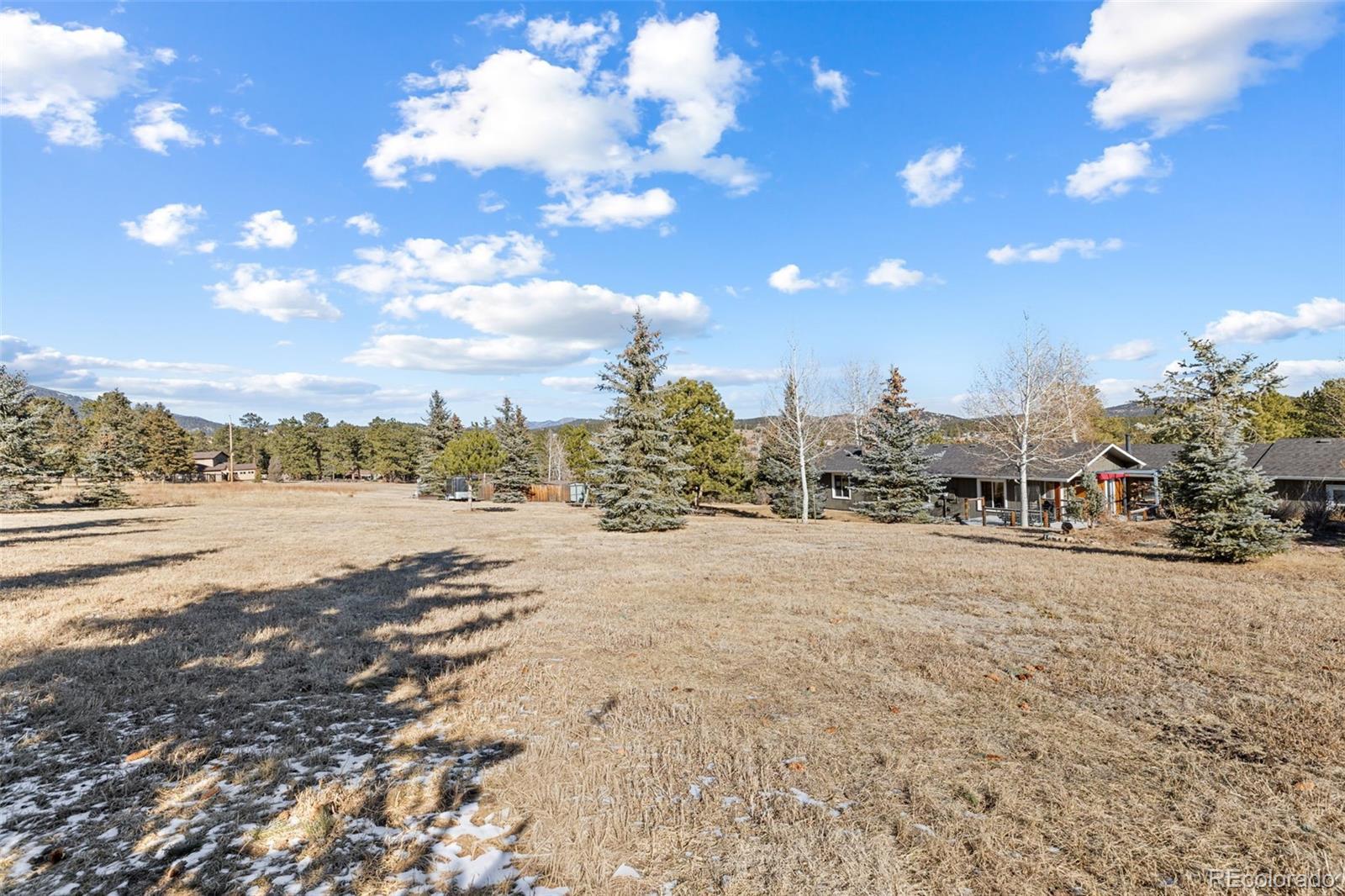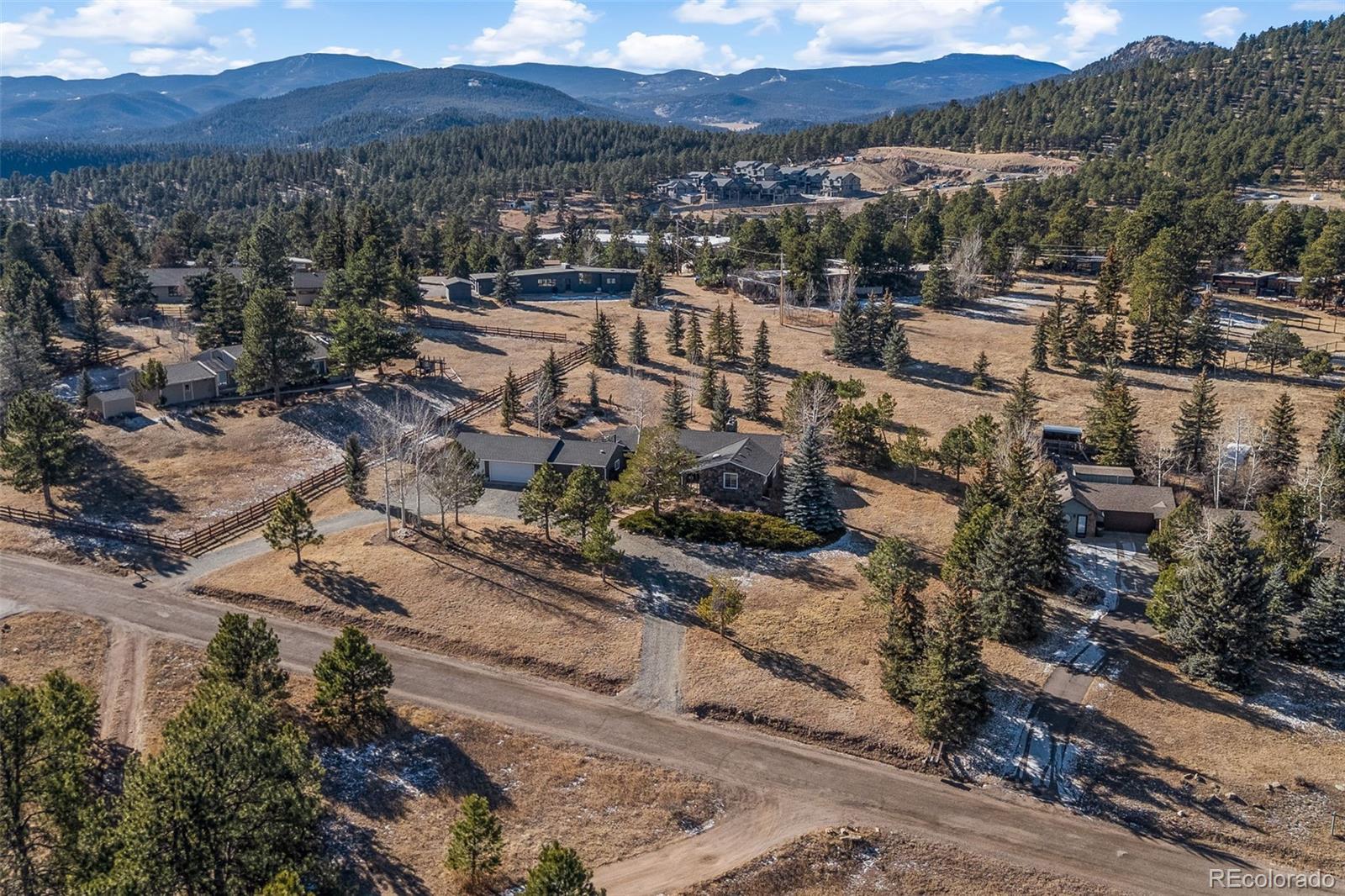 Highly desirable Hiwan Hills home, RARE SINGLE-STORY RANCH, 3 Car garage, 1.43 acres, 396 soft heated Workshop (making this home 2,138 sqft), NEW KITCHEN, NEW ROOF, new paint inside and out, flat lot with big skies, open mountain views, and room to breathe. One of the original homes in the neighborhood, it enjoys wide, quiet streets that are perfect for walking, bike riding, and easy year-round access. This sun-filled 3-bedroom, 2-bath has warm in floor radiant heated wood floors, abundant windows, and an open floorpan. The kitchen, living, and dining areas flow naturally toward the outdoors, where a charming courtyard with a water fountain offers a private, serene spot for morning coffee or evening gatherings. The generous sized lot is a standout in Hiwan Hills, providing multiple outdoor living areas, composite decking and small turf grass area for low-maintenance enjoyment, and a circular drive that makes guest parking and daily coming and going a breeze. City water adds to the convenience and peace of mind. For hobbyists, car enthusiasts, or anyone needing extra storage, the oversized workshop and 3-car garage (added on) deliver incredible functionality rarely found at this price point. New roof. New paint inside and out. With its unique blend of meticulous care, usable land, mountain views, and practical upgrades, this home is a special Evergreen opportunity you won’t often see come on the market. Living room and office are virtually staged.