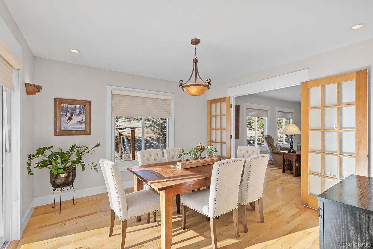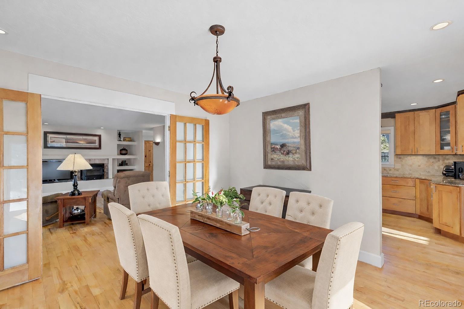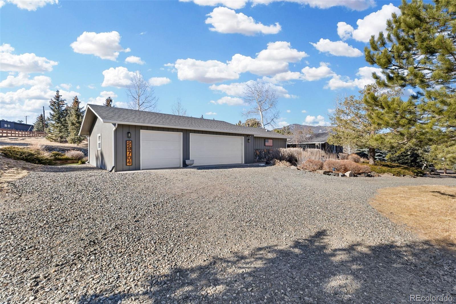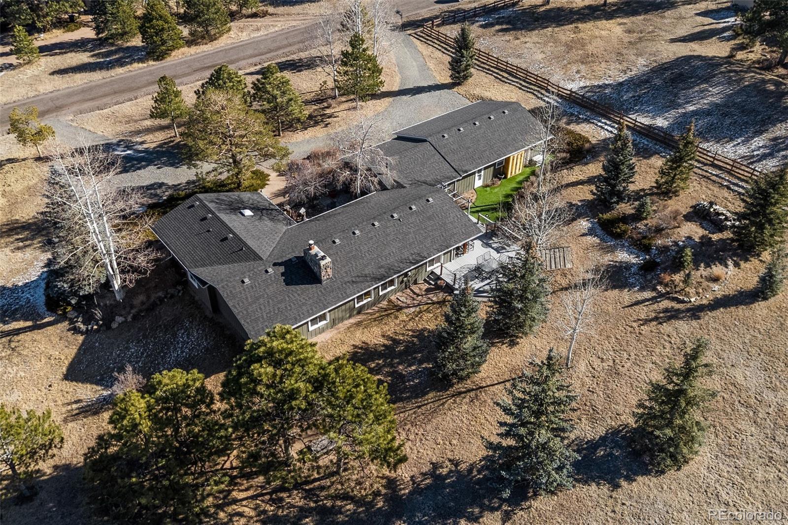 Highly desirable Hiwan Hills home, RARE SINGLE-STORY RANCH, 3 Car garage, 1.43 acres, 396 soft heated Workshop (making this home 2,138 sqft), NEW KITCHEN, NEW ROOF, new paint inside and out, flat lot with big skies, open mountain views, and room to breathe. One of the original homes in the neighborhood, it enjoys wide, quiet streets that are perfect for walking, bike riding, and easy year-round access. This sun-filled 3-bedroom, 2-bath has warm in floor radiant heated wood floors, abundant windows, and an open floorpan. The kitchen, living, and dining areas flow naturally toward the outdoors, where a charming courtyard with a water fountain offers a private, serene spot for morning coffee or evening gatherings. The generous sized lot is a standout in Hiwan Hills, providing multiple outdoor living areas, composite decking and small turf grass area for low-maintenance enjoyment, and a circular drive that makes guest parking and daily coming and going a breeze. City water adds to the convenience and peace of mind. For hobbyists, car enthusiasts, or anyone needing extra storage, the oversized workshop and 3-car garage (added on) deliver incredible functionality rarely found at this price point. New roof. New paint inside and out. With its unique blend of meticulous care, usable land, mountain views, and practical upgrades, this home is a special Evergreen opportunity you won’t often see come on the market. Living room and office are virtually staged.