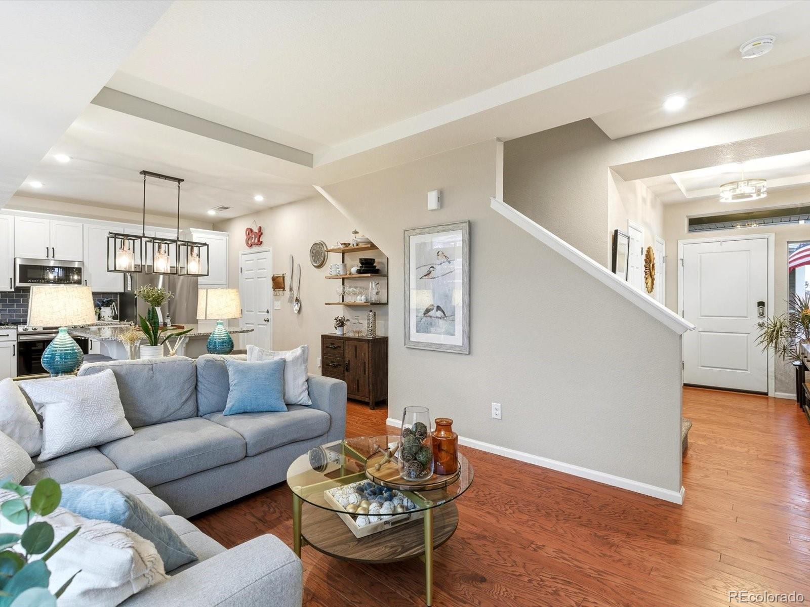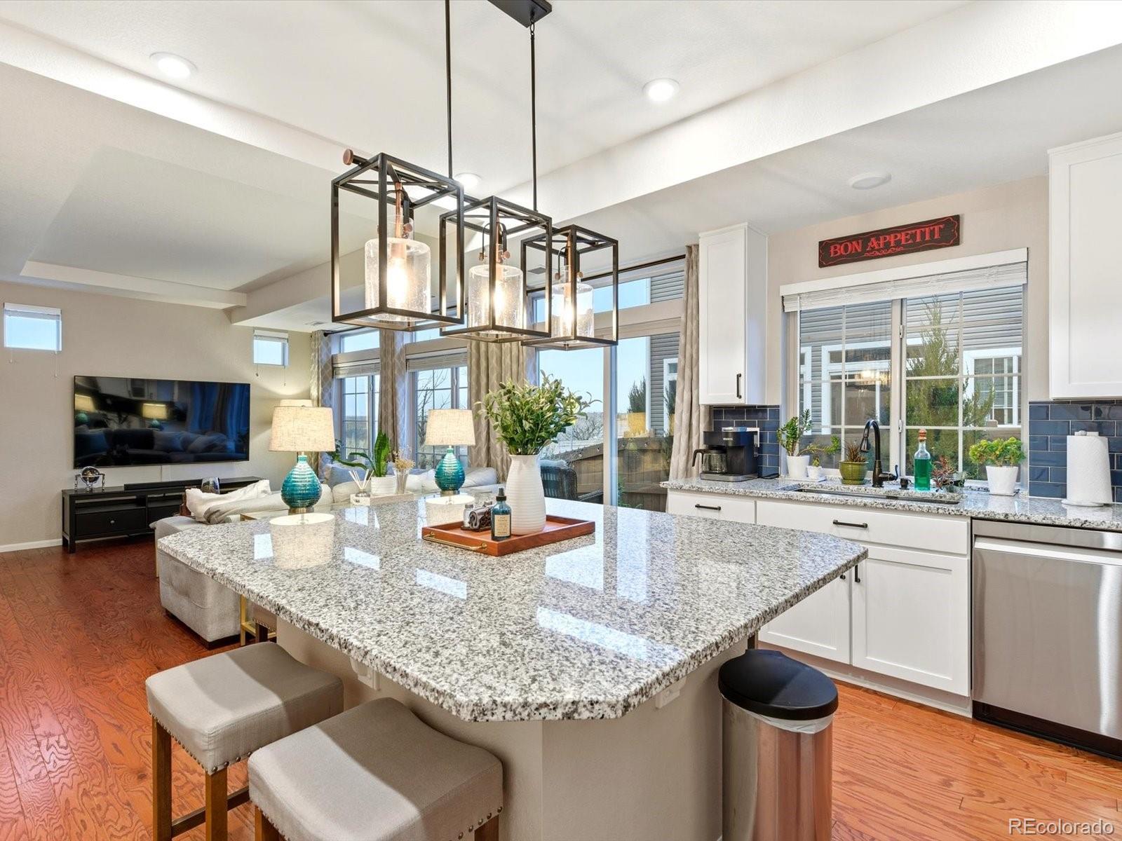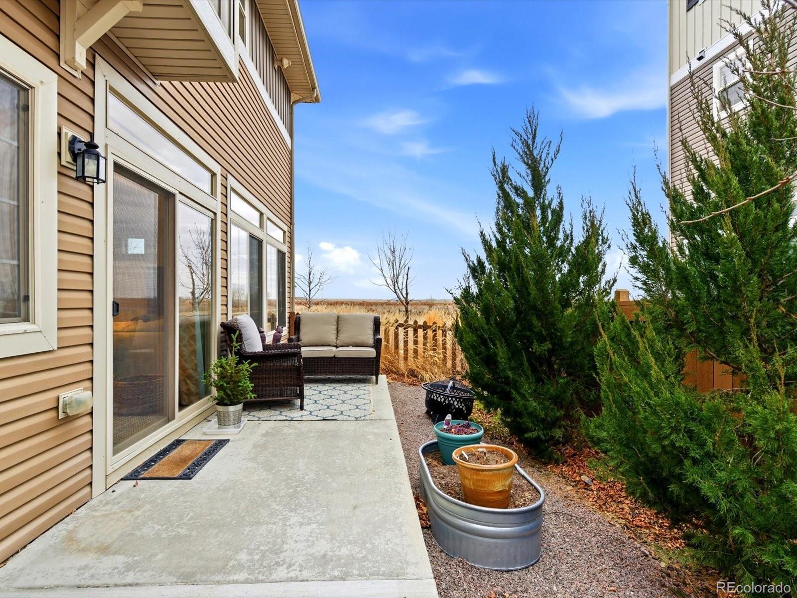 Welcome to this beautiful Reunion home, a home designed to be lived in and loved. Living in Reunion means more than just owning a home; it's about enjoying a lifestyle with two community pools, parks, multiple schools, lakes and trails galore, a well appointed rec center, a tennis/pickleball court and countless activities! The main level is bright and open, creating a natural flow that makes everyday life feel effortless. The kitchen anchors the space, with a generous granite island that easily becomes the hub for meals, homework, weekend baking, and long conversations. It opens directly to the living area, so whether you’re hosting friends or enjoying a quiet night in. A conveniently located half bath keeps the main level functional and guest-friendly. Upstairs, the layout is designed for both privacy and flexibility. The primary suite offers a comfortable retreat, a large walk-in closet, and an en-suite bath with double vanities and a walk-in shower. Two additional bedrooms can adapt to your needs—perfect as guest rooms, home offices, or a workout space. A full hallway bath, dedicated laundry room, and linen closet keep the upper level organized and easy to manage. Outside, the backyard extends your living space. The concrete patio is ideal for dining outdoors, grilling, or relaxing under the shade of mature trees. Planter boxes invite gardening, while the fire pit sets the scene for cozy evenings and casual gatherings. The wrap-around front porch offers another place to enjoy the outdoors, whether it’s morning coffee, sunset views, or watching the neighborhood come to life. A two-car garage with built-in shelving keeps storage streamlined, and ample street parking on both Waco and Walden makes hosting a breeze. Schools, shopping and restaurants nearby. Easy access to E470, I76 and Denver International Airport. Only 25 minutes to downtown Denver! Don't miss your opportunity to own this lovely home in a spectacular neighborhood!