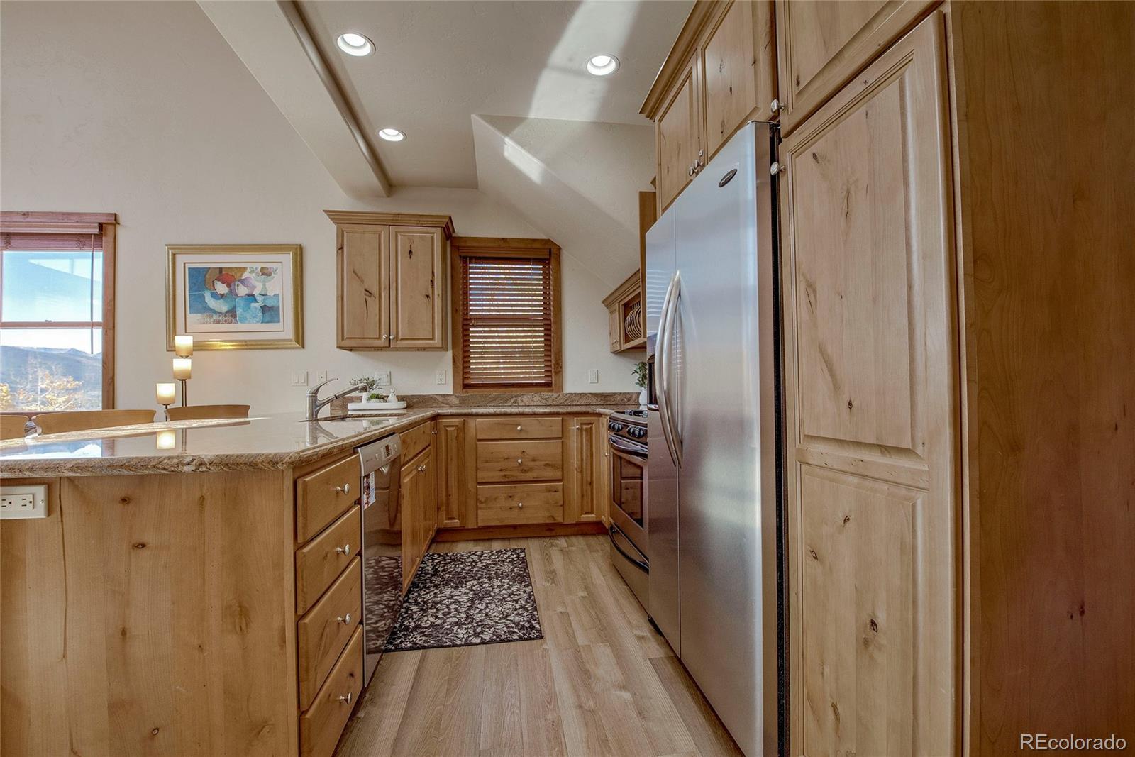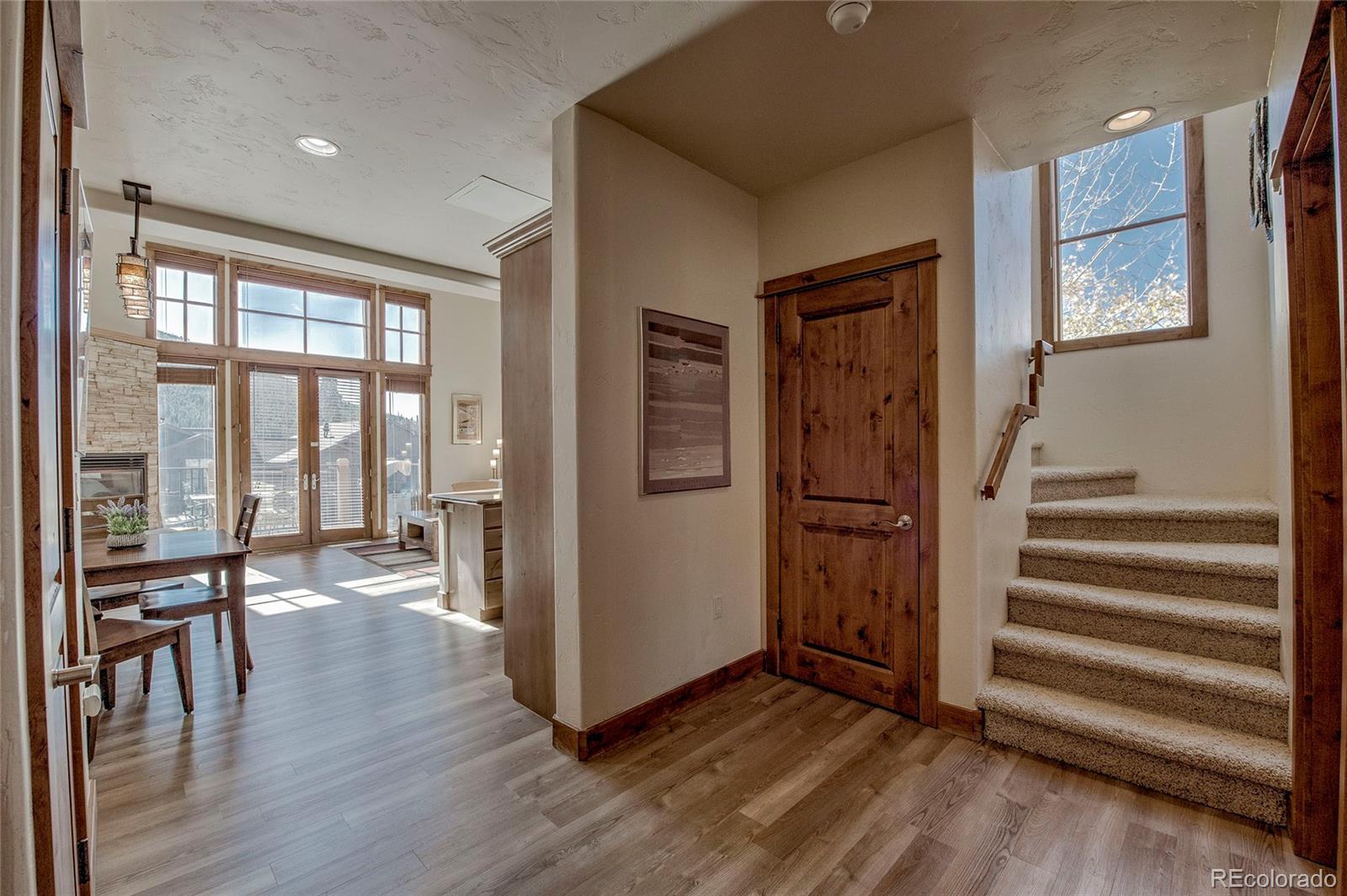 Bright and spacious 2BD/2BA end unit just minutes from Keystone! Vaulted ceilings and floor-to-ceiling windows flood the open-concept living space with natural light. Features include a cozy gas fireplace, large south-facing deck, and extra loft space perfect for a home office. Enjoy the convenience of a 1-car garage plus additional storage for all out outdoor gear. Well-maintained complex with on-site hot tubs. No resort fees and no rental restrictions—great short-term rental potential! Surrounded by national forest for year-round hiking and biking adventures. Turnkey and ready to enjoy!