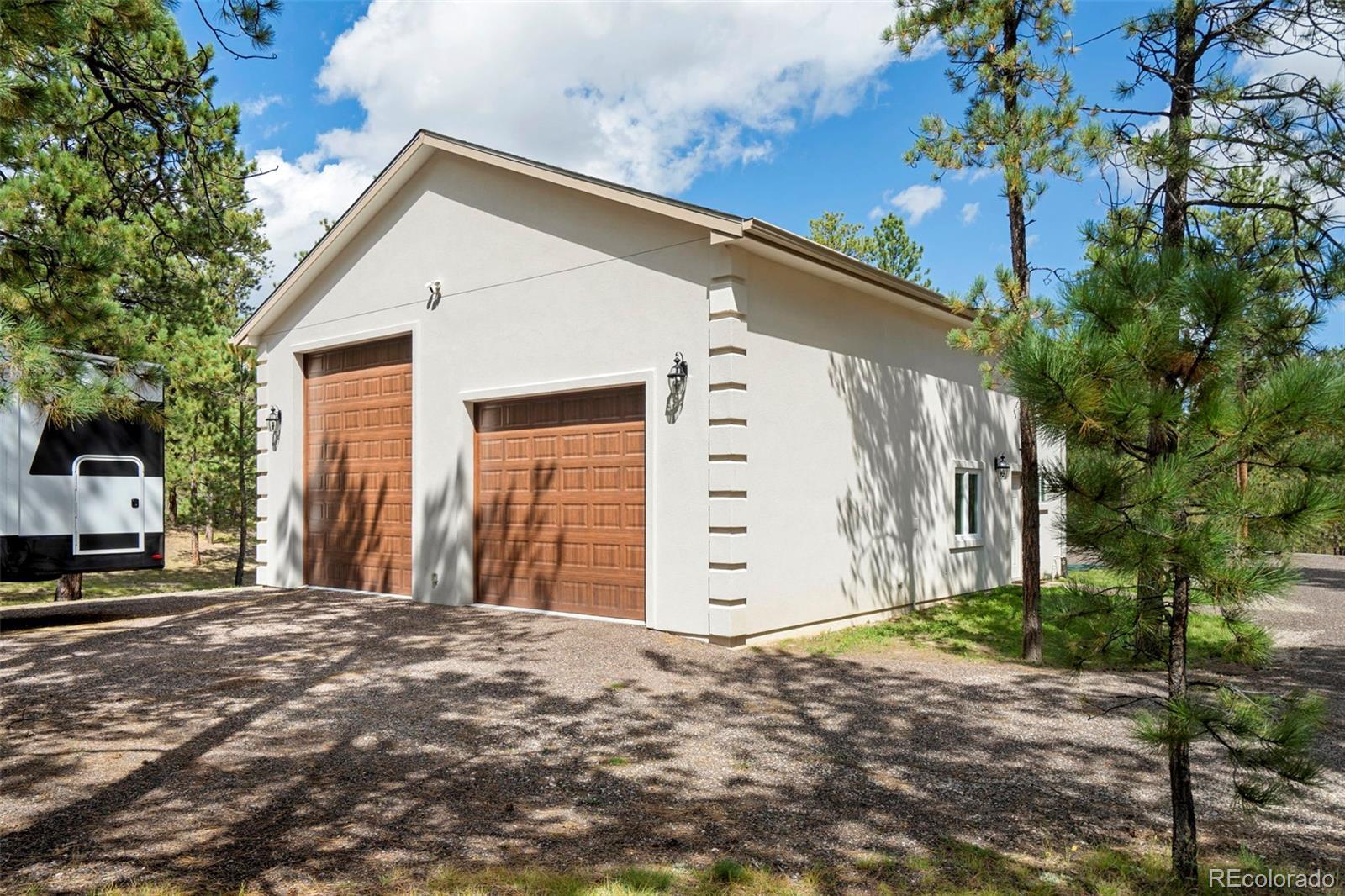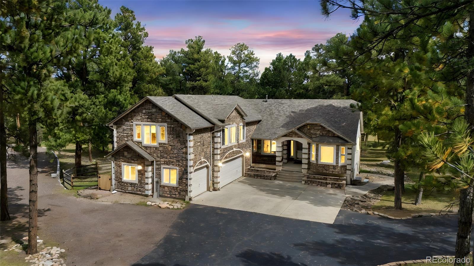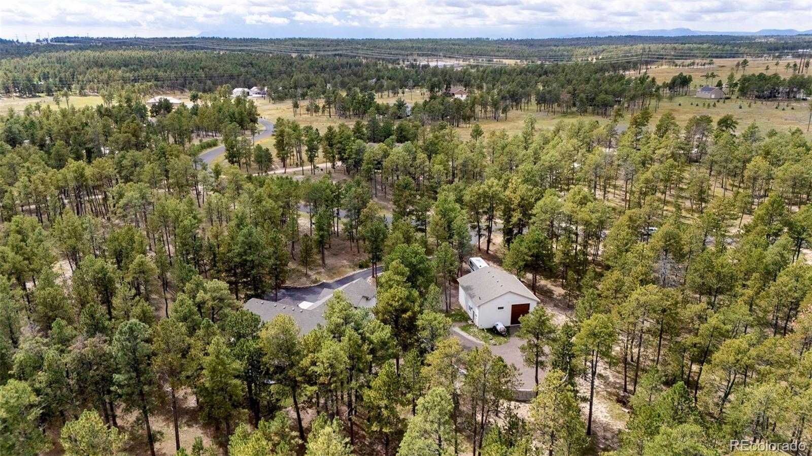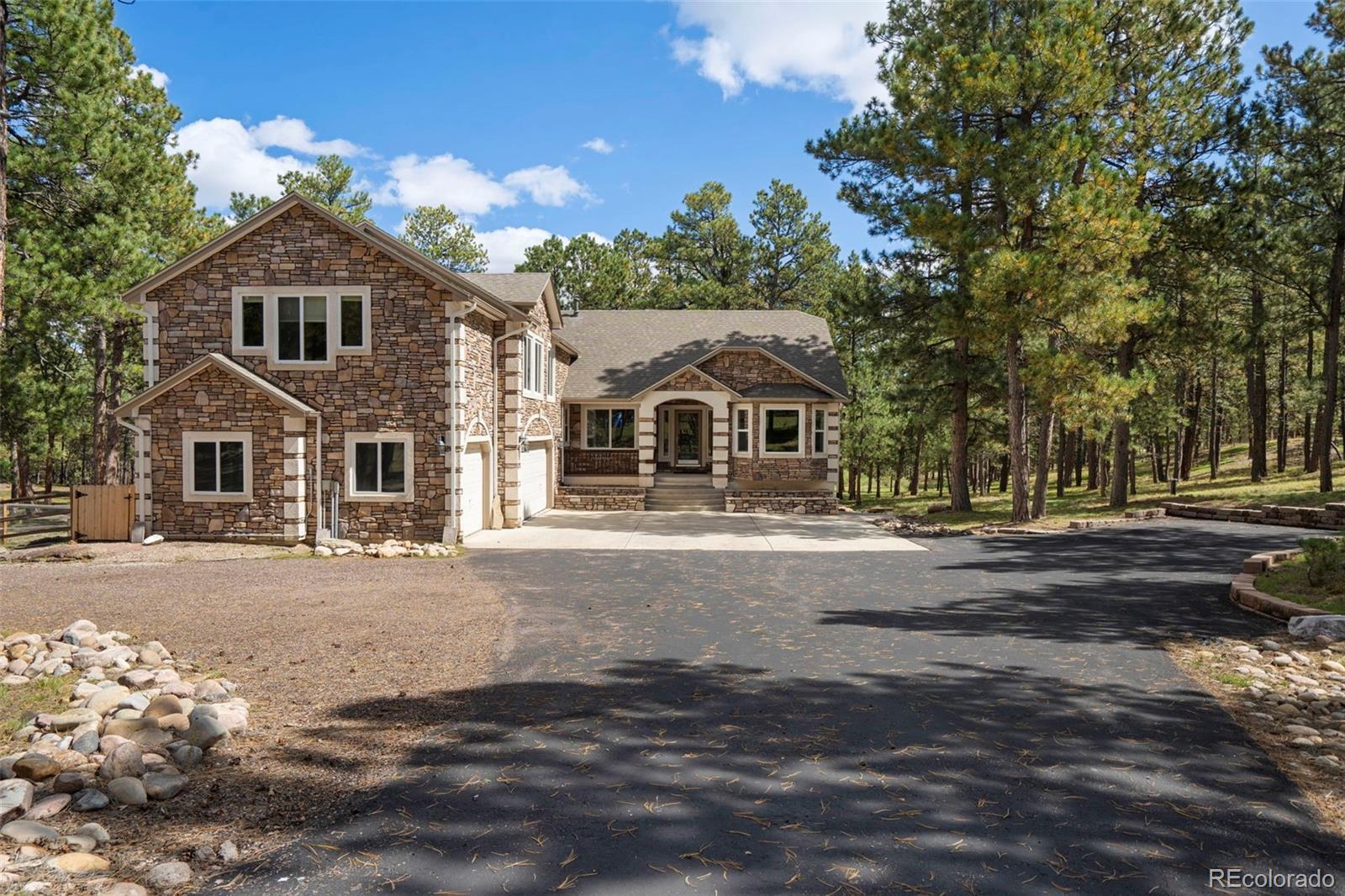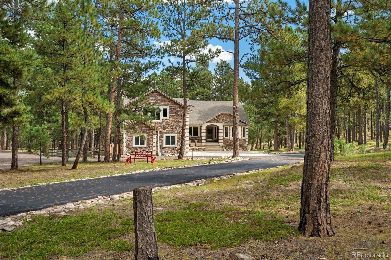 Welcome to elegant Black Forest living. Located at the end of a culdesac on five treed acres & hidden in the towering pines, this beautiful stone/stucco home features four bedrooms, five baths, dedicated office, formal living and dining plus basement family room/rec area. Plus a 2021 beautiful multi purpose drive thru (no backing up!) RV 36x40 building w/septic clean out/2-14'x10'doors w/ finished interior/heated/w bath & sink/30 amp/lots of plug ins/superior lighting + third 12'x10' door. The rear and side has a broad terrace/driveway supported by a commercial grade retaining wall. Property is located on all paved roads, close to Falcon shopping/golfing/restaurants, walking/riding trails w/ Section 16 park nearby. Easy commutes to the Springs & Denver. Entering the driveway to the home w/ its stone exterior & paved driveway, you will notice the privacy, the trees, plus the back meadow which is teaming w/ wildlife such as turkeys, mule deer, birds, and squirrels. The oversized, finished attached garage will fit the biggest of trucks and enters into a nice laundry room and 1/2 bath, and main living with a real cook's kitchen and a massive quartz island, and a huge walk in pantry w/fridge. The kitchen nook overlooks the land letting the nature in. The large living room which can be segmented off with a family room area features a nice fireplace for cozy nights. The main level office and 1/2 bath completes the main level. Up just a few steps, and you enter into the beautiful master retreat complete with two walk in master closets, a wonderful reading space, and well appointed five-piece bath with heated floors/towel warmer/2 headed shower w/bench. The basement walkout is three lovely bedrooms, two baths (one Jack and Jill) also with heated floors, and the recreational/family area. Other features include gleaming hardwood floors, granite and tile in all baths, large storage area, and a true pride of ownership. This home is a joy to show.