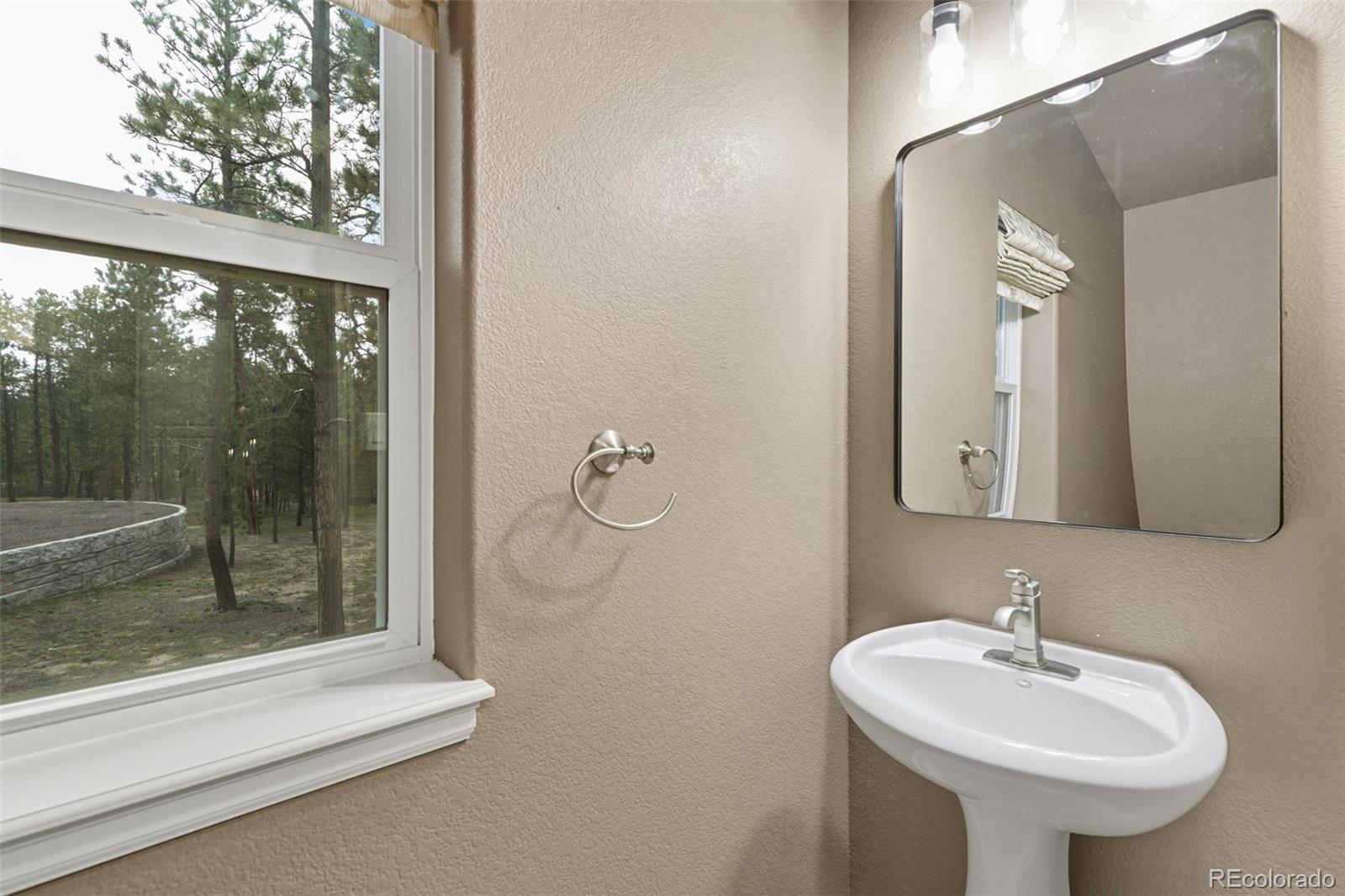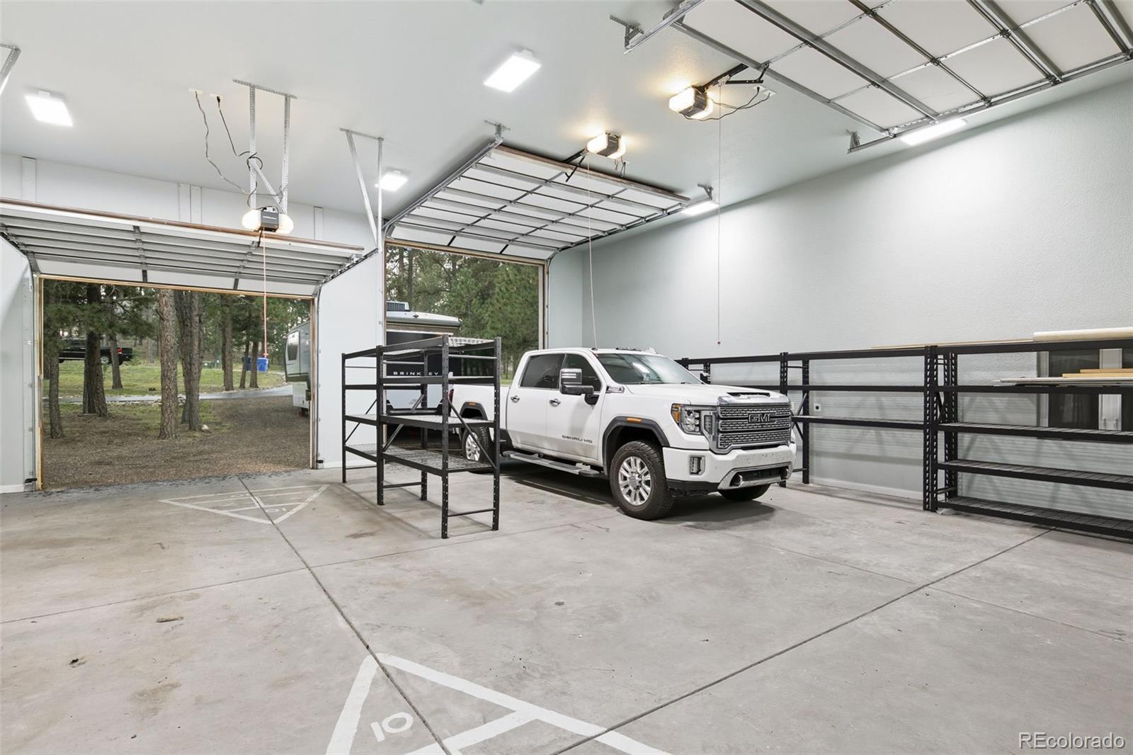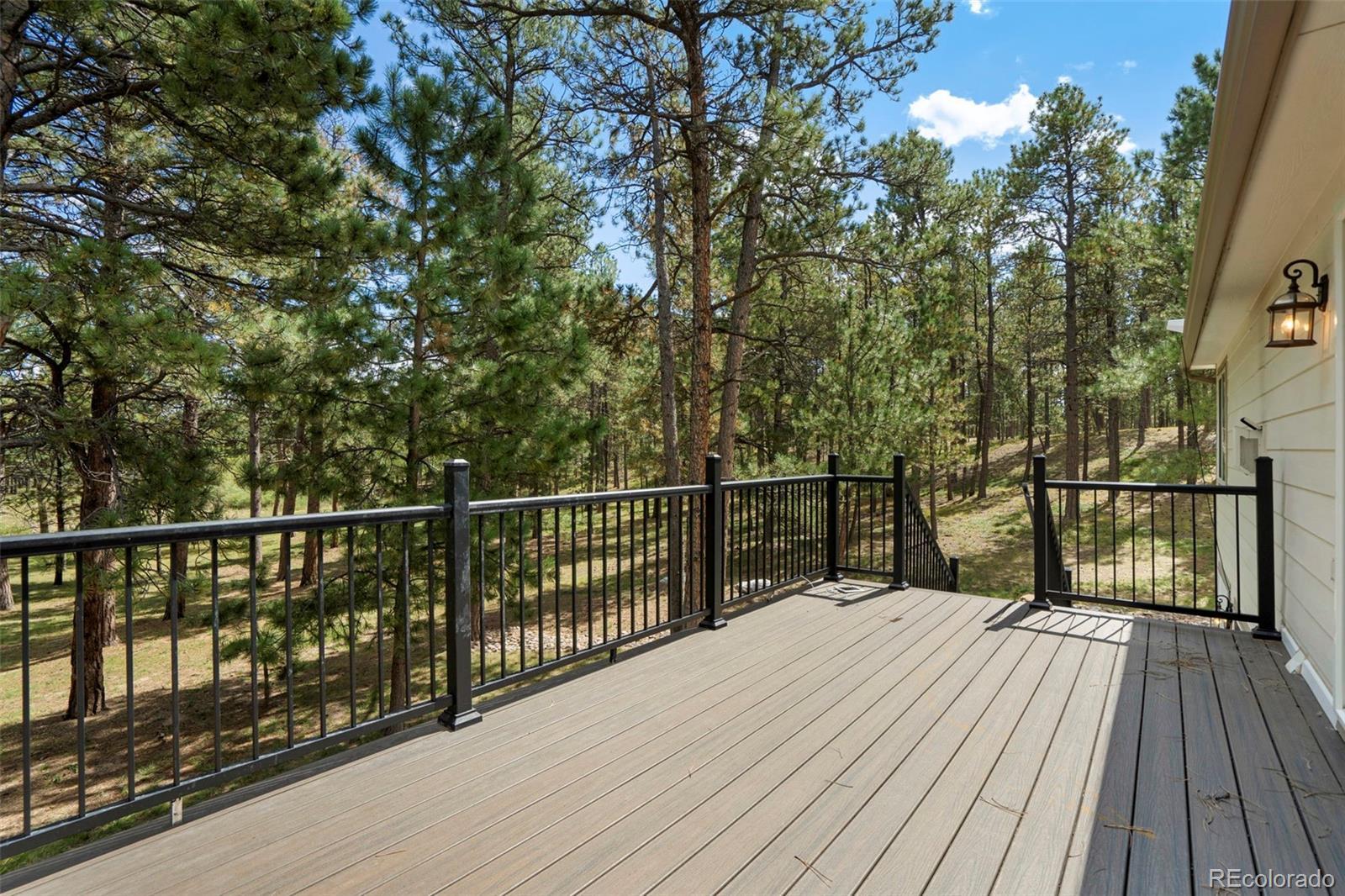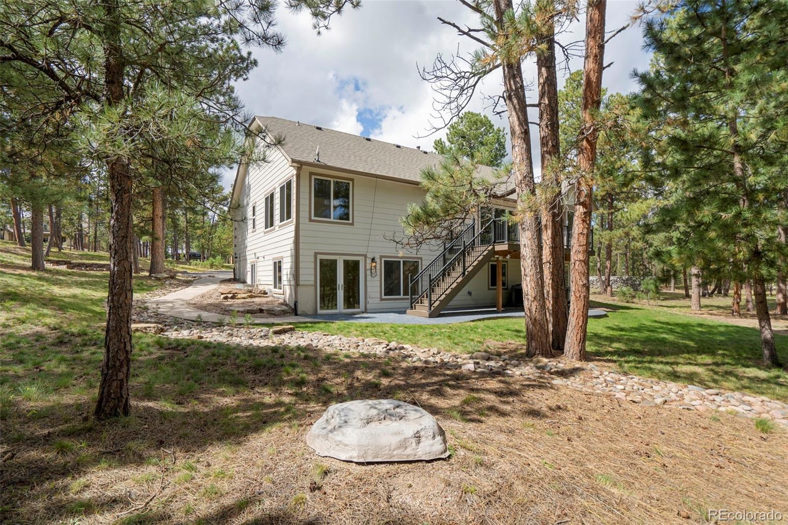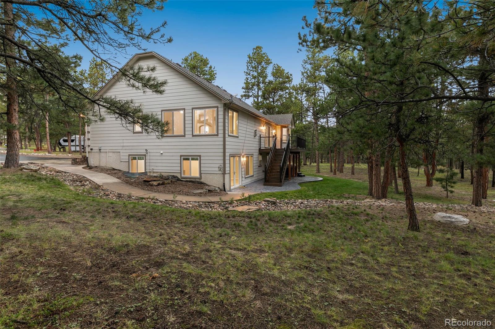 Welcome to elegant Black Forest living. Located at the end of a culdesac on five treed acres & hidden in the towering pines, this beautiful stone/stucco home features four bedrooms, five baths, dedicated office, formal living and dining plus basement family room/rec area. Plus a 2021 beautiful multi purpose drive thru (no backing up!) RV 36x40 building w/septic clean out/2-14'x10'doors w/ finished interior/heated/w bath & sink/30 amp/lots of plug ins/superior lighting + third 12'x10' door. The rear and side has a broad terrace/driveway supported by a commercial grade retaining wall. Property is located on all paved roads, close to Falcon shopping/golfing/restaurants, walking/riding trails w/ Section 16 park nearby. Easy commutes to the Springs & Denver. Entering the driveway to the home w/ its stone exterior & paved driveway, you will notice the privacy, the trees, plus the back meadow which is teaming w/ wildlife such as turkeys, mule deer, birds, and squirrels. The oversized, finished attached garage will fit the biggest of trucks and enters into a nice laundry room and 1/2 bath, and main living with a real cook's kitchen and a massive quartz island, and a huge walk in pantry w/fridge. The kitchen nook overlooks the land letting the nature in. The large living room which can be segmented off with a family room area features a nice fireplace for cozy nights. The main level office and 1/2 bath completes the main level. Up just a few steps, and you enter into the beautiful master retreat complete with two walk in master closets, a wonderful reading space, and well appointed five-piece bath with heated floors/towel warmer/2 headed shower w/bench. The basement walkout is three lovely bedrooms, two baths (one Jack and Jill) also with heated floors, and the recreational/family area. Other features include gleaming hardwood floors, granite and tile in all baths, large storage area, and a true pride of ownership. This home is a joy to show.
