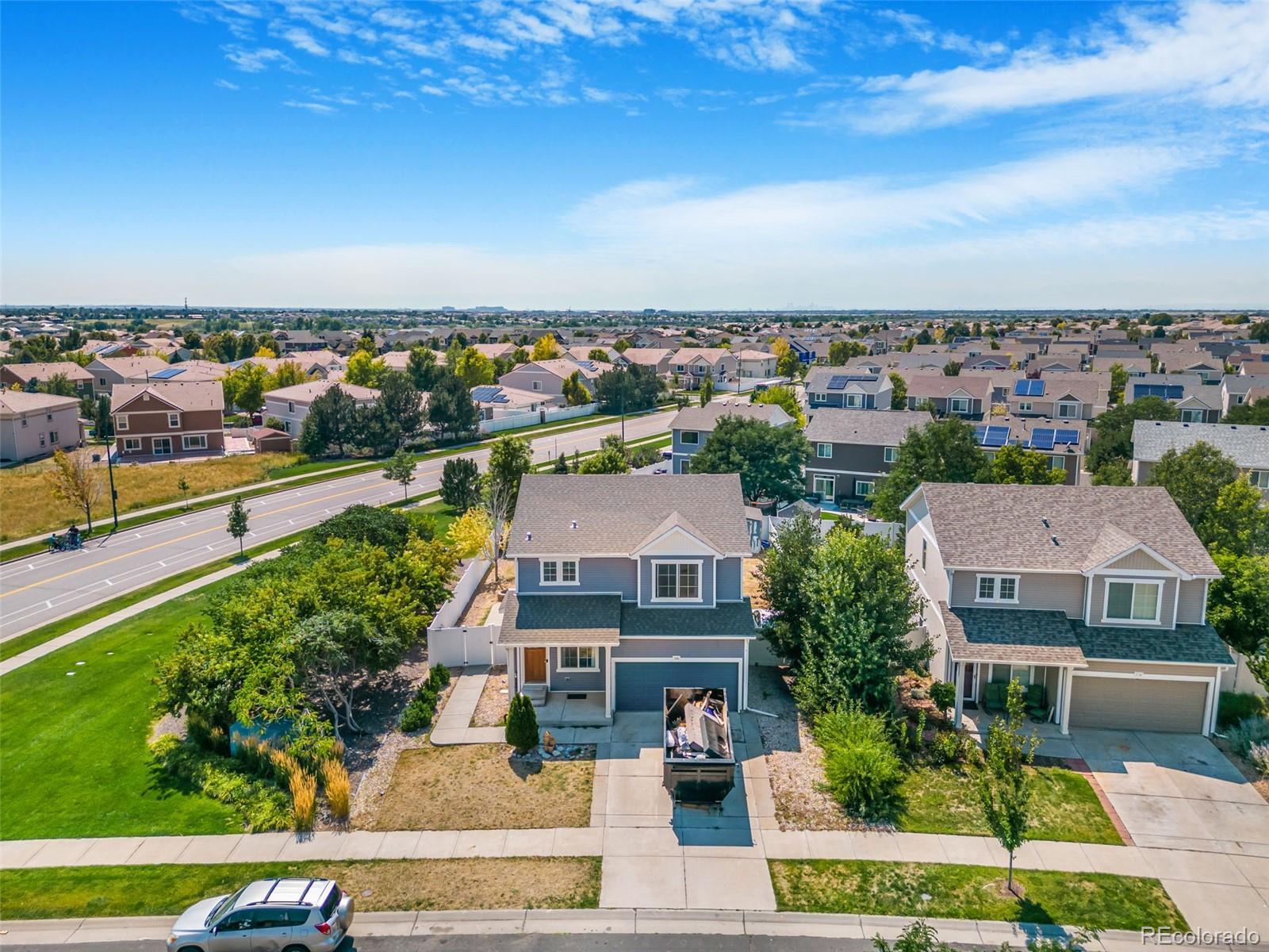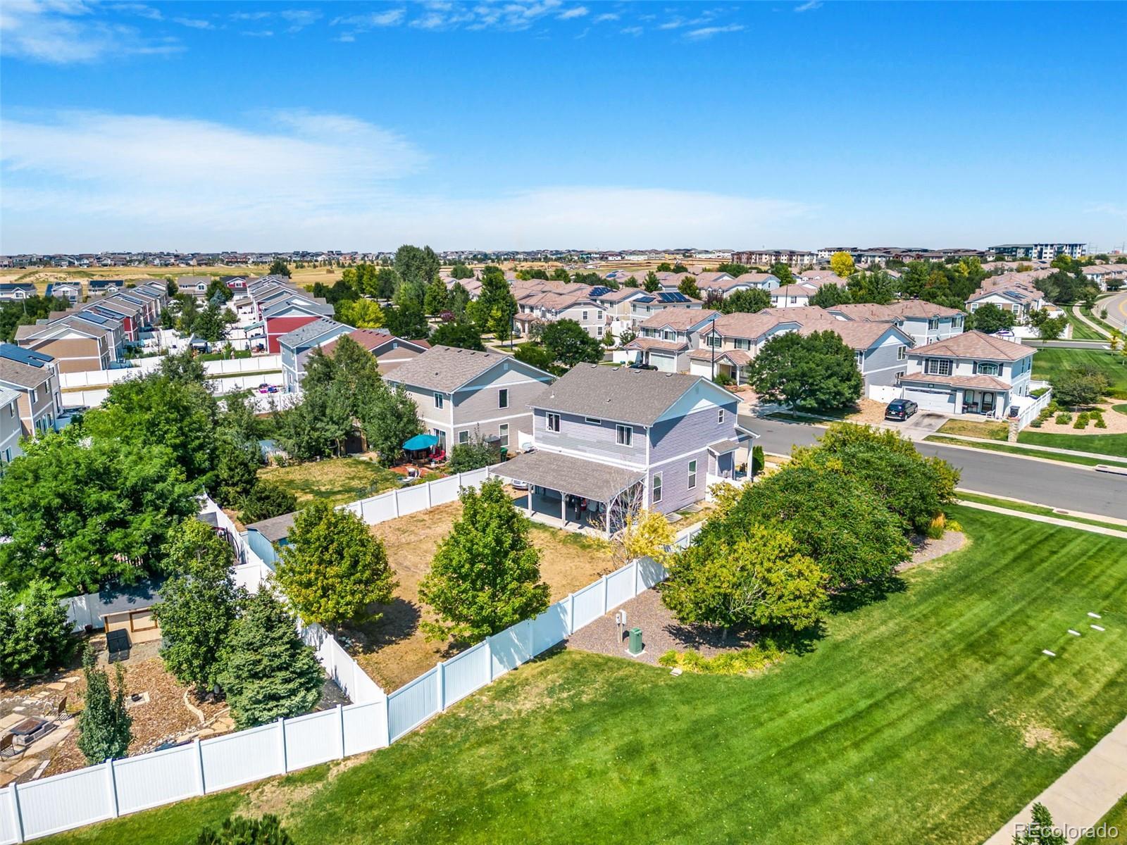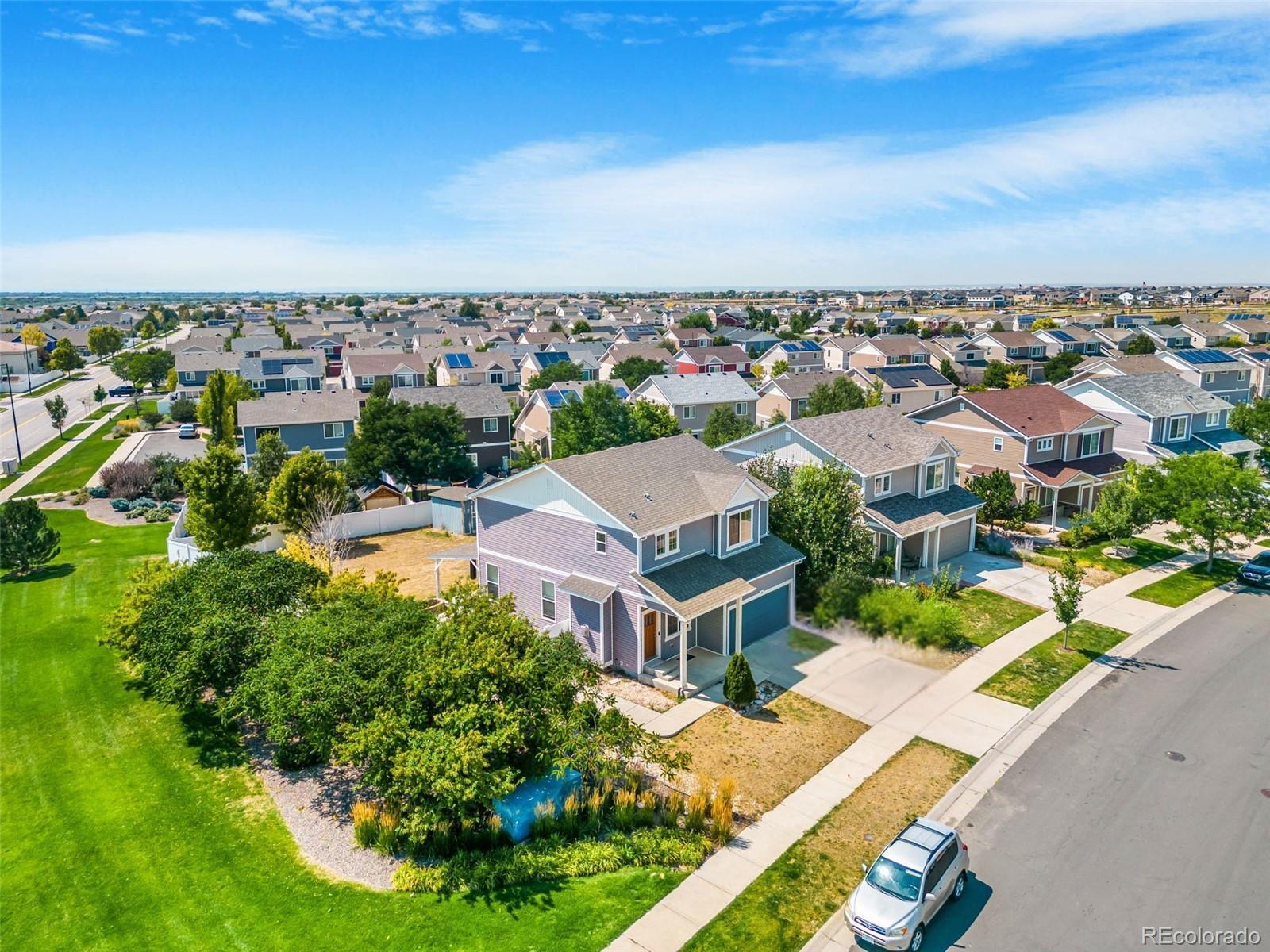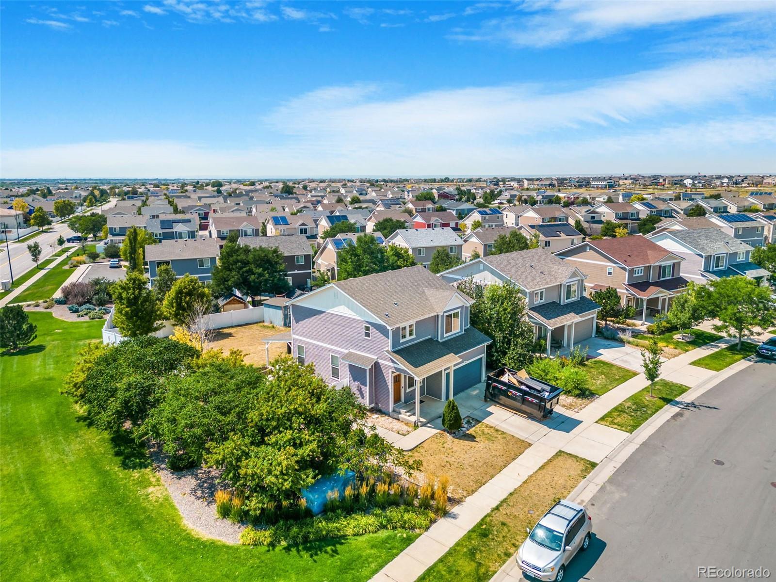 Don’t miss this competitively priced 3-bedroom, 3-bath home on a premium corner lot in Green Valley Ranch. With 1,743 square feet above grade and a spacious unfinished basement offering over 700 additional square feet, this two-story home offers solid bones, great natural light, and plenty of potential for equity growth. The main floor features an open layout with laminate flooring, a cozy gas fireplace, and a kitchen designed for function with a gas stove, exterior venting, and ample cabinet space. A sunny dining area overlooks the large backyard, and a sliding door leads to the covered patio—perfect for relaxing or entertaining. Upstairs, the expanded primary suite is a true retreat, complete with a massive walk-in closet, vaulted ceilings, and a luxurious 5-piece bath. Two additional bedrooms and a bright full bath with an extra window offer space for family, guests, or a home office. The home sits across from the golf course and offers quick access to DIA, the light rail, major highways, and shopping at Green Valley Ranch Town Center. This home is a rare opportunity to build equity in a fast-growing community. Schedule your showing today and imagine the possibilities.