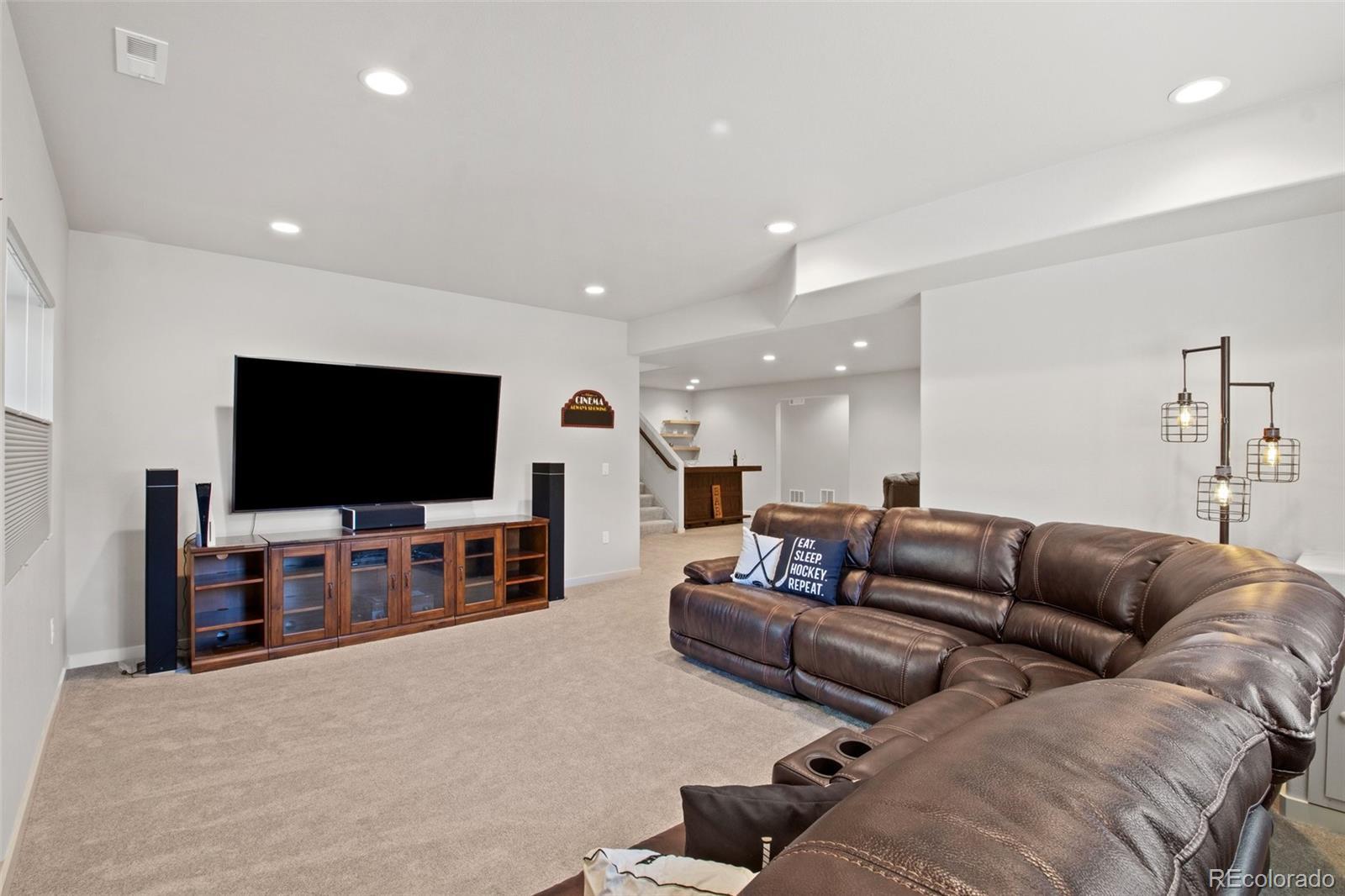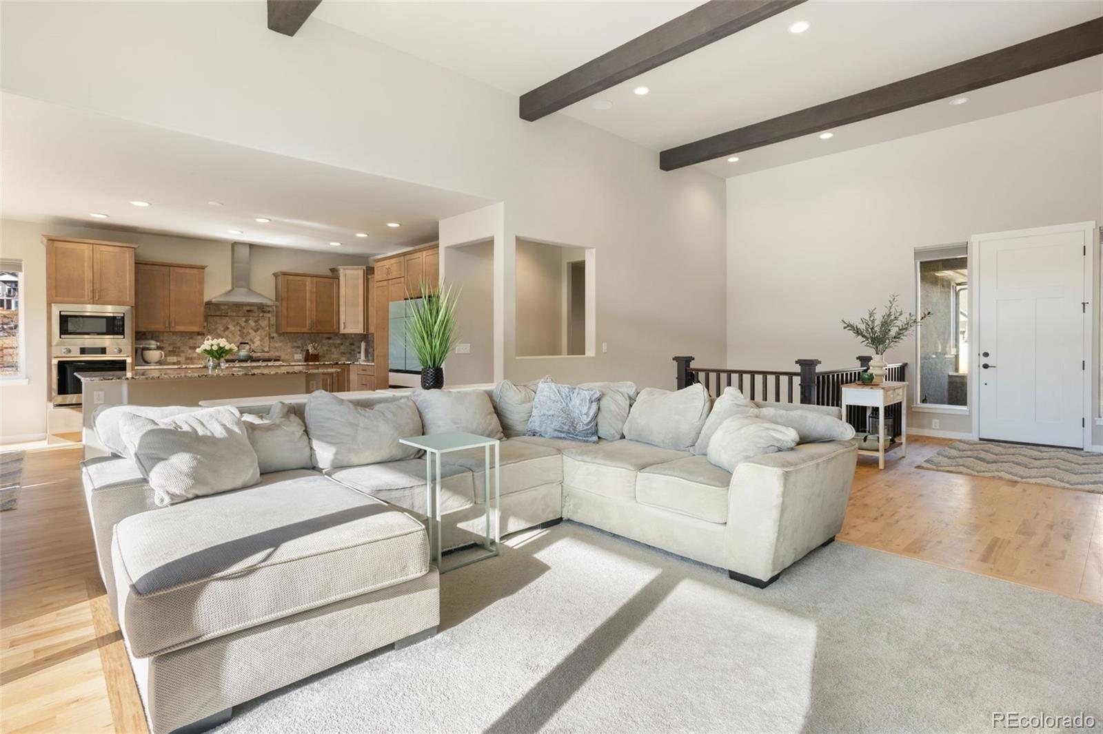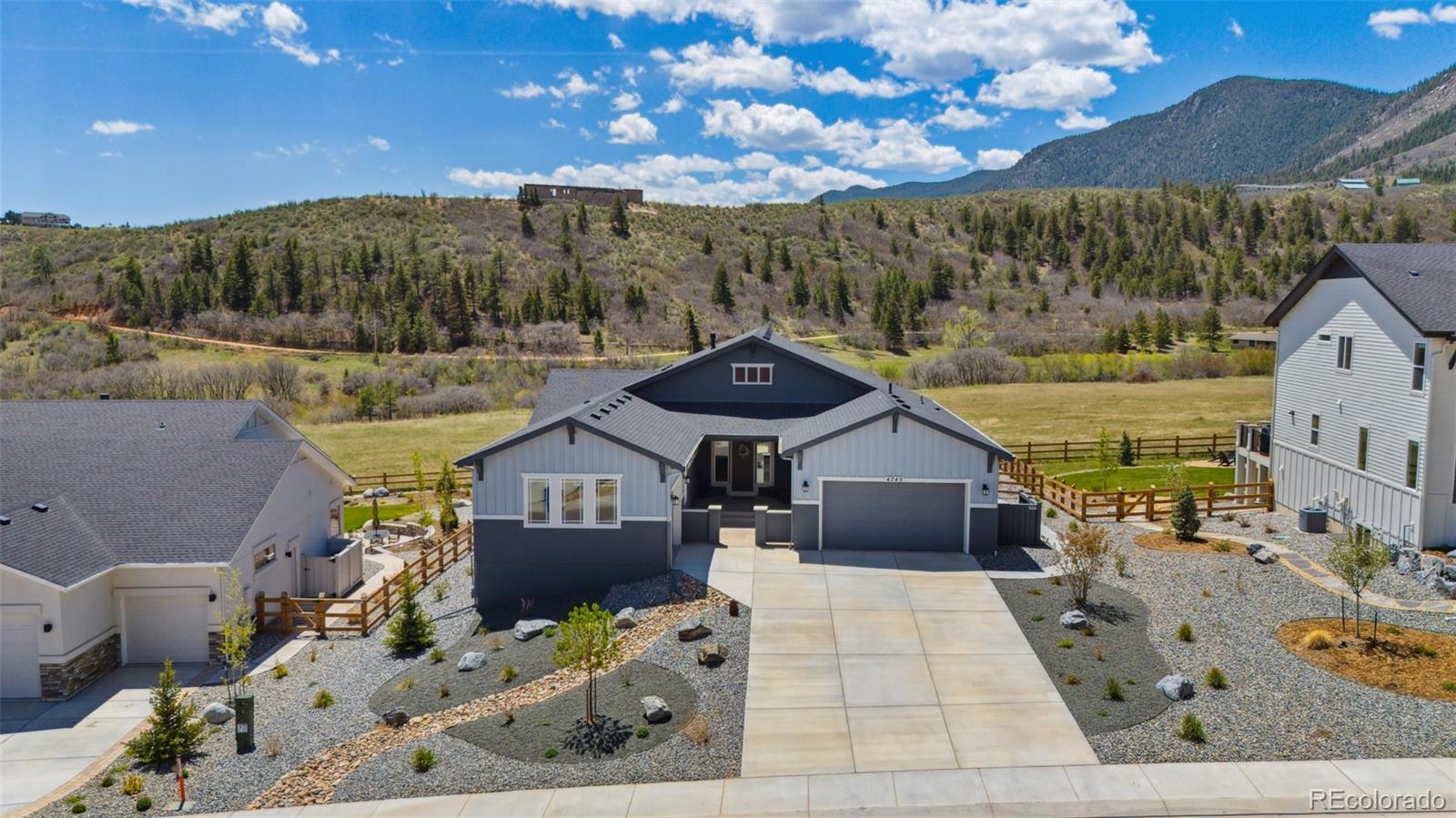 Enjoy panoramic views of the Colorado landscape throughout the main level! Explore this exceptional 4,598 sq ft custom home built in 2023 by Vantage Homes, perfectly positioned to capture private, unobstructed views of knolls, hills, and lush vegetation. Designed with flexibility, this home features 4 bedrooms, 4 baths, and a main level in-law suite with its own 1-car garage, private entrance, full bath, walk-in closet, and interior locking door for privacy. The open-concept main level offers white oak flooring, extra-wide stairs, 8’ doors throughout, beamed ceilings in the entry and living room, a floor-to-ceiling stone fireplace, custom inset rug, and floor outlets. The chef’s kitchen showcases quartz countertops, tumbled travertine backsplash, gas range with hood, soft-close cabinetry, porcelain farmhouse sink, large island, and hidden walk-in pantry. Stylish barn doors provide privacy by separating the main level living areas from both the primary suite and the in-law suite. The primary suite includes a spacious bath with dual vanities, a large walk-in shower with bench, and a peaceful, private setting. A 10x8 mudroom and laundry with window and sink enhance daily function. The finished lower level adds two bedrooms, a full bath, a large family room, ample storage, and a sleek wet bar with quartz counters, sink, floating shelves, and wall-mounted cabinets. Outdoor living features a 19x20 covered Trex deck with metal railing, secure gate, lighting, water spigot, gas valve, and outlets. In the backyard, a dedicated pad is prepped for a hot tub with wiring sleeve. The fully fenced yard backs to scenic open space. A 13x21 covered front porch with outlets adds to the outdoor charm, combined with a low-maintenance stucco exterior with eave outlets for easy holiday lighting. Welcome home to a vibrant community that offers hiking trails, a lake for fishing and canoeing, concerts, movie nights, and seasonal events. Enjoy a rare blend of comfort, privacy, and lifestyle!