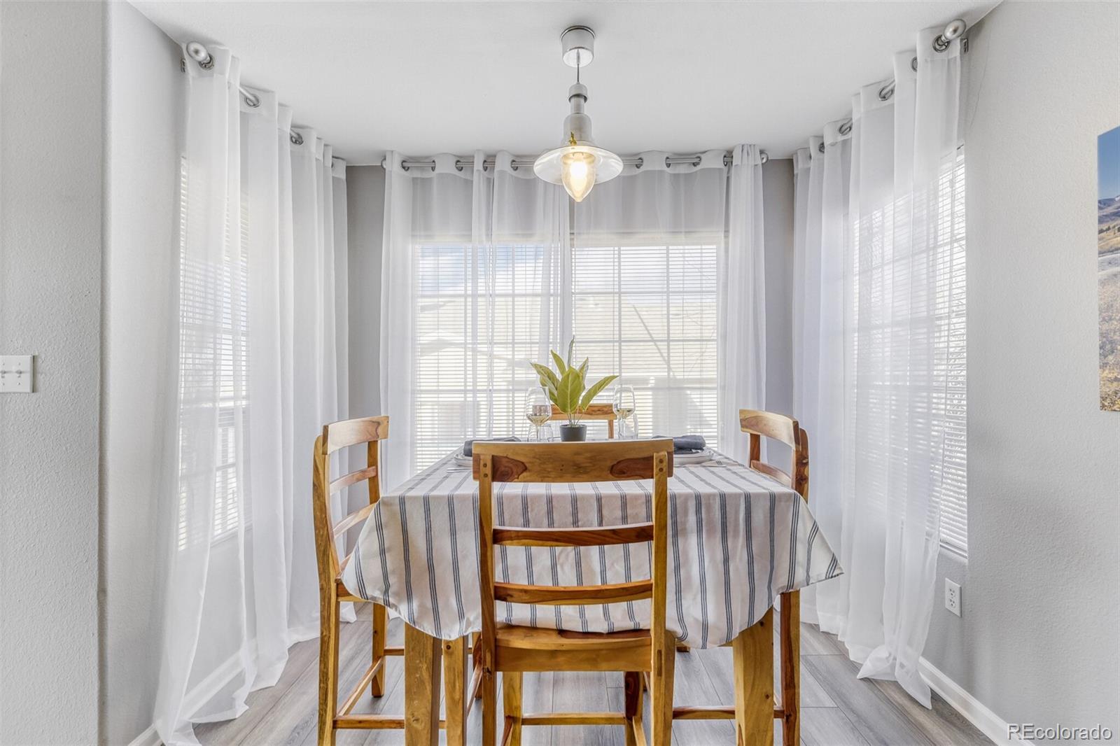 Welcome home to this beautifully updated top-floor condo where mountain views and modern comfort come together. Set in the desirable Canyon Ranch community, this light-filled 2-bedroom, 2-bath home offers vaulted ceilings and sweeping views of the foothills and Mount Evans—best enjoyed from your private balcony. Inside, you’ll find fresh paint throughout along with new luxury vinyl laminate and carpet installed in 2024, giving the home a clean, contemporary feel. Updated light fixtures add a polished, modern touch throughout the space. The kitchen has been thoughtfully refreshed with newly painted cabinetry in a striking navy blue, perfectly complementing the open layout and making the space both stylish and functional. The flexible floor plan features two spacious bedrooms, each with its own full bathroom—ideal for roommates, guests, or a home office setup. The primary suite includes an en-suite bath and generous closet space, while the second bedroom is highlighted by those unforgettable mountain views. Additional perks include in-unit laundry, a detached one-car garage, and water included in the HOA. Canyon Ranch residents enjoy access to a pool, hot tub, clubhouse, fitness center, and ample guest parking, along with full access to Highlands Ranch recreation centers, trails, parks, and open space. With updates already done and a location that’s hard to beat, this move-in-ready condo is the perfect place to settle in and enjoy Colorado living at its best.