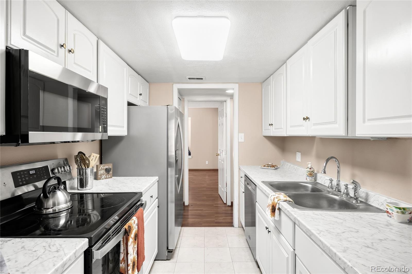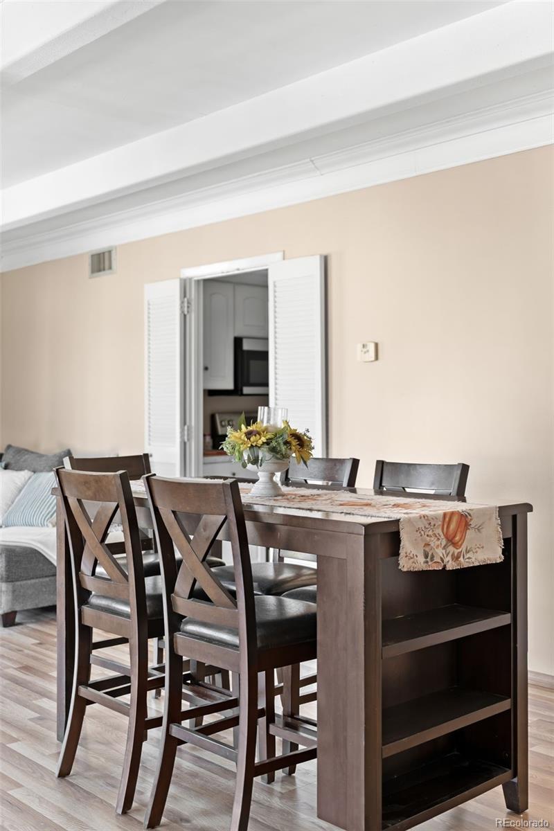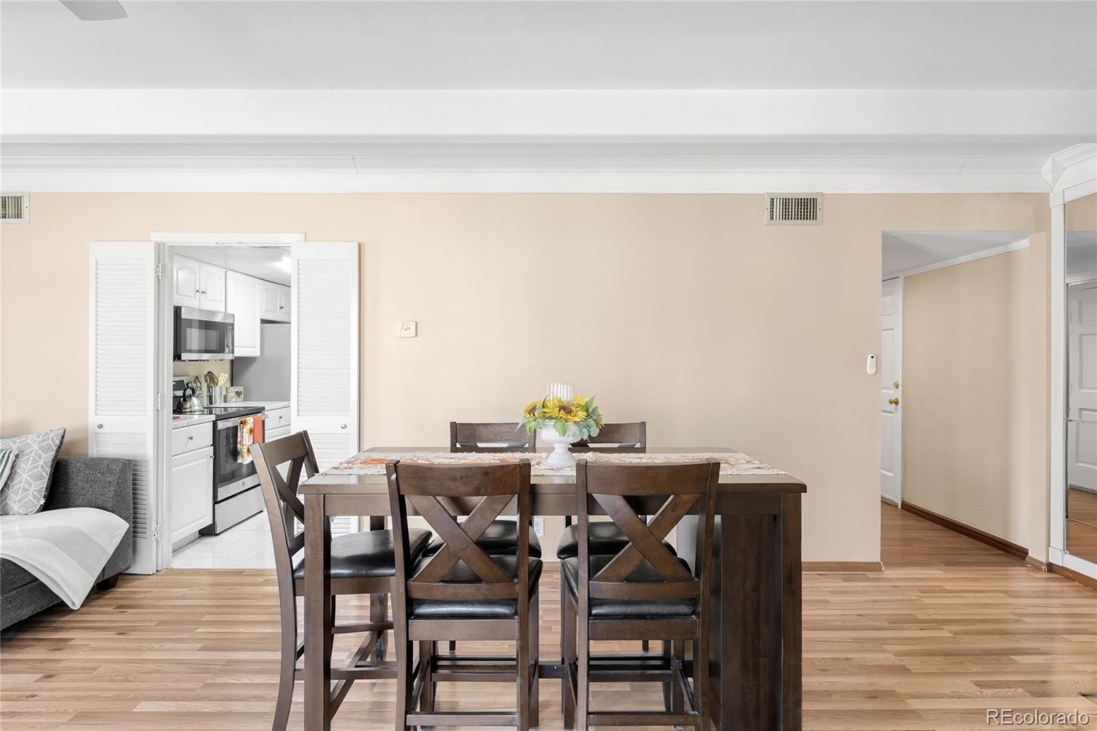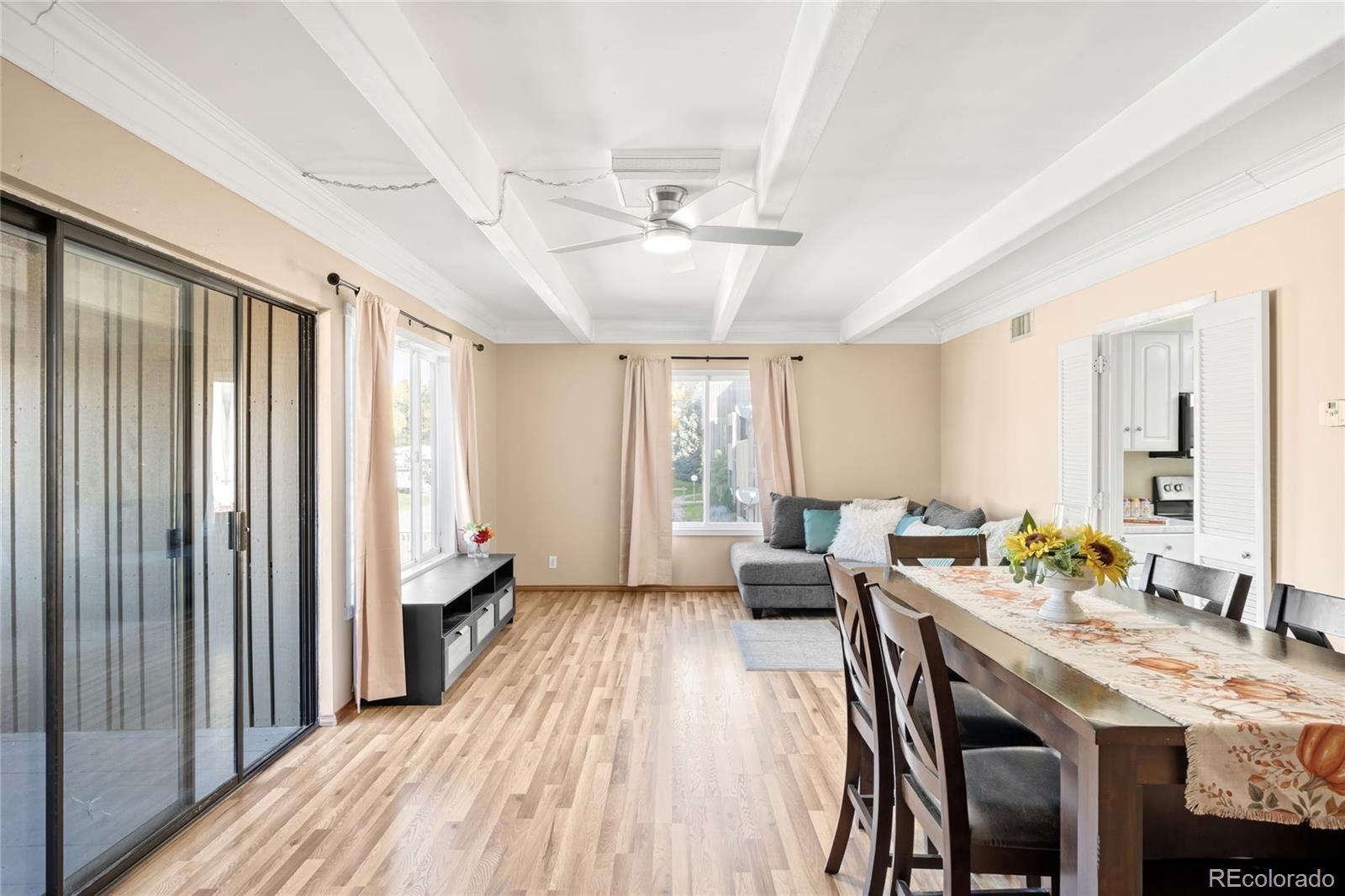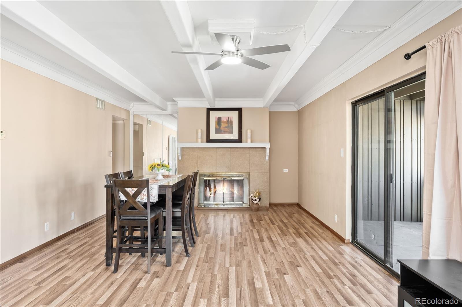 OWNER WILL PAY 6 MONTHS HOA FEES IF UNDER CONTRACT BY END OF 2025. Fresh, easy living starts here. This bright, move-in-ready home comes with a RARE TWO parking spots — including one covered in the laid-back, FHA-approved Dayton Green community, just steps from the communal outdoor hangout space. The open living + dining area delivers cozy-chic vibes with a fireplace and big windows that bring in tons of natural light. The modern kitchen features stainless steel appliances, white cabinetry and newly updated countertops. Both bedrooms are spacious with great closet storage, and ceiling fans + window A/C keep things cool year-round. Enjoy a private covered patio perfect for morning coffee, weekend brunch or unwinding after work. Community perks include a pool, tennis courts and proximity to the High Line Canal Trail nearby, plus quick access to Cherry Creek, cafés, restaurants and shopping. Low-maintenance living and that hard-to-find extra parking make everyday life easier. Perfect for buyers seeking style, convenience and a great location — and a great option for rental or roommate potential too.