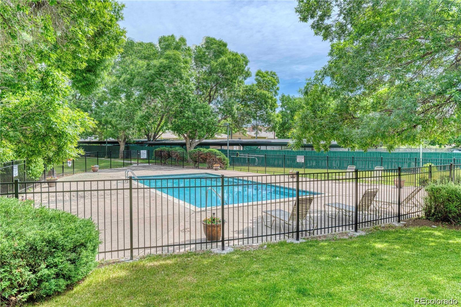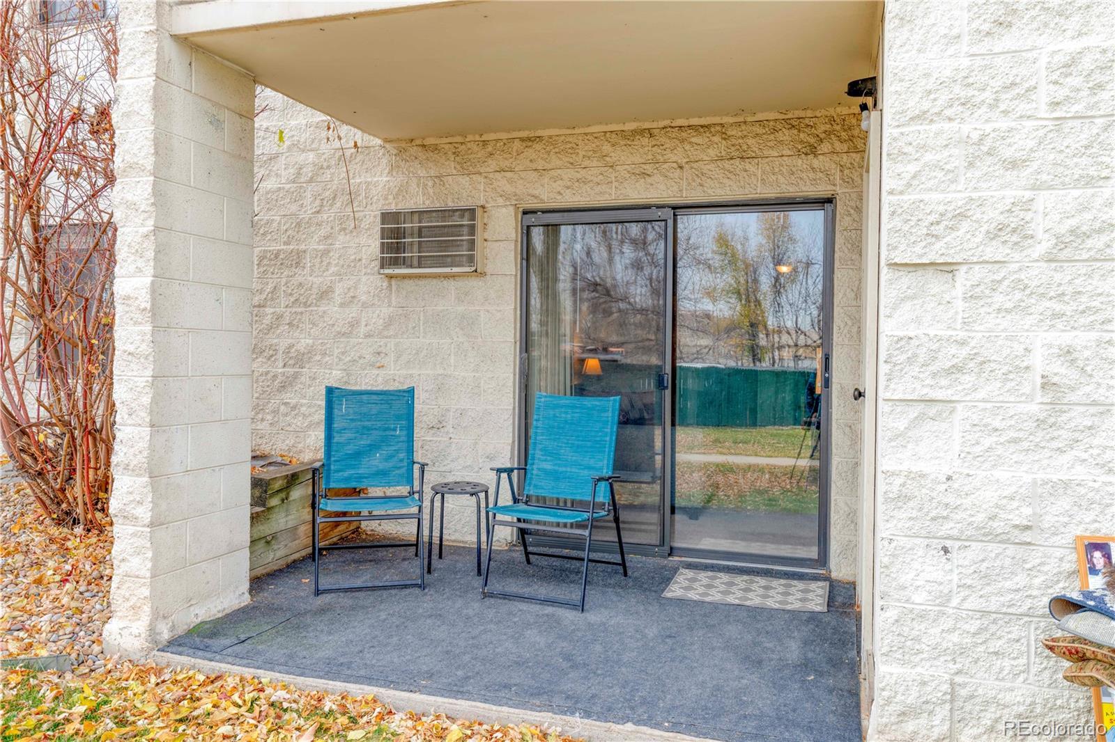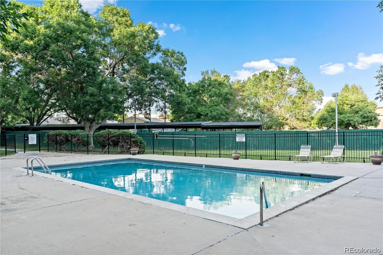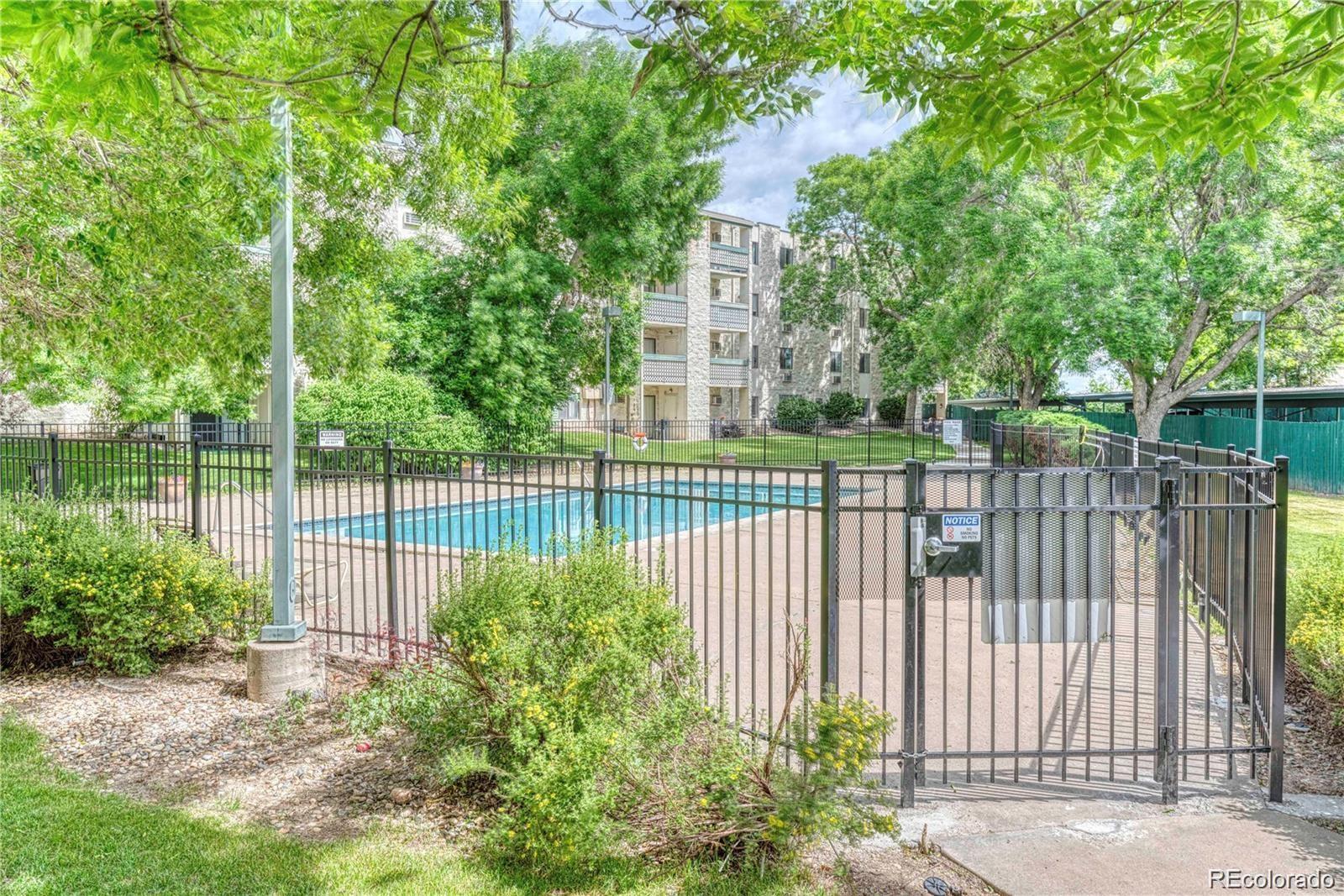 Welcome to this well-kept 1 bedroom 1 bathroom condo on ground floor in a tucked away quiet community and very walkable to the redeveloped 38th Ave corridor and Wadsworth Blvd shops! Enter unit from either the secure building entrance or right off your own patio. A deeded covered parking spot and plenty of additional parking just steps from door. A private storage shed just off the patio keeps items close. A view of the complex's pool from patio makes summer heat fun and is only available to the community. The open dining to living room makes this condo spacious. Each floor has its own laundry facilities and is located only a few steps down the hallway. Prices right and should be seen! Quick possession if available!