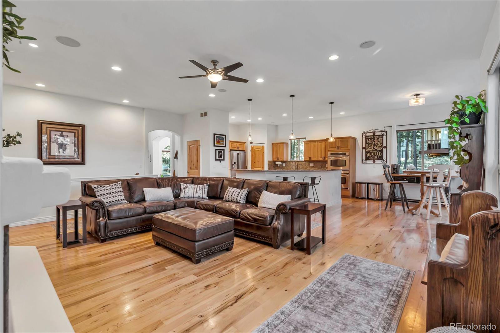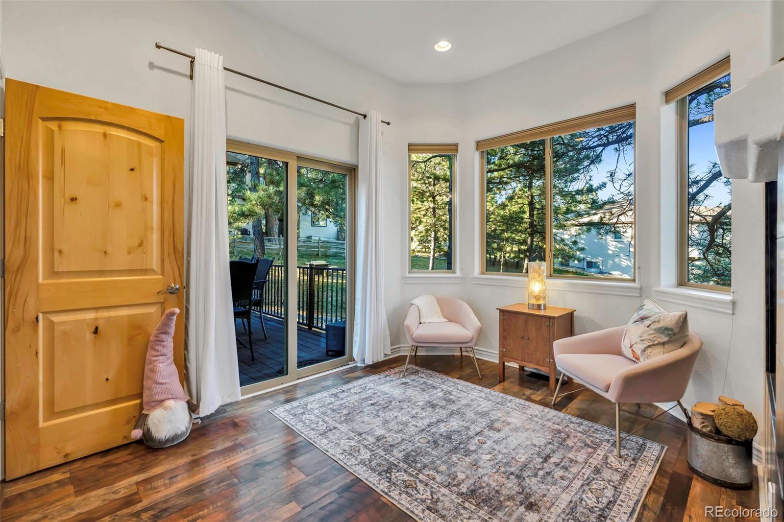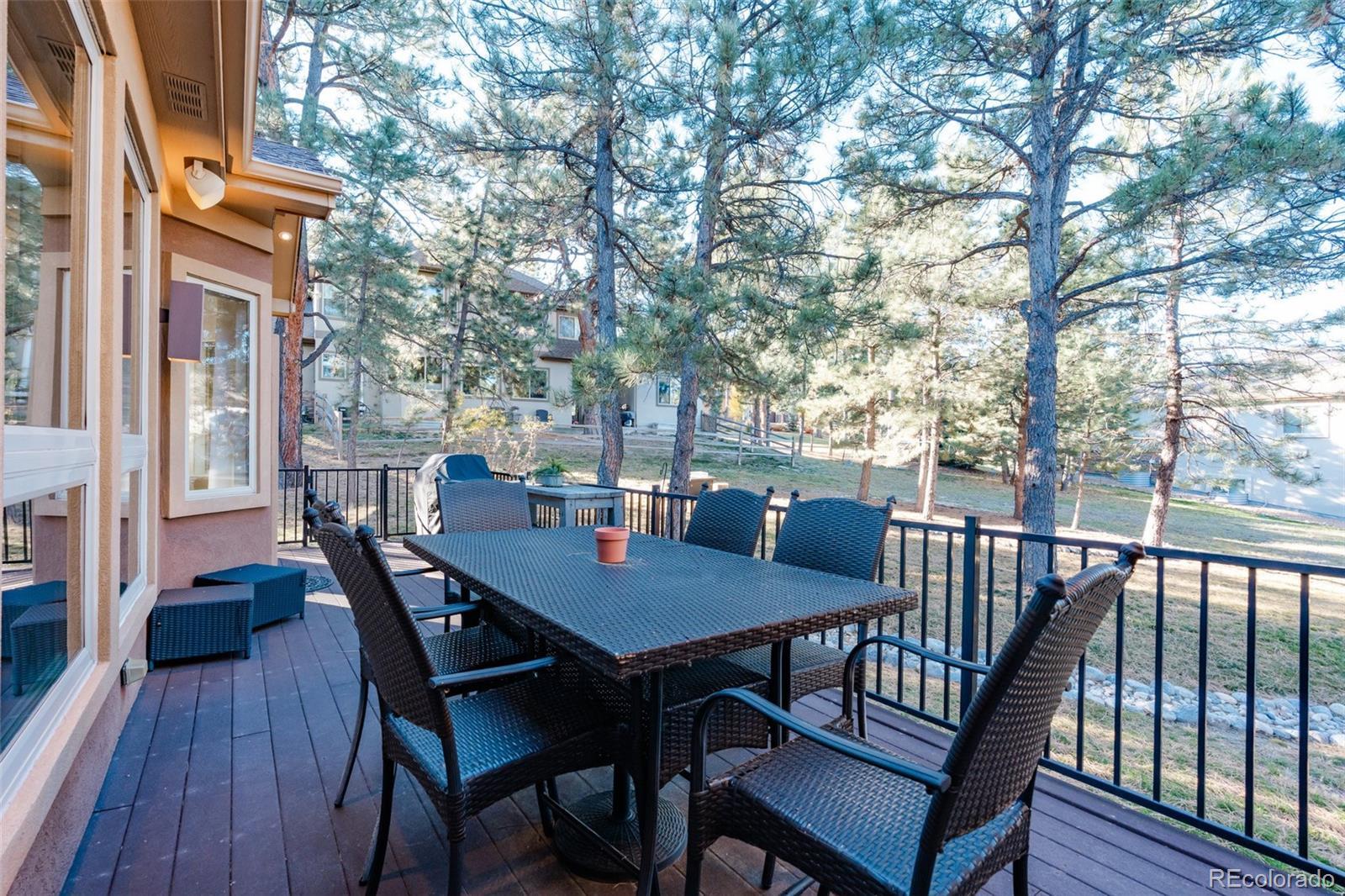 Set on a private, tree-filled .54-acre lot in the desirable Hidden Forest neighborhood, this spacious ranch home offers main-level living and an ideal blend of comfort, style, and functionality. The gourmet kitchen features hardwood floors, stainless steel appliances including a double oven and gas cooktop, granite countertops, a center island, a second island with bar seating and pendant lighting, pantry and a bright breakfast nook with deck access. The main-floor primary suite includes luxury vinyl flooring, a sitting area with a double-sided fireplace, private deck access, serene wooded views and a spacious walk-in closet w/custom built-ins. The 5-piece primary bath offers dual sinks, granite counters, soaking tub, water closet & a tiled walk-in shower. Two additional main-level bedrooms share a full bath w/granite counters & tile finishes. A dedicated office features French doors, built-in cabinetry & desk, & hardwood flooring w/custom inlay. The living room includes hardwood flooring, large windows, a gas fireplace w/tile surround, built-in entertainment center & ceiling fan. A formal dining room w/custom inlay flooring & large windows completes the main level. Outdoor living includes a large Trex deck w/gas line for grilling & a second gas line to the fire-pit area—ideal for quiet evenings or entertaining. The finished lower level offers impressive recreation spaces including a large wet bar w/granite, glass shelving, cabinetry & bar seating. Spacious media & game areas provide room for theater seating & a pool table. Additional lower-level amenities include a bedroom with garden-level windows, a full bath w/soaking tub & walk-in shower, and a dedicated fitness room with mirrors. A rare combination of privacy, thoughtful design, and flexible living and entertaining space in one of Larkspur’s most desirable neighborhoods. Near the Golf Club at Bear Dance, a true mountain-style golf experience which consistently ranks among Colorado’s top public-access courses.
