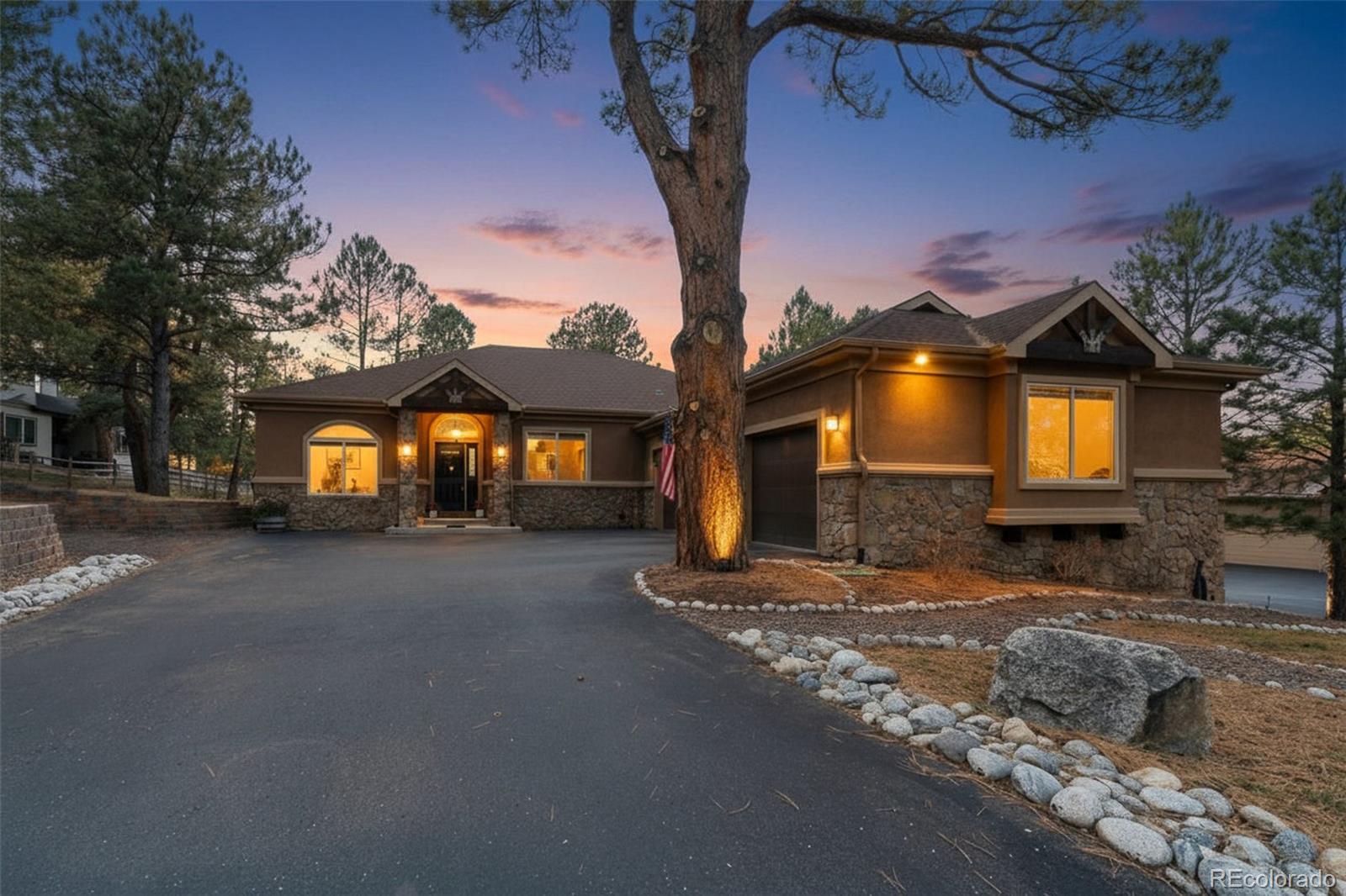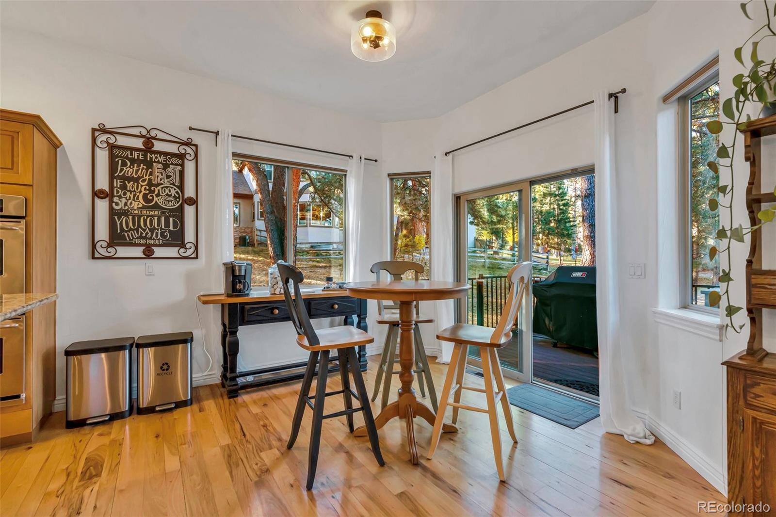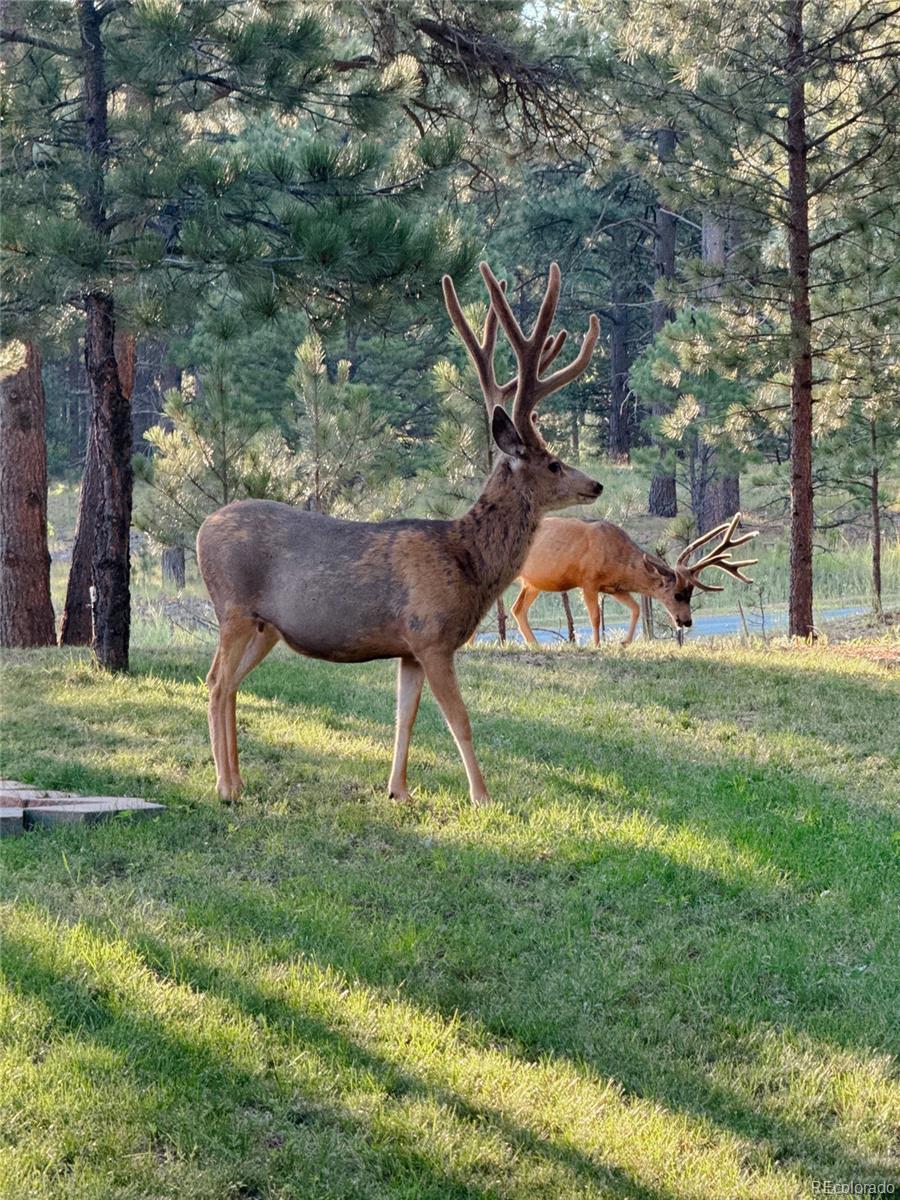 Set on a private, tree-filled .54-acre lot in the desirable Hidden Forest neighborhood, this spacious ranch home offers main-level living and an ideal blend of comfort, style, and functionality. The gourmet kitchen features hardwood floors, stainless steel appliances including a double oven and gas cooktop, granite countertops, a center island, a second island with bar seating and pendant lighting, pantry and a bright breakfast nook with deck access. The main-floor primary suite includes luxury vinyl flooring, a sitting area with a double-sided fireplace, private deck access, serene wooded views and a spacious walk-in closet w/custom built-ins. The 5-piece primary bath offers dual sinks, granite counters, soaking tub, water closet & a tiled walk-in shower. Two additional main-level bedrooms share a full bath w/granite counters & tile finishes. A dedicated office features French doors, built-in cabinetry & desk, & hardwood flooring w/custom inlay. The living room includes hardwood flooring, large windows, a gas fireplace w/tile surround, built-in entertainment center & ceiling fan. A formal dining room w/custom inlay flooring & large windows completes the main level. Outdoor living includes a large Trex deck w/gas line for grilling & a second gas line to the fire-pit area—ideal for quiet evenings or entertaining. The finished lower level offers impressive recreation spaces including a large wet bar w/granite, glass shelving, cabinetry & bar seating. Spacious media & game areas provide room for theater seating & a pool table. Additional lower-level amenities include a bedroom with garden-level windows, a full bath w/soaking tub & walk-in shower, and a dedicated fitness room with mirrors. A rare combination of privacy, thoughtful design, and flexible living and entertaining space in one of Larkspur’s most desirable neighborhoods. Near the Golf Club at Bear Dance, a true mountain-style golf experience which consistently ranks among Colorado’s top public-access courses.