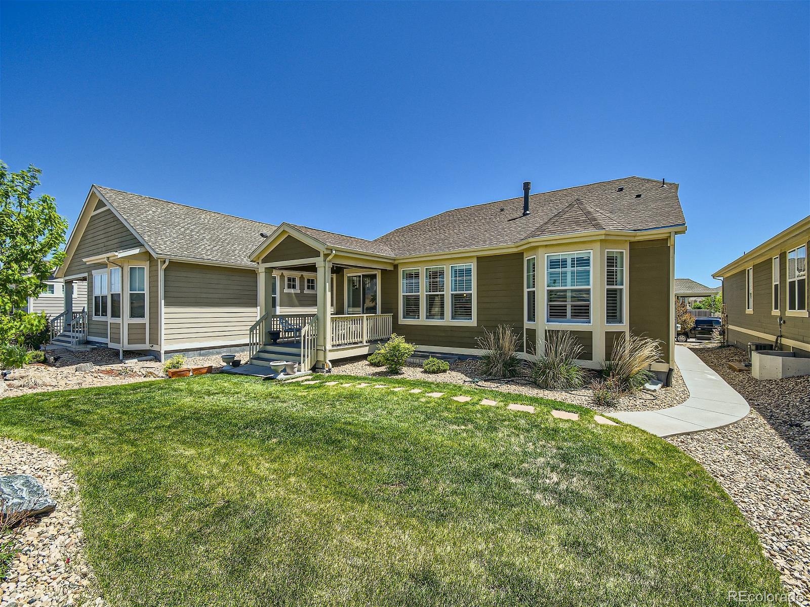 This beautifully cared for home was built in 2018 with numerous improvements and upgrades. The vibrant community, designed for active adults aged 55+, offers an array of amenities including a restaurant, clubhouse, golf course, indoor and outdoor pools, tennis, pickleball, and more! Step inside this east-facing home to experience the open-concept kitchen/living area and covered back porch. The spacious gourmet kitchen is perfect for entertaining and boasts granite countertops, stainless steel appliances, large island with seating, double oven and 5 burner gas range, ample storage and a convenient walk-in pantry. The luxurious primary bedroom featuring a raised tray ceiling, bay window, large walk-in closet and a 4-piece bath with a large shower complete with bench seating. An additional bedroom and office on the main level gives you ample space for guests and remote work. Additional features include a central A/C, ceiling fans, conveniently located laundry room and mudroom. The full unfinished basement, has 1728 square feet, and provides endless possibilities for expansion and storage. Conveniently located less than 30 minutes from Denver and 20 minutes from Denver International Airport. See floor plan in supplements. Directions