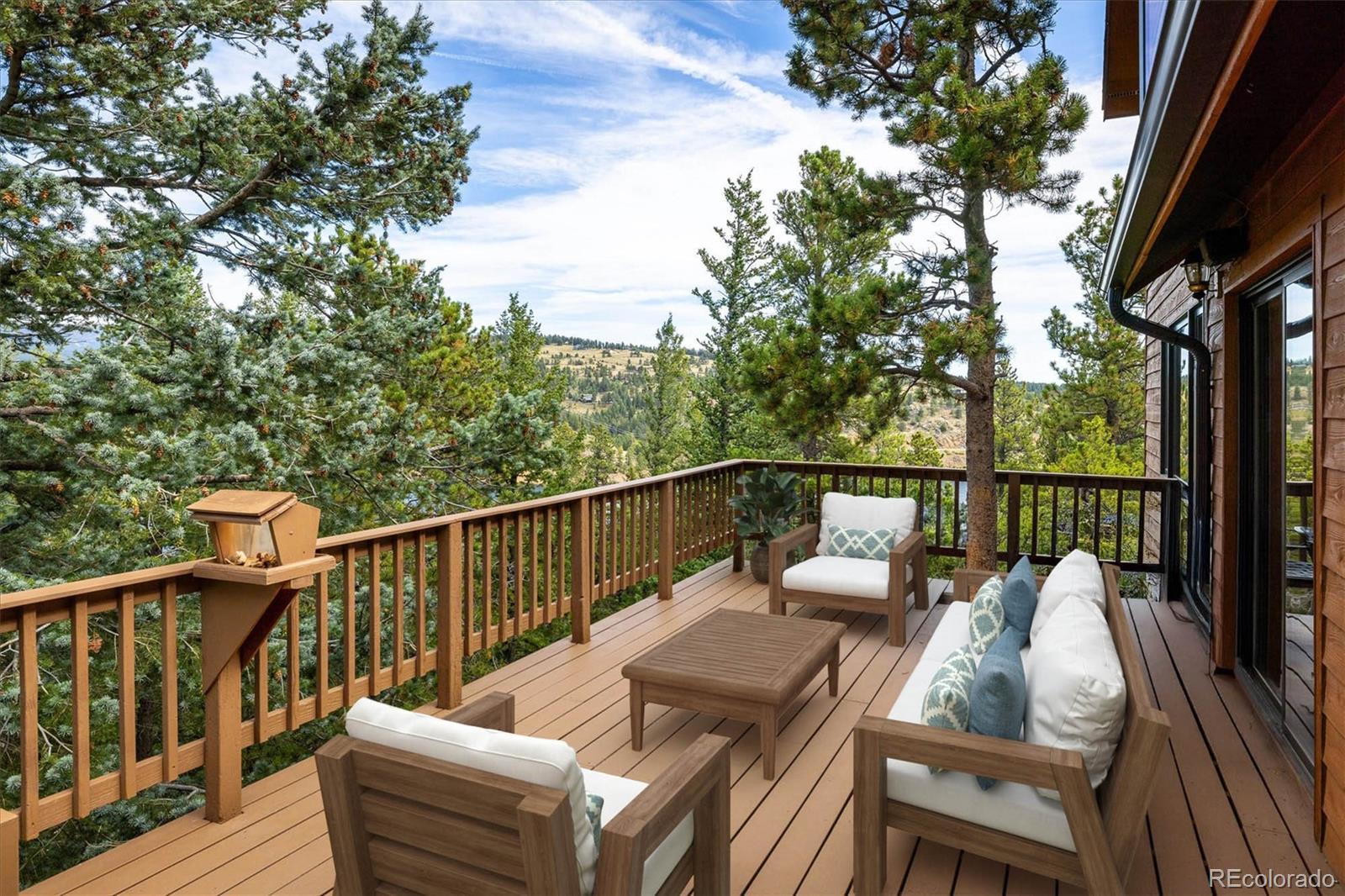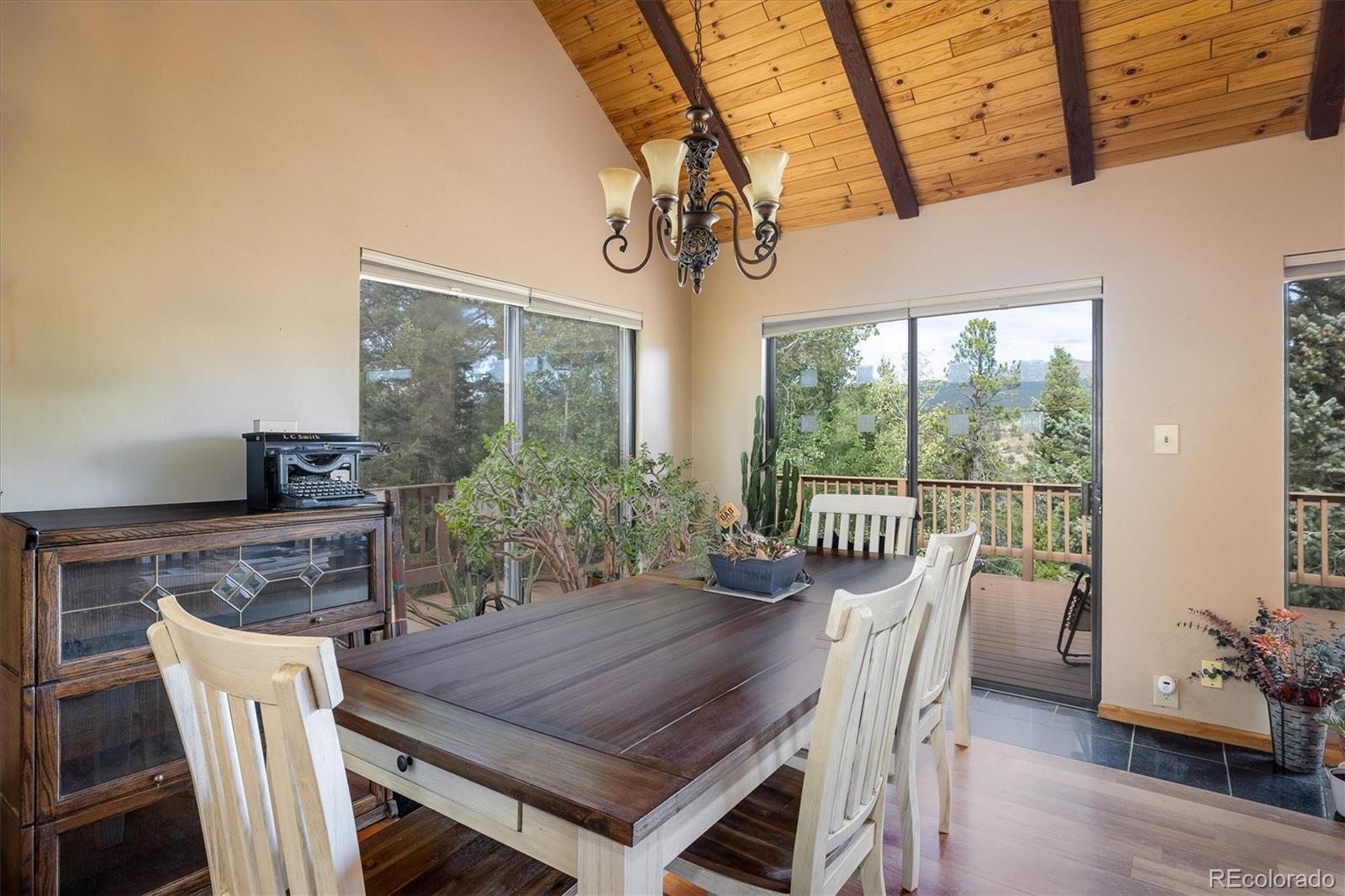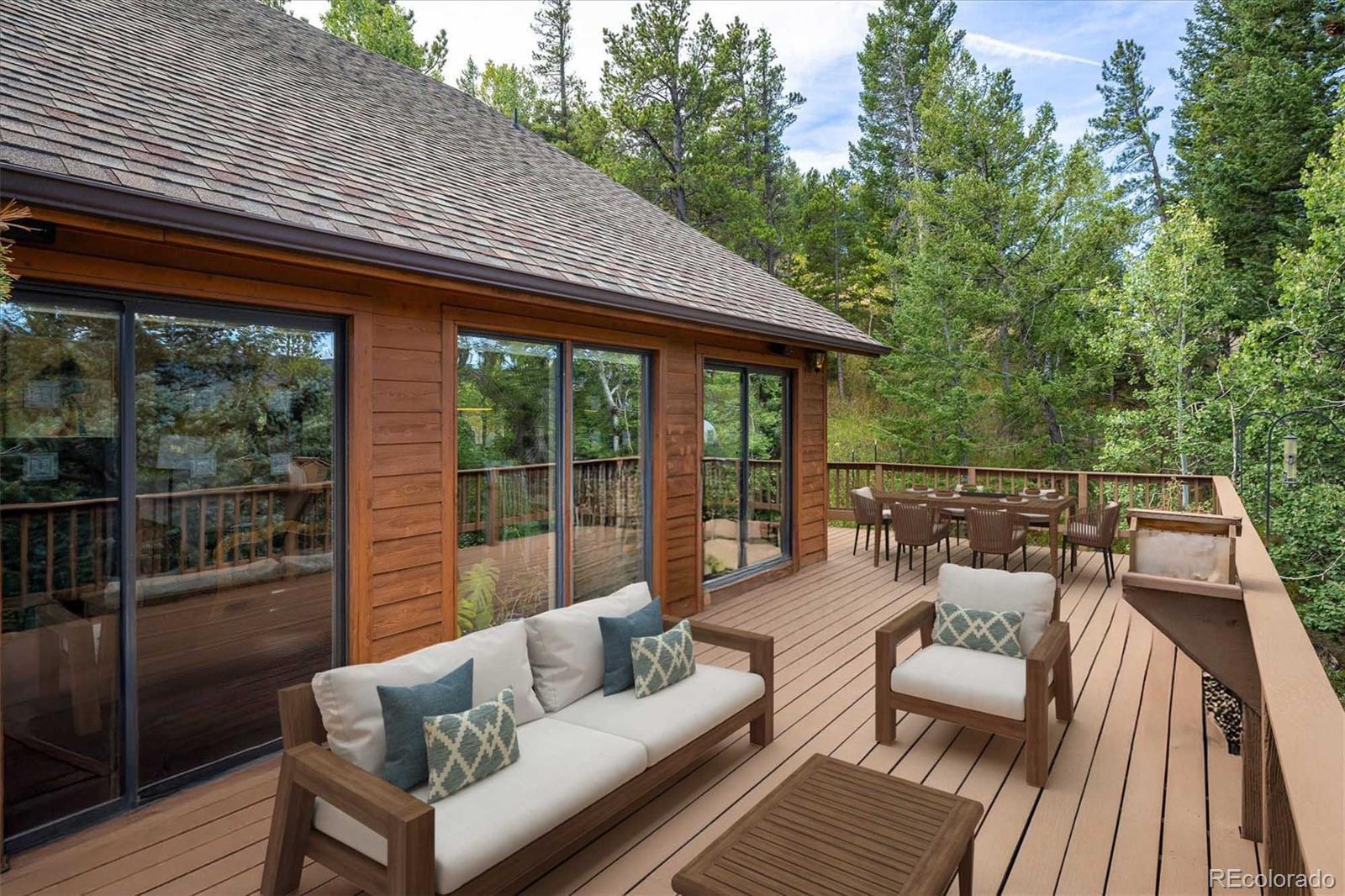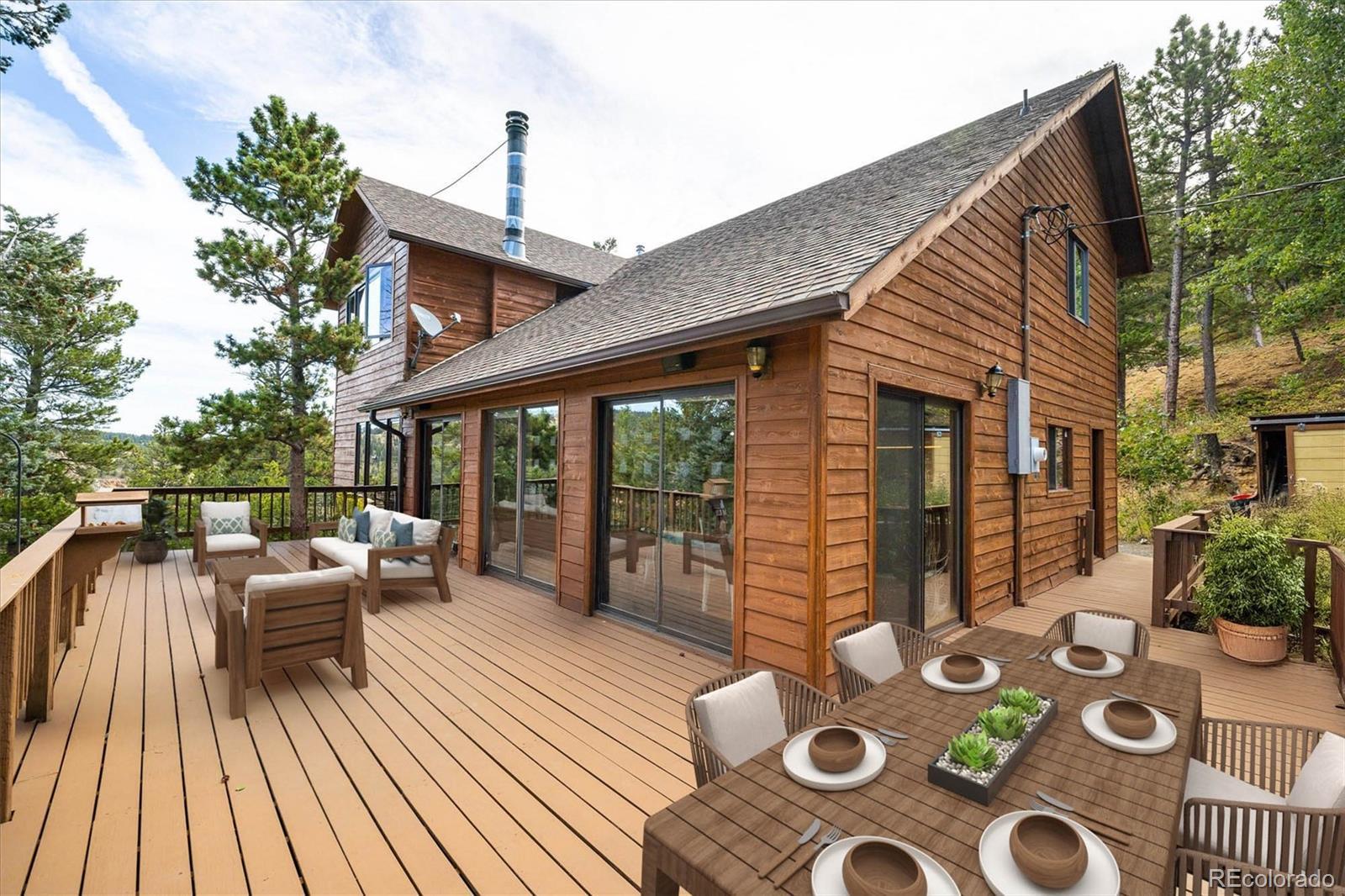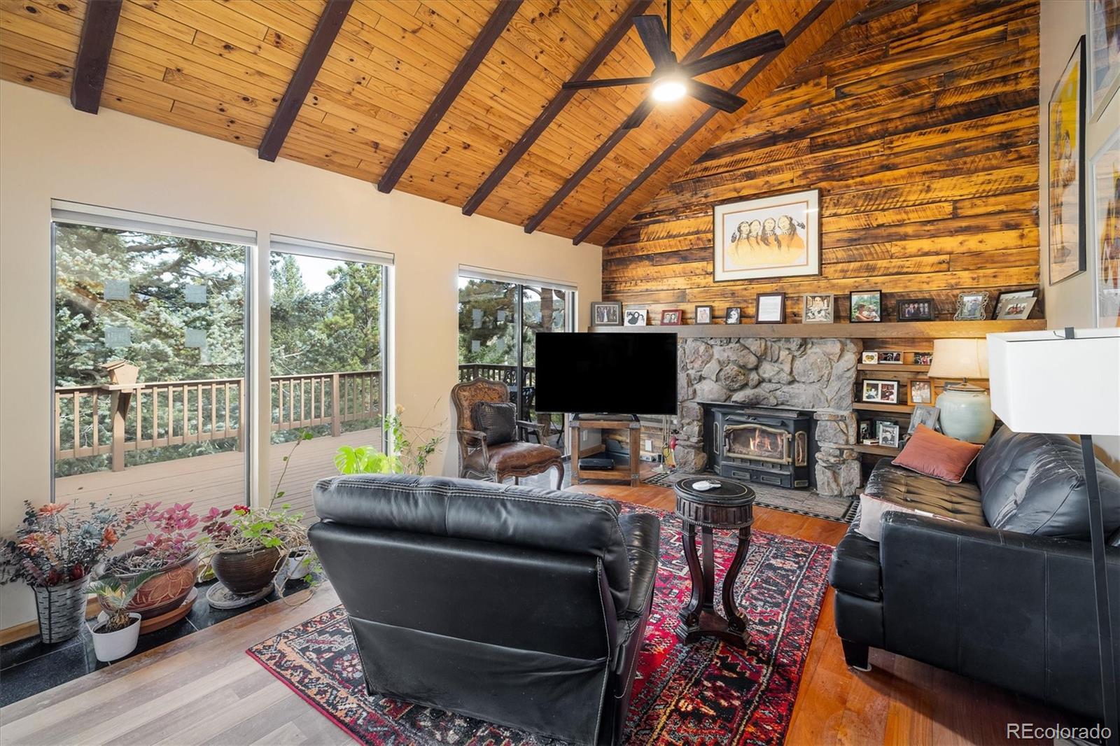 Colorado Mountain Home - Perched above the charming town of Nederland, this spectacular home showcases million-dollar views of the Continental Divide and the sparkling lake below. Inside, the open floor plan features vaulted, beamed ceilings and a striking stone fireplace as its centerpiece. The kitchen is appointed with granite countertops, new appliances and gorgeous mahogany cabinetry. Custom woodwork adds character throughout the home, including a fantastic built-in bookcase, while newer windows frame forested hillsides and stunning Rocky Mountain views. The upper-level primary suite offers high ceilings and a cozy wood stove, creating the perfect retreat. Step outside to more than 650 sq ft of Brazilian ironwood decking—an ideal private setting for dining, relaxing and taking in Colorado’s ever-changing sunsets before the night sky fills with stars that seem almost within reach. Blending artistry and functionality, this mountain home is perfectly situated for world-class hiking, mountain biking and skiing at Eldora Mountain Resort—just minutes away. Come live where you play.