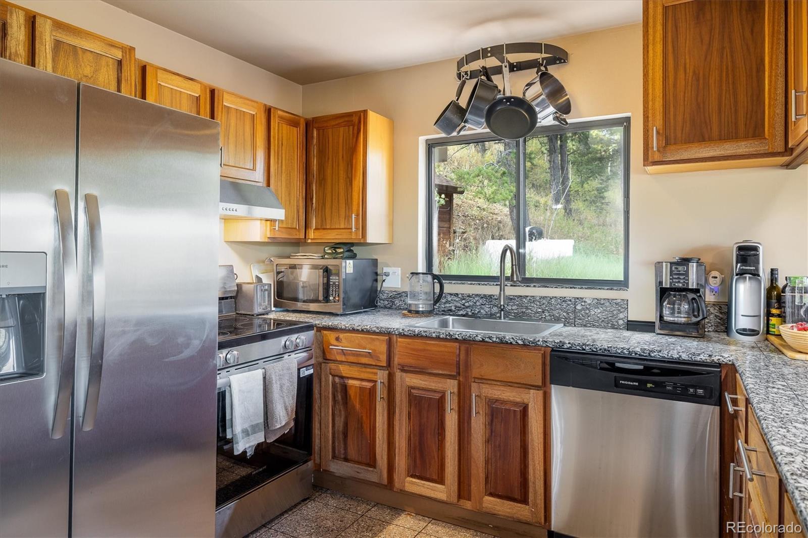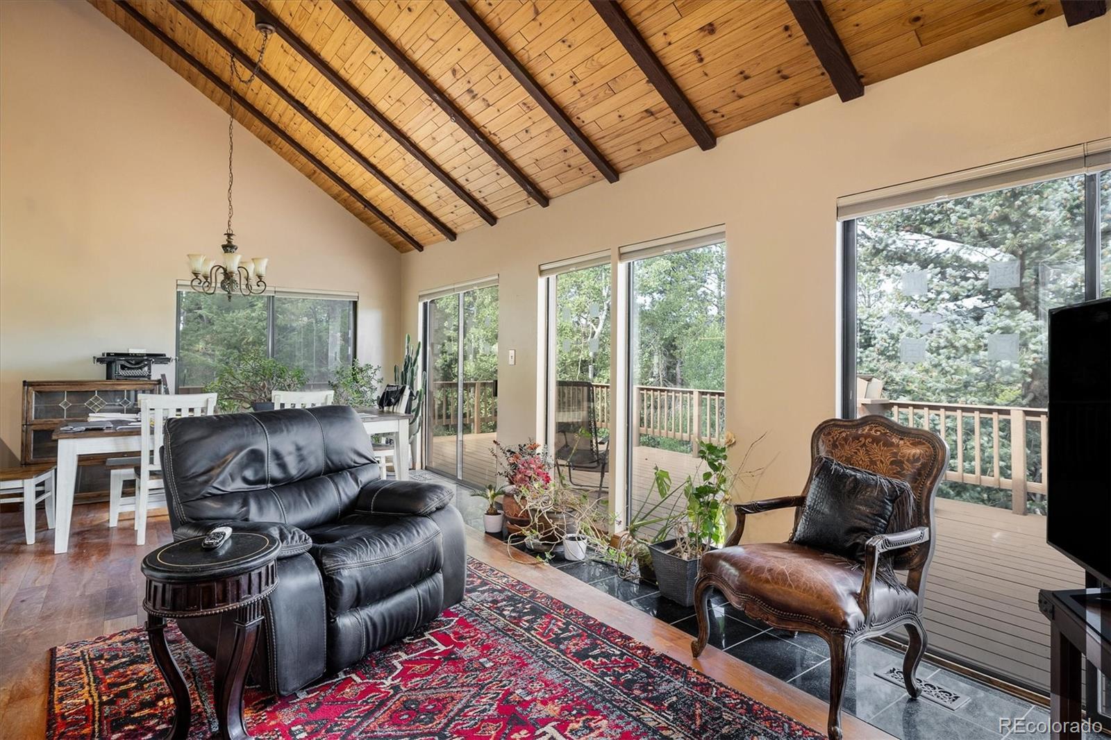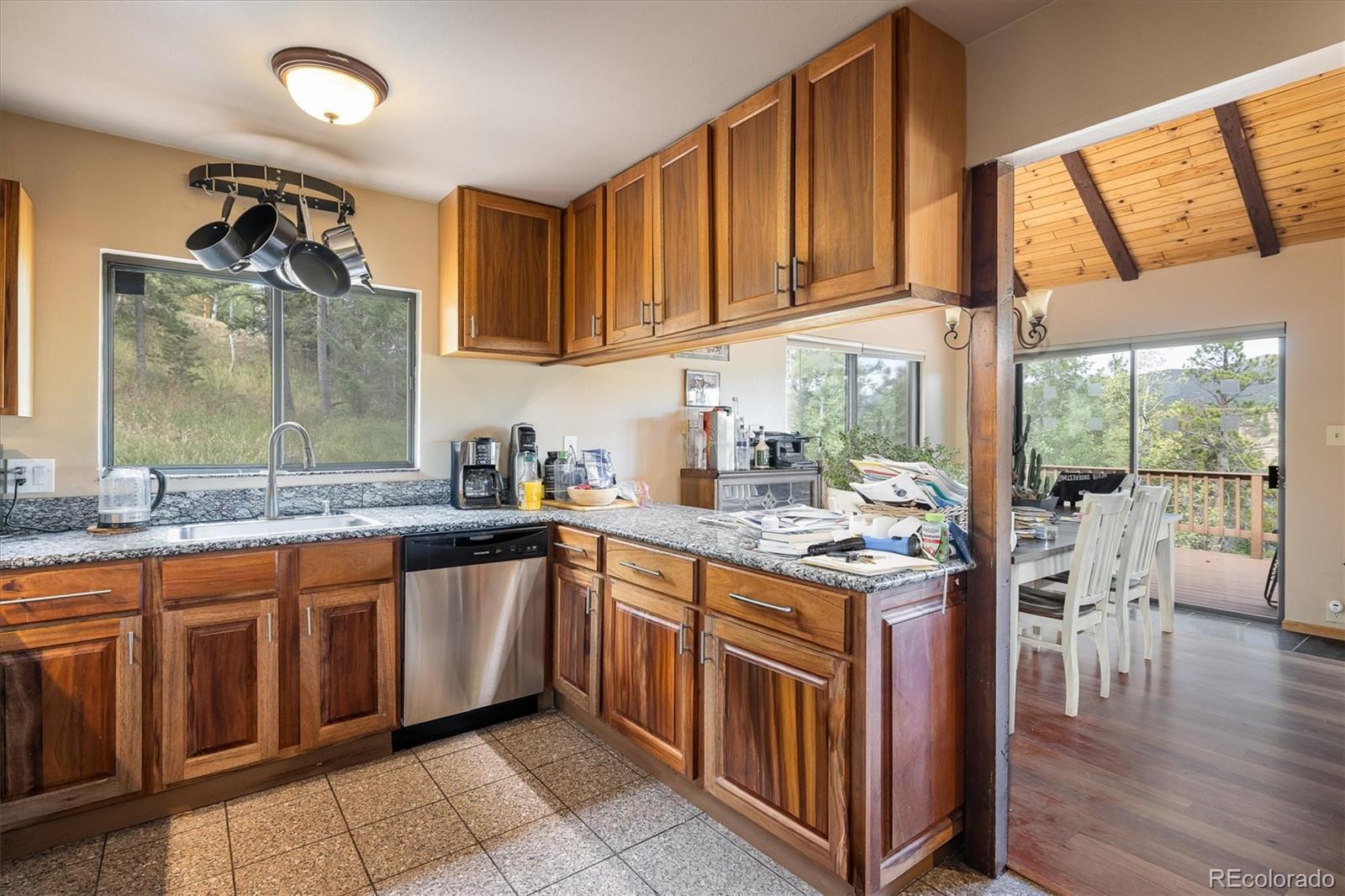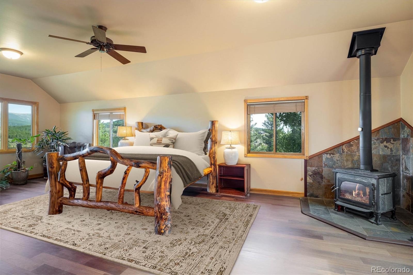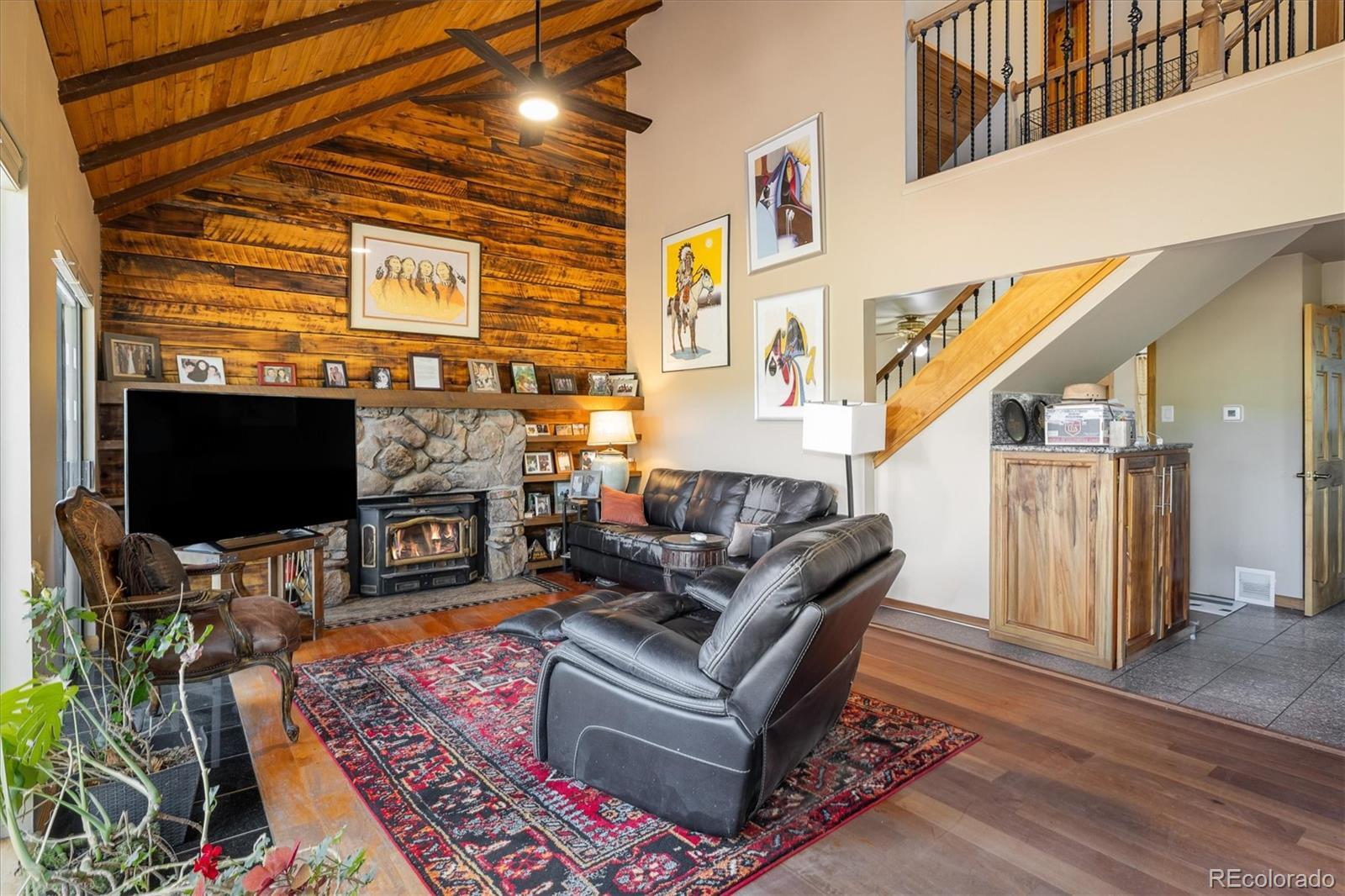 Colorado Mountain Home - Perched above the charming town of Nederland, this spectacular home showcases million-dollar views of the Continental Divide and the sparkling lake below. Inside, the open floor plan features vaulted, beamed ceilings and a striking stone fireplace as its centerpiece. The kitchen is appointed with granite countertops, new appliances and gorgeous mahogany cabinetry. Custom woodwork adds character throughout the home, including a fantastic built-in bookcase, while newer windows frame forested hillsides and stunning Rocky Mountain views. The upper-level primary suite offers high ceilings and a cozy wood stove, creating the perfect retreat. Step outside to more than 650 sq ft of Brazilian ironwood decking—an ideal private setting for dining, relaxing and taking in Colorado’s ever-changing sunsets before the night sky fills with stars that seem almost within reach. Blending artistry and functionality, this mountain home is perfectly situated for world-class hiking, mountain biking and skiing at Eldora Mountain Resort—just minutes away. Come live where you play.