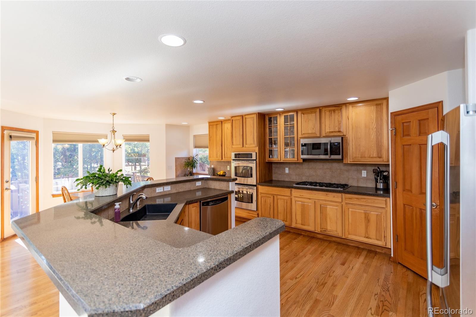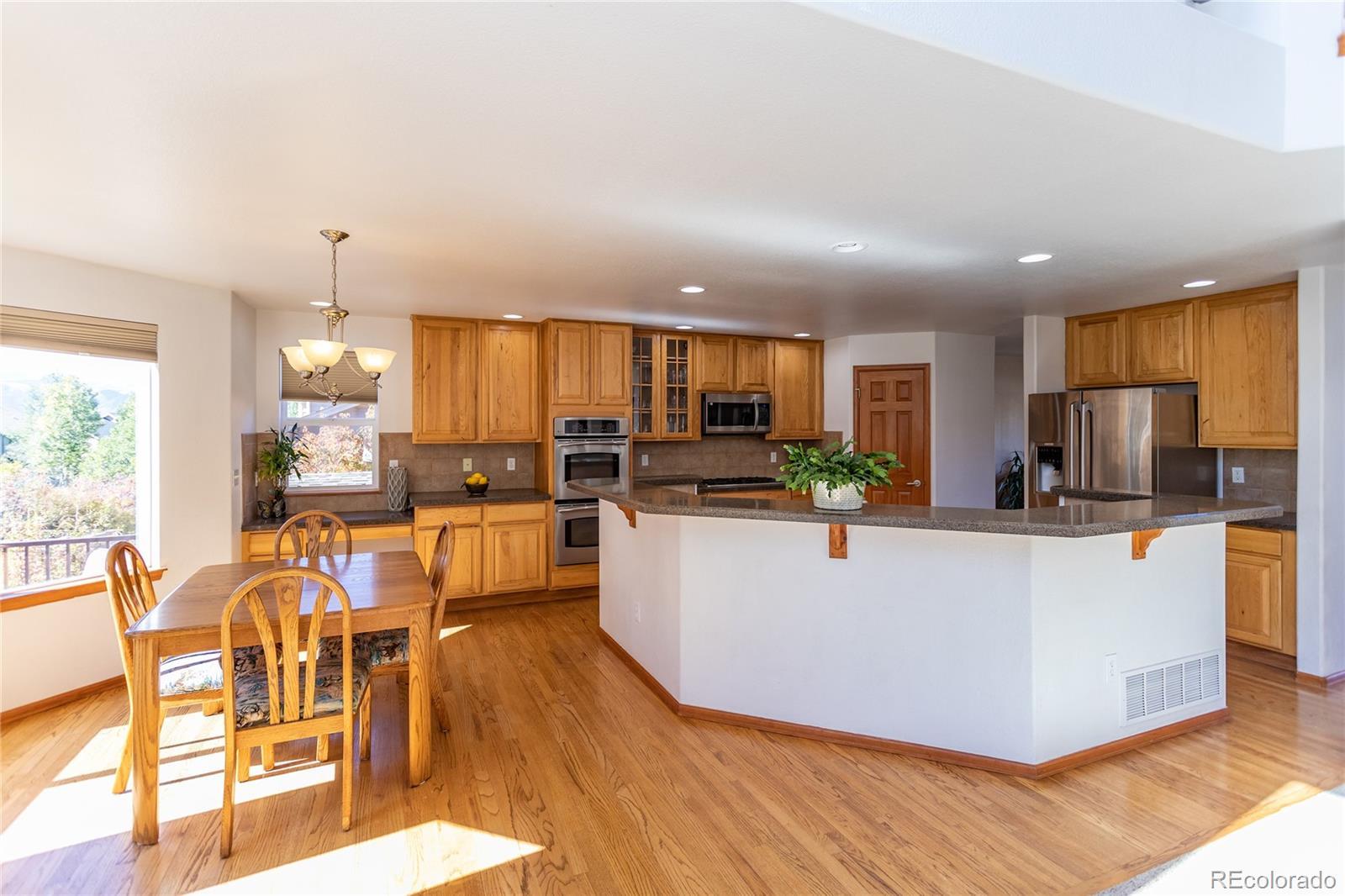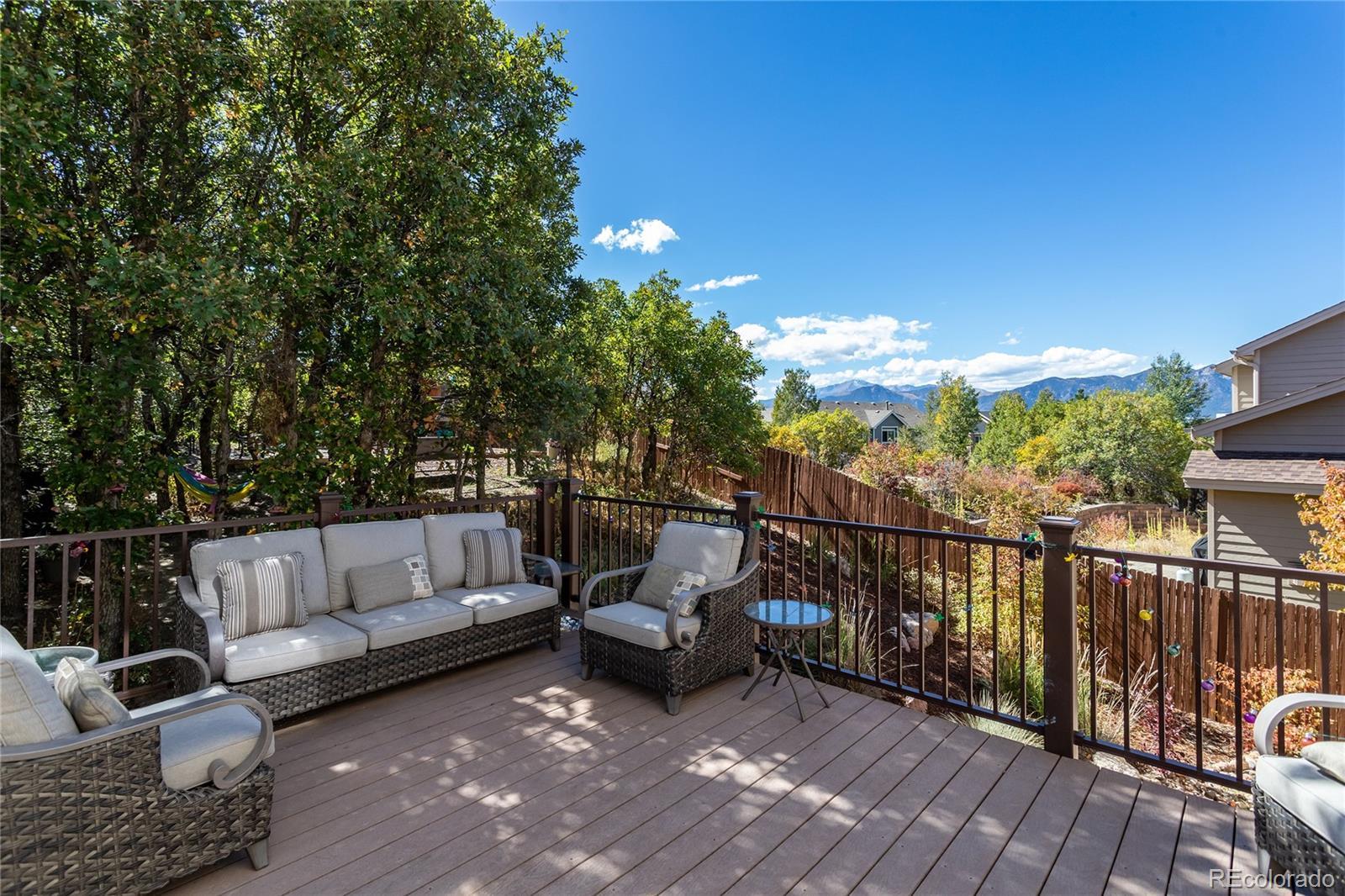 Welcome to your dream home in the highly sought-after District 20 of Colorado Springs! This exquisite 5-bedroom, 4-bath residence offers sweeping views of the Front Range and a lifestyle of comfort, elegance, and functionality. Step inside to a bright and open floor plan that welcomes you with soaring cathedral ceilings, an abundance of natural light streaming through large windows, and a seamless flow into the expansive great room. The heart of the home is the gourmet kitchen complete with a gas cooktop, double ovens, bar seating, and a spacious dining nook, perfect for everyday living or hosting unforgettable gatherings. A formal dining room provides an elegant space for entertaining, while a versatile sixth room with a closet and egress window can serve as an office, guest room, or additional bedroom. Wake up to breathtaking views of Pikes Peak from the serene primary suite, or enjoy peaceful moments from the oversized back deck overlooking the beautifully landscaped, fully fenced yard. Your private outdoor oasis includes a relaxing gazebo with a hot tub ideal for soaking under the star playground equipment with a slide, a tranquil water feature, and plenty of space to roam on the generous .37-acre lot. Additional highlights include: Fresh exterior paint (just 1 year old), lovely front patio with negotiable patio furniture, plenty of large windows with window coverings throughout, spacious bedrooms and updated bathrooms, thoughtfully designed for both everyday comfort and grand entertaining.Don’t miss the opportunity to own this exceptional home that blends luxury, location, and mountain charm. Schedule your private tour today!