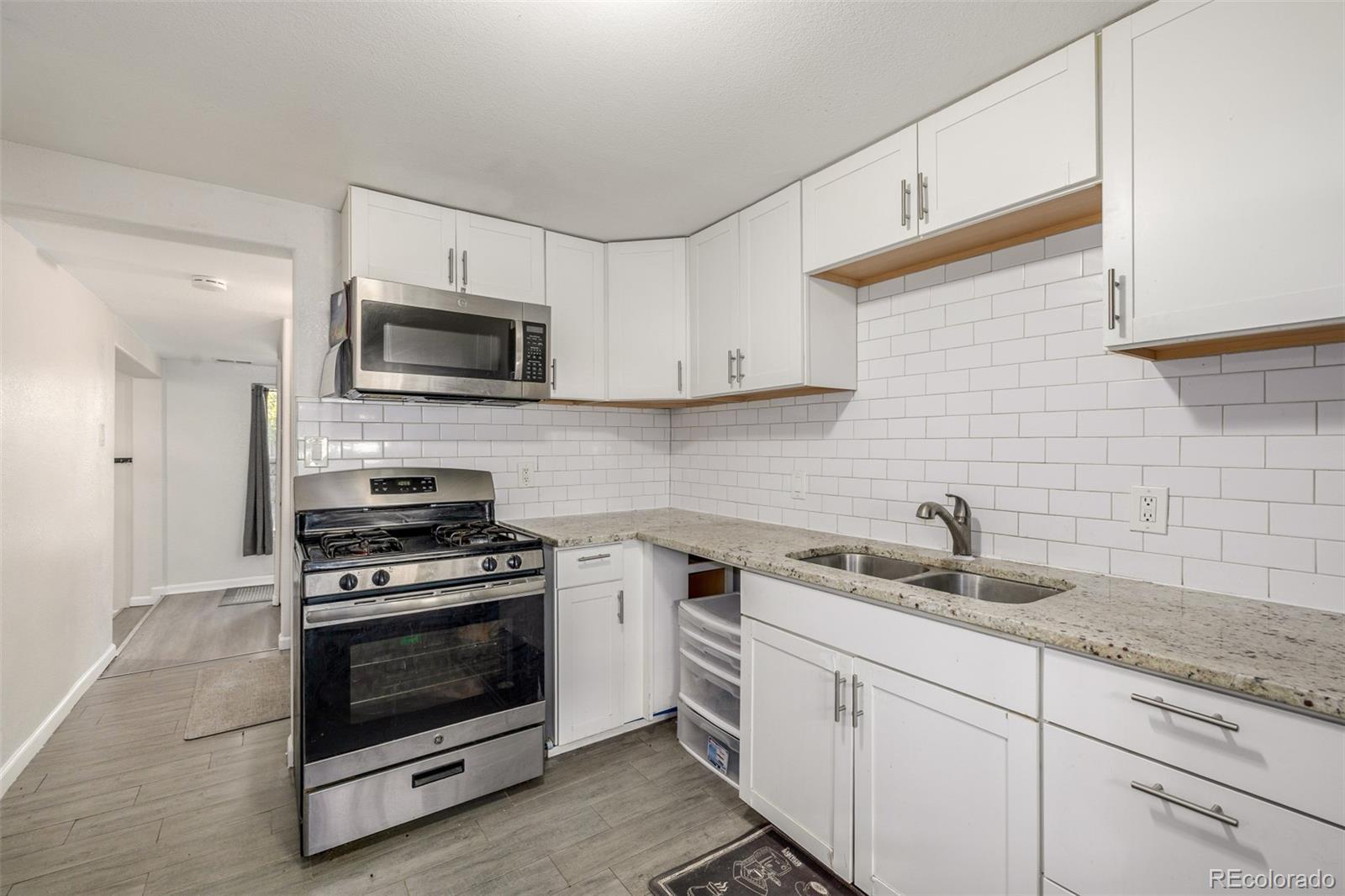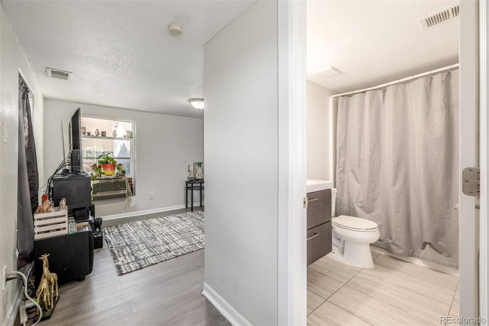 A rare property along the West Colfax corridor brings versatility, design and possibility together on one spacious lot. The main residence offers comfortable one level living with modern updates that are calm and intentional. Wide tone grey plank flooring flows throughout the living space, drawing attention to the refreshed kitchen where white shaker cabinets, stainless appliances and a classic subway tile backsplash establish a crisp, collected mood. Two well-proportioned bedrooms and a full bath in the front home create a balanced layout that supports daily living with ease. Set toward the back of the property, a separate studio style structure opens the door to an entirely different set of opportunities. The layout includes one bedroom and an unfinished bath, ideal for long term rental income, a private workspace, or a living arrangement that maintains independence while still feeling connected. The former 3-car garage has been transformed into a spacious chapel style room offering tall ceilings and open footprint. This area has the potential to be a creative studio, a gathering space, or converted back to vehicle storage. An additional shed offers helpful storage. The lot enjoys Mixed Use Residential Urban zoning, a hard-to-find designation that empowers both residential and light commercial use. This creates opportunity for income generation, rental flexibility, or future value growth as the West Colfax Revitalization continues to expand. The location sits only moments from emerging restaurants, coffee shops, parks and the ongoing redevelopment activity that is transforming the corridor. Updated and move in ready, this property functions beautifully today while leaving room to evolve with changing needs. A rare chance to have a main residence and a second structure on one lot in one of the most exciting urban revitalization zones in the city. Endless possibilities. Prime location. Flexibility that supports a variety of life and investment strategies.