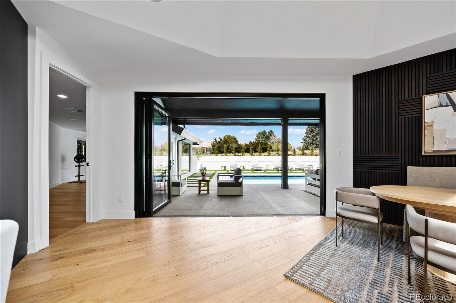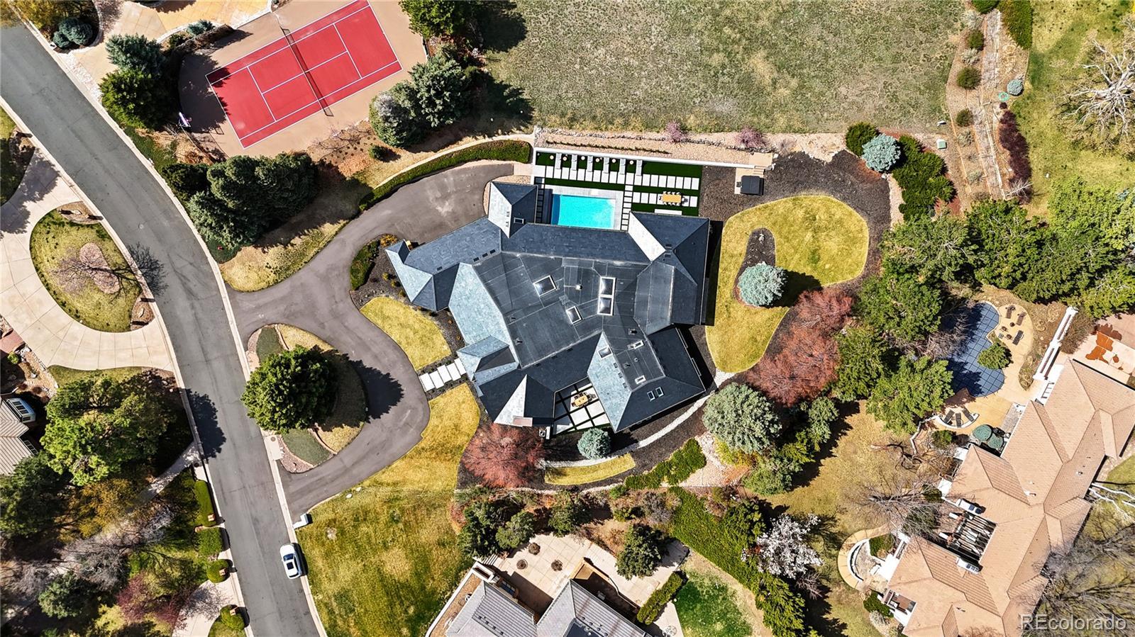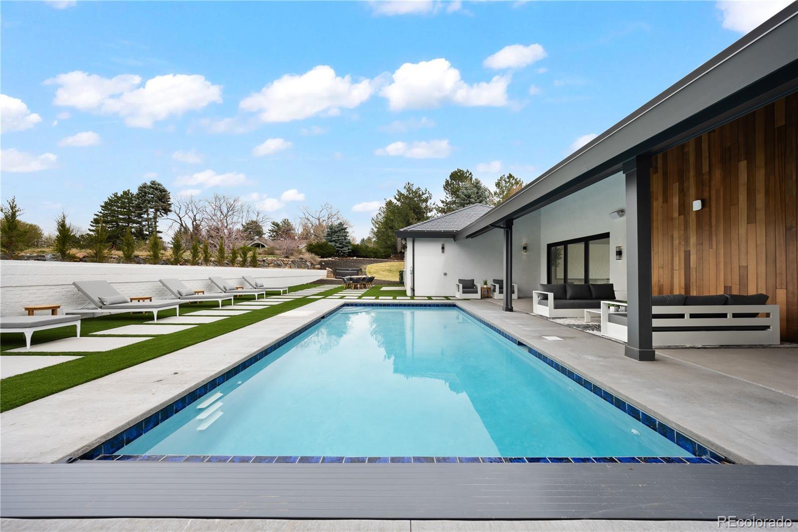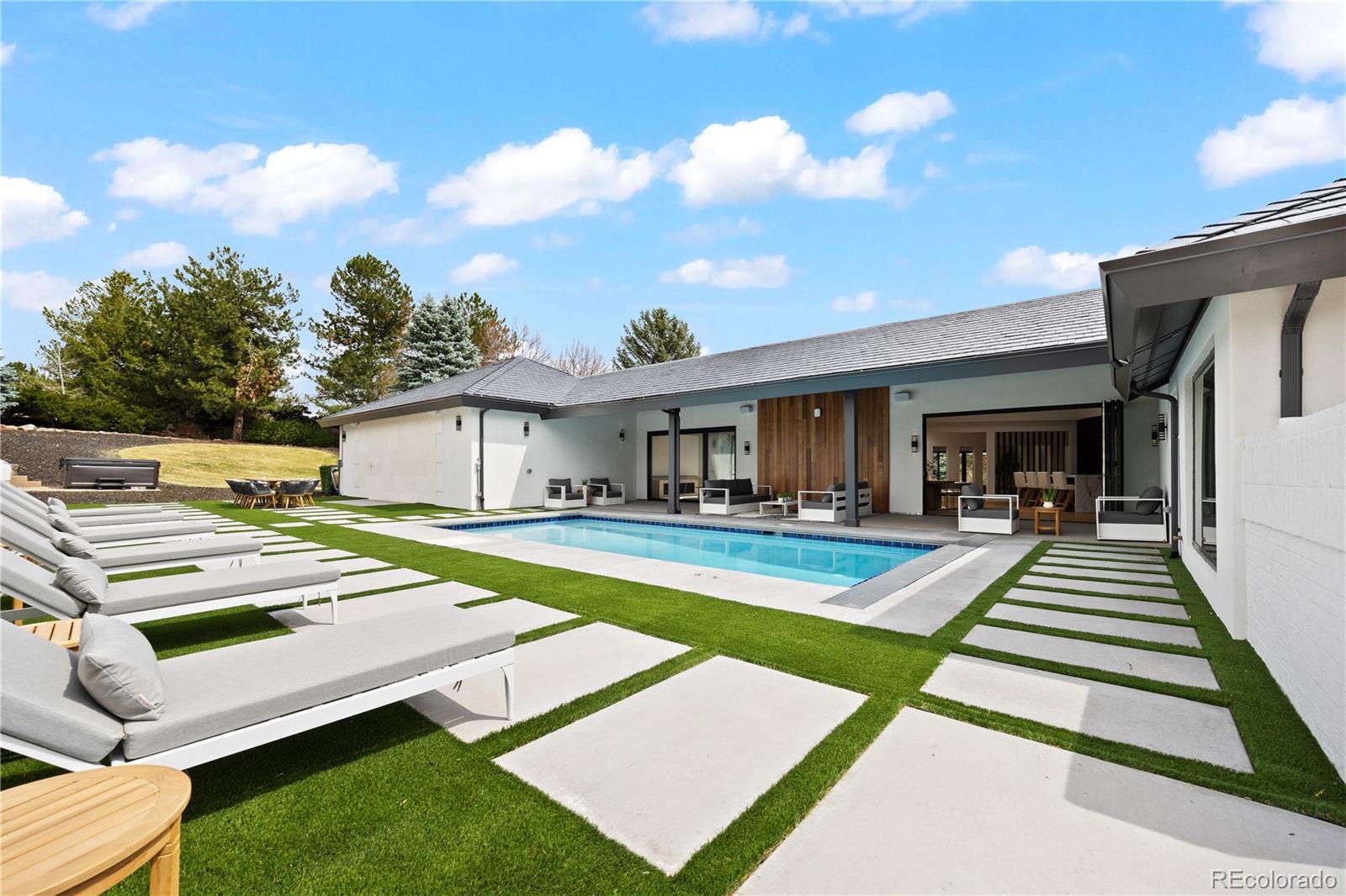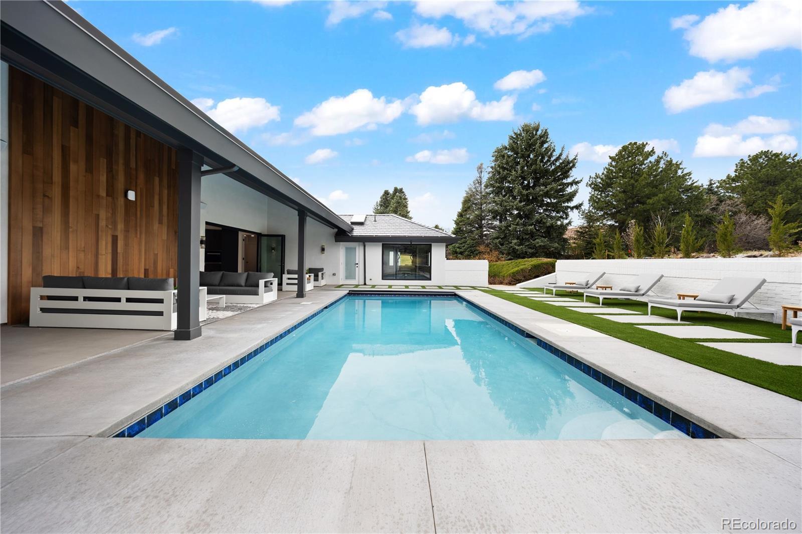 Welcome to this exceptional estate in the highly sought-after Cherry Hills Village community, where timeless elegance meets modern comfort. Spanning over 9,000 square feet of light-filled living space, this stunning residence offers a lifestyle of unparalleled sophistication and ease. Step into a grand, open-concept main level designed for both everyday living and elegant entertaining. The gourmet kitchen is a chef’s dream, outfitted with top-of-the-line Miele appliances, beautiful cabinetry, large hidden pantry and a seamless flow into the living and dining areas. Accordion glass doors in both the kitchen and living room create a true indoor-outdoor experience, opening to a serene backyard oasis featuring a sparkling pool, lush turf, and a shaded patio—perfect for Colorado’s sunny days and cool evenings. The expansive primary suite is a true retreat, featuring a spa-like ensuite, designer walk-in closet with built-in laundry, and elegant finishes throughout. Three additional bedrooms on the main level each offer en-suite bathrooms, providing privacy and comfort for family or guests. The lower level is an entertainer’s dream with a large open lounge, cozy fireplace, full bar, and a theater screen for movie nights. Two additional bedrooms, a full laundry room, and a luxurious spa-style bathroom with a sauna and shower complete the space. Ideally positioned directly across from the walking trail #6247 that leads to other trails within the Village, the home enjoys immediate access to serene outdoor paths perfect for morning strolls or evening walks. Adding to the sense of privacy and open space, the vacant lot directly to the west—located just above the property—is owned by a neighbor within the community and is not slated for future development. From the thoughtful layout to the high-end finishes and seamless indoor-outdoor flow, this Cherry Hills Village home embodies refined living at its finest.