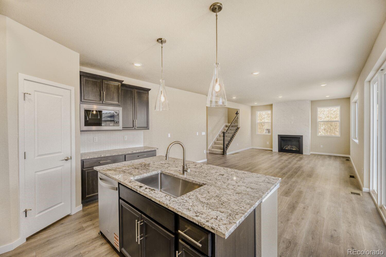 Brand new MOVE-IN READY home with walkout basement in the sought-after Looking Glass community in Parker, CO! This spacious 4 bedroom, 2.5 bath home perfectly blends comfort, style, and modern design. The main level features an open-concept living area centered around a cozy fireplace, a dedicated study ideal for working from home, and a stunning chef kitchen with upgrades throughout. Highlights include a large island, maple smoke cabinetry, granite countertops, and top-of-the-line Whirlpool stainless steel appliances—including a contemporary gas range with hood and built-in microwave. Upstairs, enjoy a versatile loft space—perfect for a playroom or second living area—along with 4 generously sized bedrooms. The private primary suite features a spacious walk-in closet and a bright, modern bathroom with dual vanities, a large linen closet, and a walk-in shower. A full, unfinished walkout basement provides endless potential—expand your living space or design a home gym, theater, or workshop. Step outside and relax on your covered deck, where you can unwind and take in the Colorado lifestyle. Located in a vibrant community, Looking Glass offers amenities for everyone to enjoy, while nearby Parker provides shopping, dining, trails, and top-rated schools. Schedule a showing today and don’t miss this opportunity to make this incredible home yours!