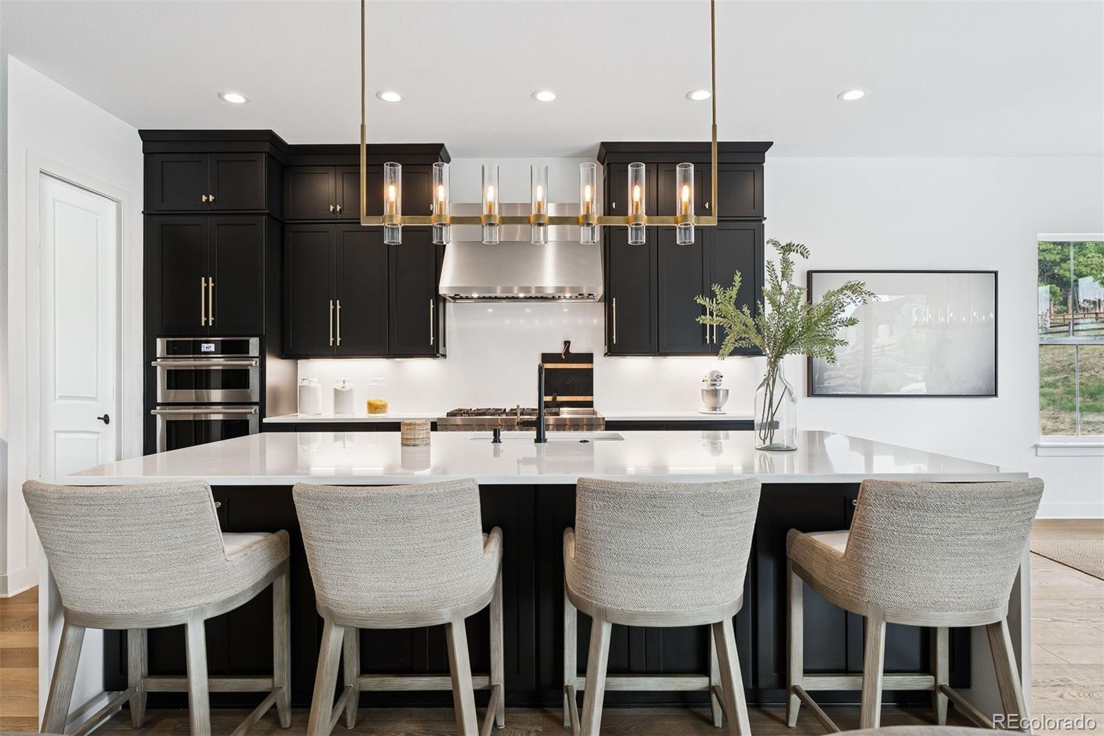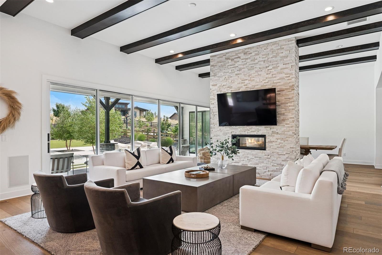 Elevated far beyond standard finishes, this extraordinary residence in The Timbers at The Pinery offers over half an acre of serenity backing to towering pines and open space. From the moment you enter, natural light floods the open floor plan through 24-foot stacked sliding patio doors, creating seamless indoor-outdoor living. The soaring great room showcases vaulted ceilings and a sleek double-sided modern fireplace shared with the formal dining room—perfect for entertaining. The gourmet kitchen is a true showstopper, featuring a 10-foot waterfall island, custom cabinetry to the ceiling, three ovens, a 48” professional range with slab backsplash and stainless hood, a built-in 42” refrigerator, and a walk-in pantry. Restoration Hardware light fixtures and premium finishes highlight the attention to detail throughout. The luxurious main floor primary suite is your retreat with a spa-like five-piece bath, expansive walk-in closet, and private access to the backyard. Two additional bedrooms with en-suite baths and a private office complete the main level. The finished lower level was designed for entertainment, offering a large rec room, wet bar, and full home theater with a large screen and surround sound for the ultimate cinematic experience. Two more bedrooms and a full bath provide flexibility for guests, hobbies, or an additional office. Step outside to enjoy the professionally landscaped backyard oasis with built-in outdoor speakers, blending mountain contemporary design with Colorado’s natural beauty. Whether relaxing under the pines or hosting friends, this home was built for the Colorado lifestyle. As a resident of The Timbers, you’ll also have the option to join Pinery Country Club or The Golf Club at Pradera, offering world-class golf, fitness, and social amenities. This is more than a home—it’s a lifestyle.