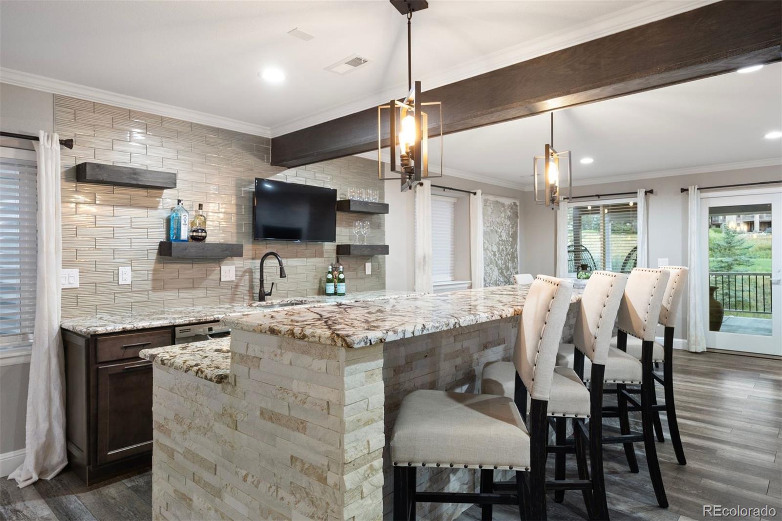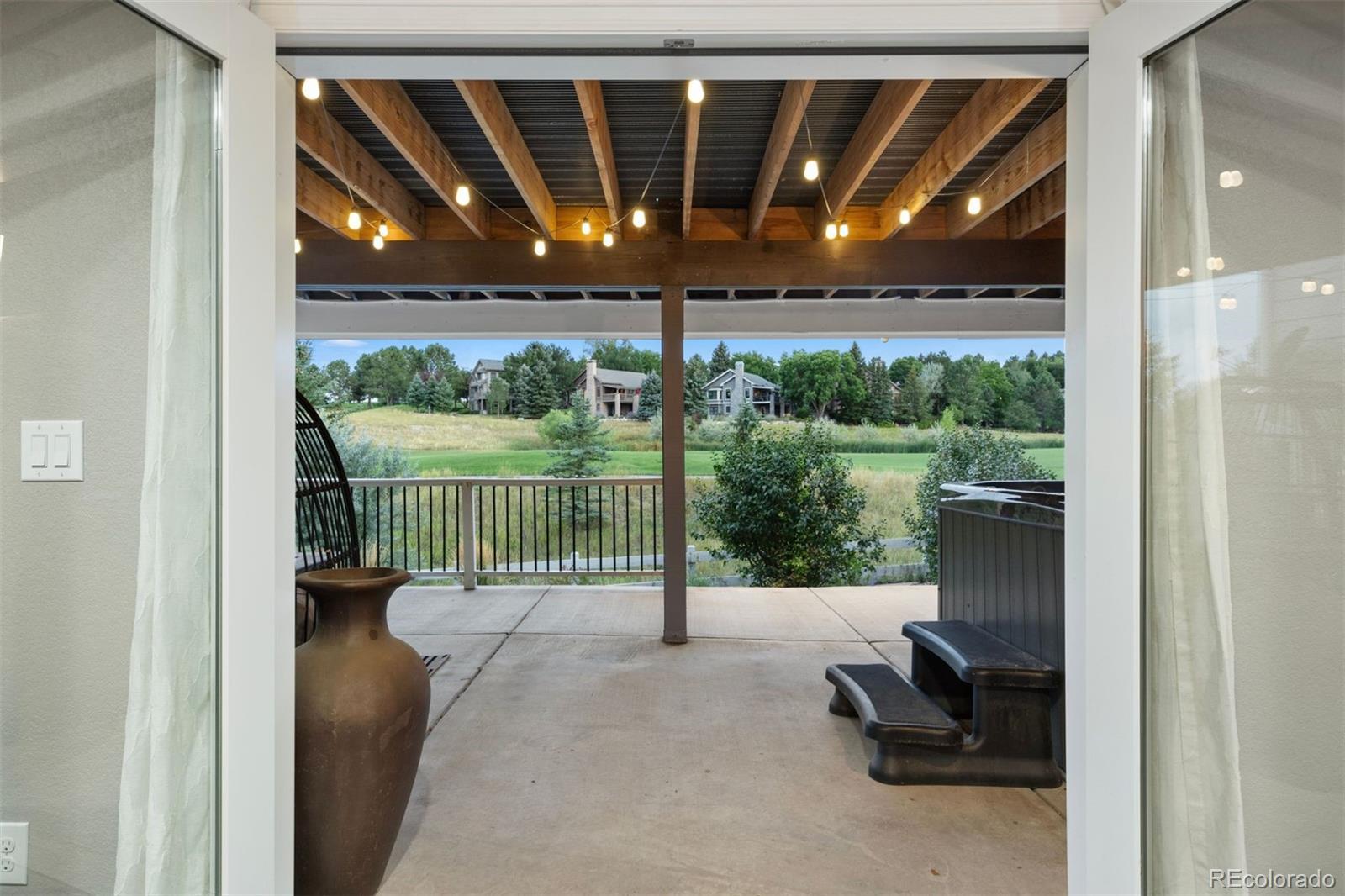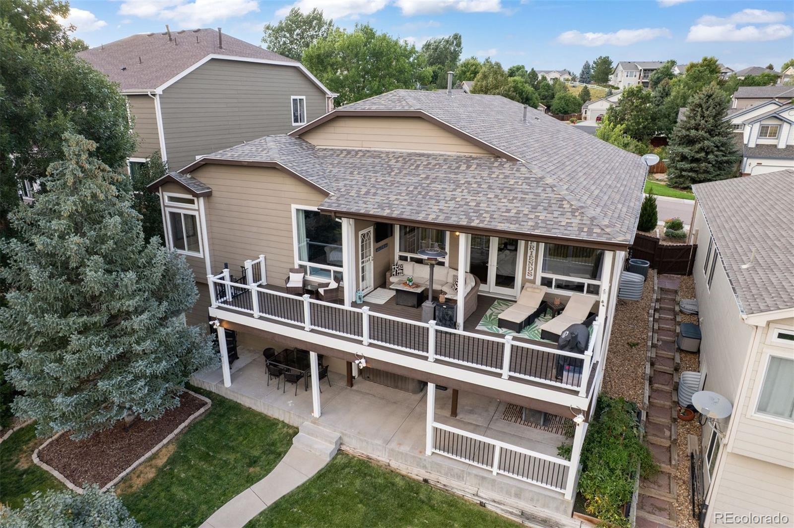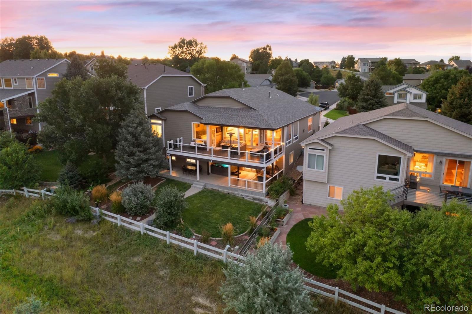 Stunning Ranch Home Backing to the 5th Fairway! With over $200,000 in renovations and upgrades, this home blends luxury, comfort, and entertaining spaces in one perfect package. Backing directly to the golf course, enjoy serene views from both levels of this beautiful ranch. The main level boasts gleaming hardwood floors, quartz countertops in the kitchen and every bath, and updated lighting and fixtures throughout. The open-concept living area flows seamlessly into the gourmet kitchen, complete with a grand center island, walk-in pantry, eat-in nook by a picture window, stainless steel appliances, gas range, and double oven. Step outside to the expansive Trex deck, ideal for entertaining while overlooking the fairway. A cozy fireplace anchors the living room, perfect for Colorado evenings. Also on the main level: •Private office with French doors and large windows •Laundry room and full bath •Two spacious bedrooms •A luxurious primary suite with deck access, spa-like 5-piece bath, and walk-in closet The walk-out lower level is an entertainer’s dream. Every detail was thoughtfully designed with luxury plank flooring, a pool table area, and a spectacular granite bar with beverage cooler, wine fridge, dishwasher, sink, and ample counter space. The spacious family room offers another fireplace, media/entertainment area, and room for dining or game nights. Three additional bedrooms and a stunning ¾ bath complete the finished living space. A massive storage/workshop area adds versatility. Step outside to a covered patio oasis, featuring a hot tub, lounge area, and lush landscaping. A new roof (2024) with a 15-year warranty adds peace of mind. Located in North Castle Pines and feeding into the highly sought-after Rock Canyon High School, this home offers both elegance and convenience.