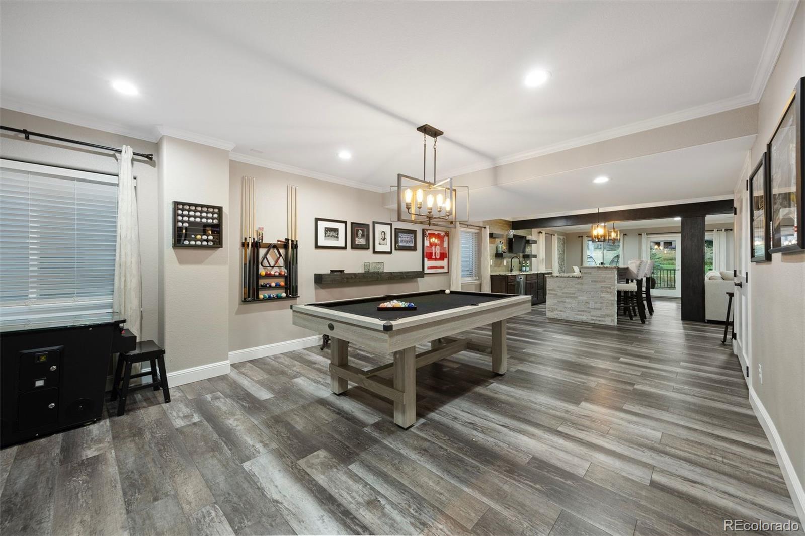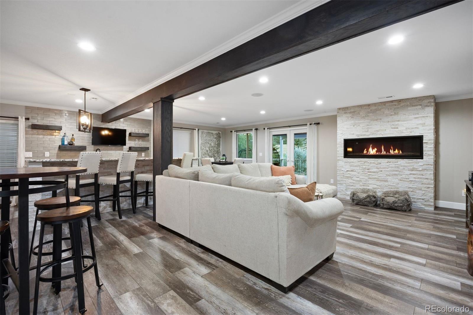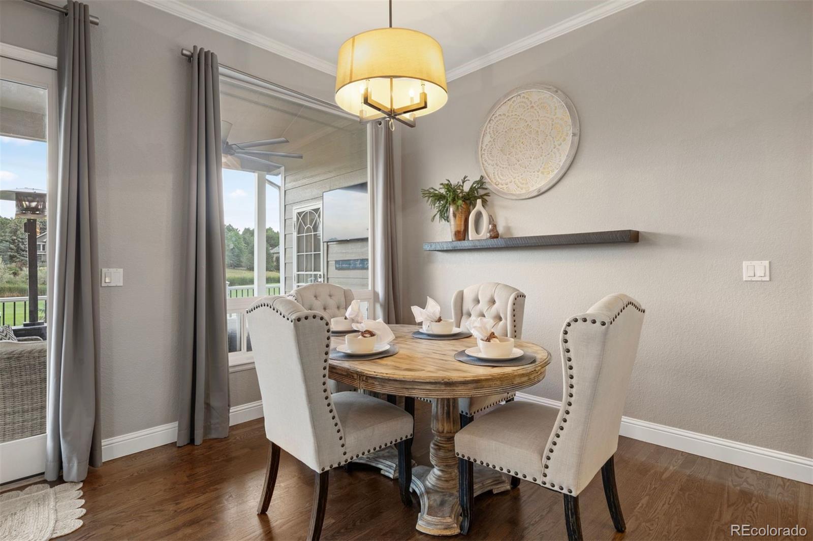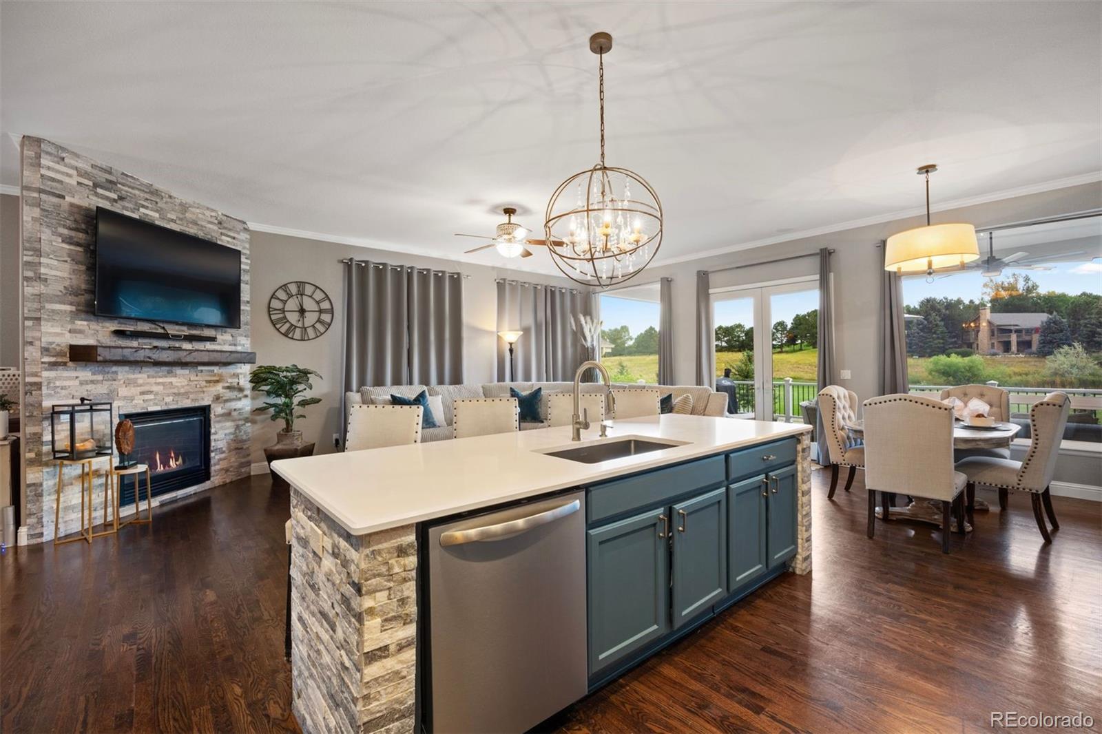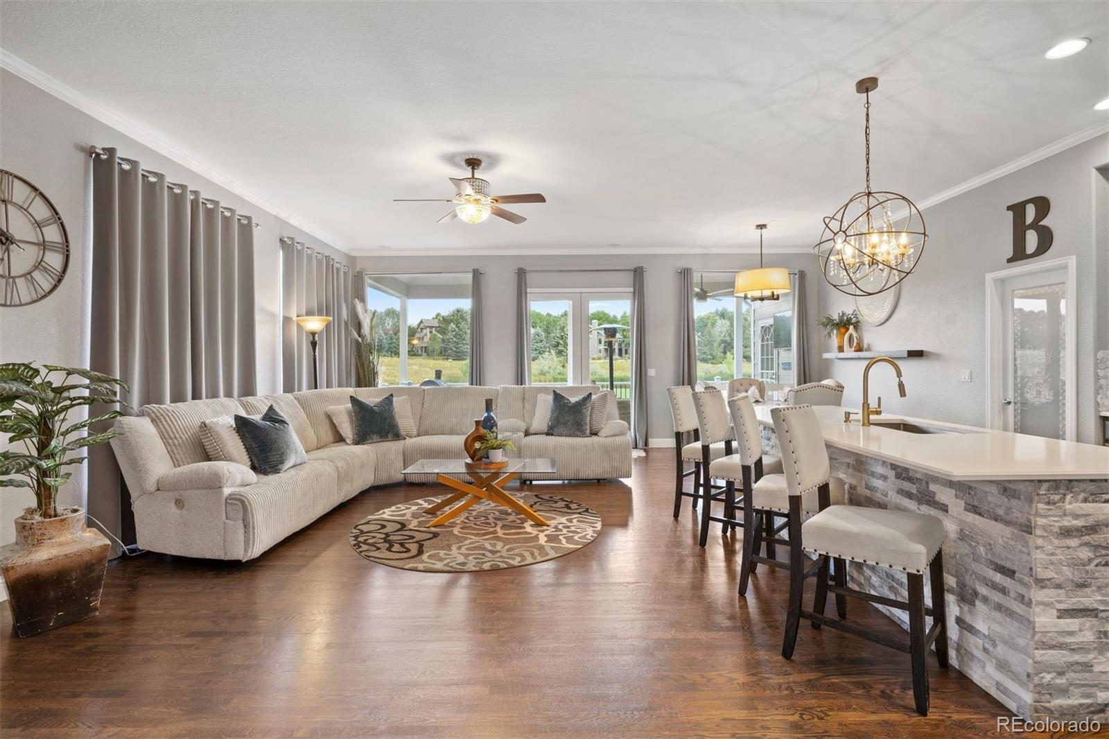 Stunning Ranch Home Backing to the 5th Fairway! With over $200,000 in renovations and upgrades, this home blends luxury, comfort, and entertaining spaces in one perfect package. Backing directly to the golf course, enjoy serene views from both levels of this beautiful ranch. The main level boasts gleaming hardwood floors, quartz countertops in the kitchen and every bath, and updated lighting and fixtures throughout. The open-concept living area flows seamlessly into the gourmet kitchen, complete with a grand center island, walk-in pantry, eat-in nook by a picture window, stainless steel appliances, gas range, and double oven. Step outside to the expansive Trex deck, ideal for entertaining while overlooking the fairway. A cozy fireplace anchors the living room, perfect for Colorado evenings. Also on the main level: •Private office with French doors and large windows •Laundry room and full bath •Two spacious bedrooms •A luxurious primary suite with deck access, spa-like 5-piece bath, and walk-in closet The walk-out lower level is an entertainer’s dream. Every detail was thoughtfully designed with luxury plank flooring, a pool table area, and a spectacular granite bar with beverage cooler, wine fridge, dishwasher, sink, and ample counter space. The spacious family room offers another fireplace, media/entertainment area, and room for dining or game nights. Three additional bedrooms and a stunning ¾ bath complete the finished living space. A massive storage/workshop area adds versatility. Step outside to a covered patio oasis, featuring a hot tub, lounge area, and lush landscaping. A new roof (2024) with a 15-year warranty adds peace of mind. Located in North Castle Pines and feeding into the highly sought-after Rock Canyon High School, this home offers both elegance and convenience.