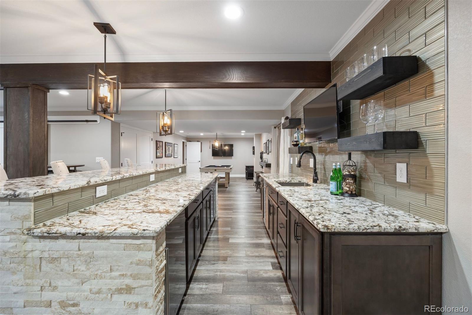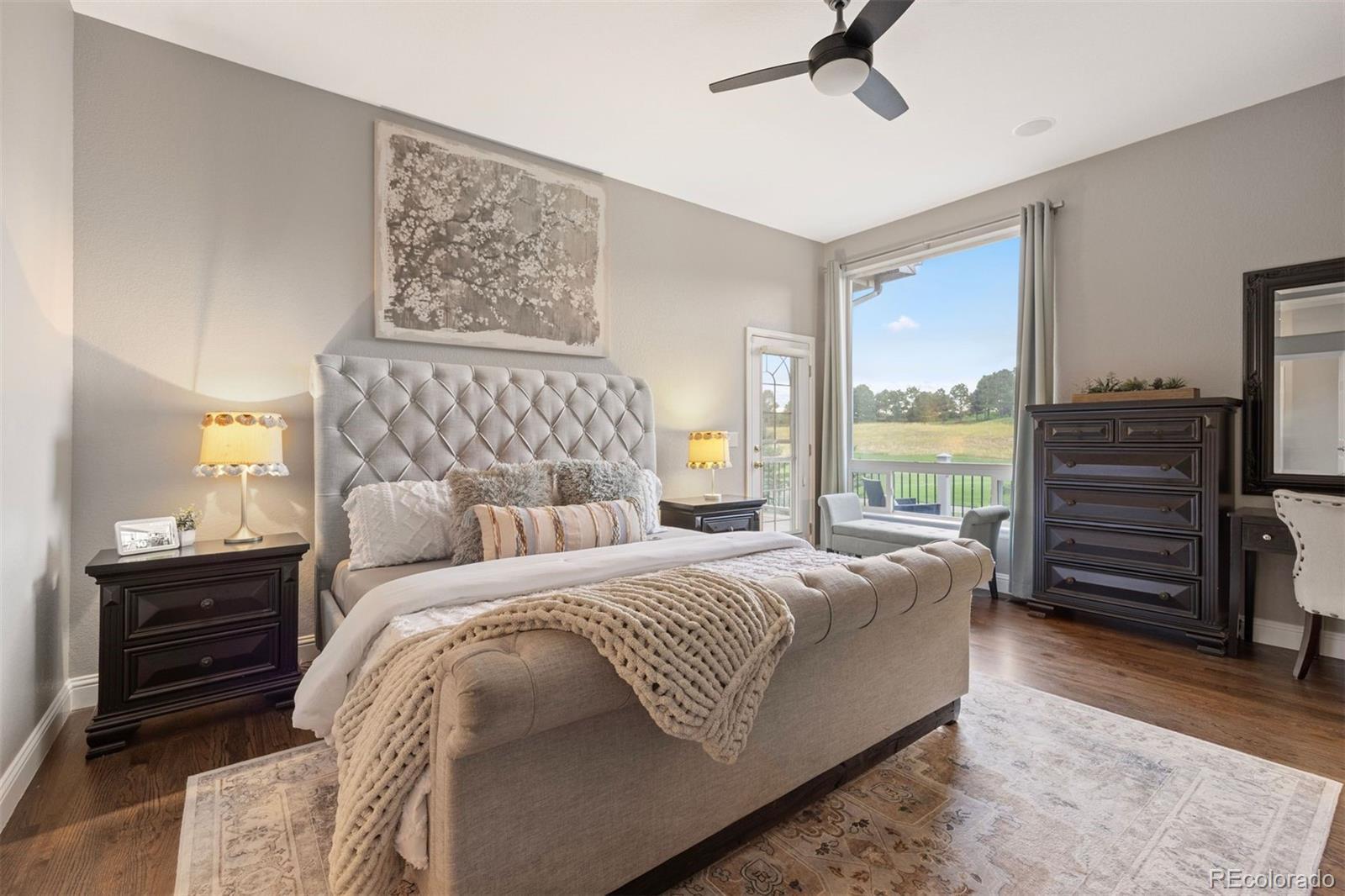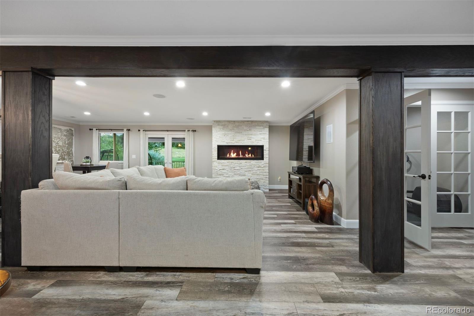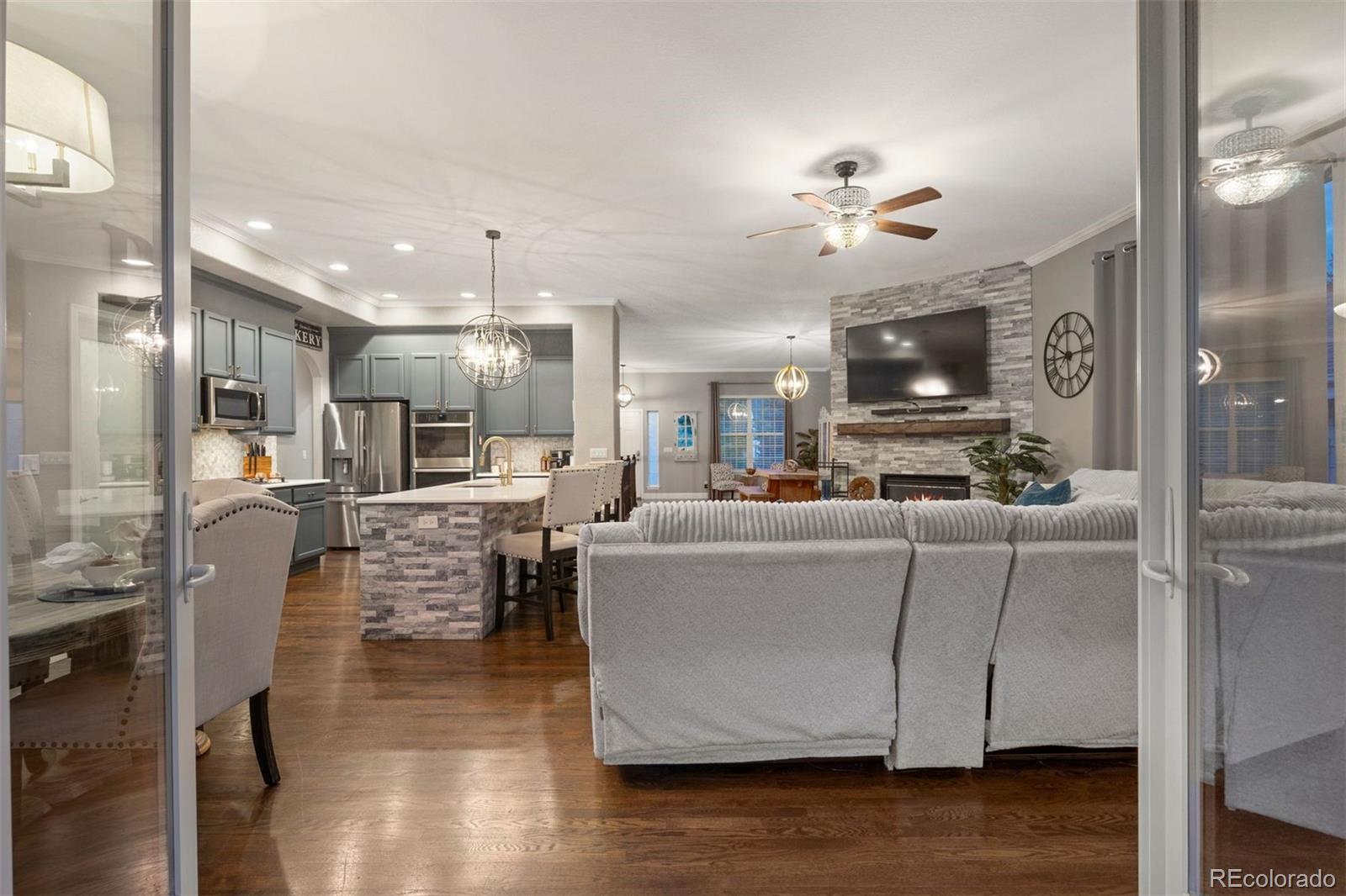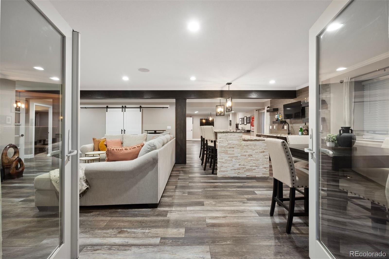 Stunning Ranch Home Backing to the 5th Fairway! With over $200,000 in renovations and upgrades, this home blends luxury, comfort, and entertaining spaces in one perfect package. Backing directly to the golf course, enjoy serene views from both levels of this beautiful ranch. The main level boasts gleaming hardwood floors, quartz countertops in the kitchen and every bath, and updated lighting and fixtures throughout. The open-concept living area flows seamlessly into the gourmet kitchen, complete with a grand center island, walk-in pantry, eat-in nook by a picture window, stainless steel appliances, gas range, and double oven. Step outside to the expansive Trex deck, ideal for entertaining while overlooking the fairway. A cozy fireplace anchors the living room, perfect for Colorado evenings. Also on the main level: •Private office with French doors and large windows •Laundry room and full bath •Two spacious bedrooms •A luxurious primary suite with deck access, spa-like 5-piece bath, and walk-in closet The walk-out lower level is an entertainer’s dream. Every detail was thoughtfully designed with luxury plank flooring, a pool table area, and a spectacular granite bar with beverage cooler, wine fridge, dishwasher, sink, and ample counter space. The spacious family room offers another fireplace, media/entertainment area, and room for dining or game nights. Three additional bedrooms and a stunning ¾ bath complete the finished living space. A massive storage/workshop area adds versatility. Step outside to a covered patio oasis, featuring a hot tub, lounge area, and lush landscaping. A new roof (2024) with a 15-year warranty adds peace of mind. Located in North Castle Pines and feeding into the highly sought-after Rock Canyon High School, this home offers both elegance and convenience.