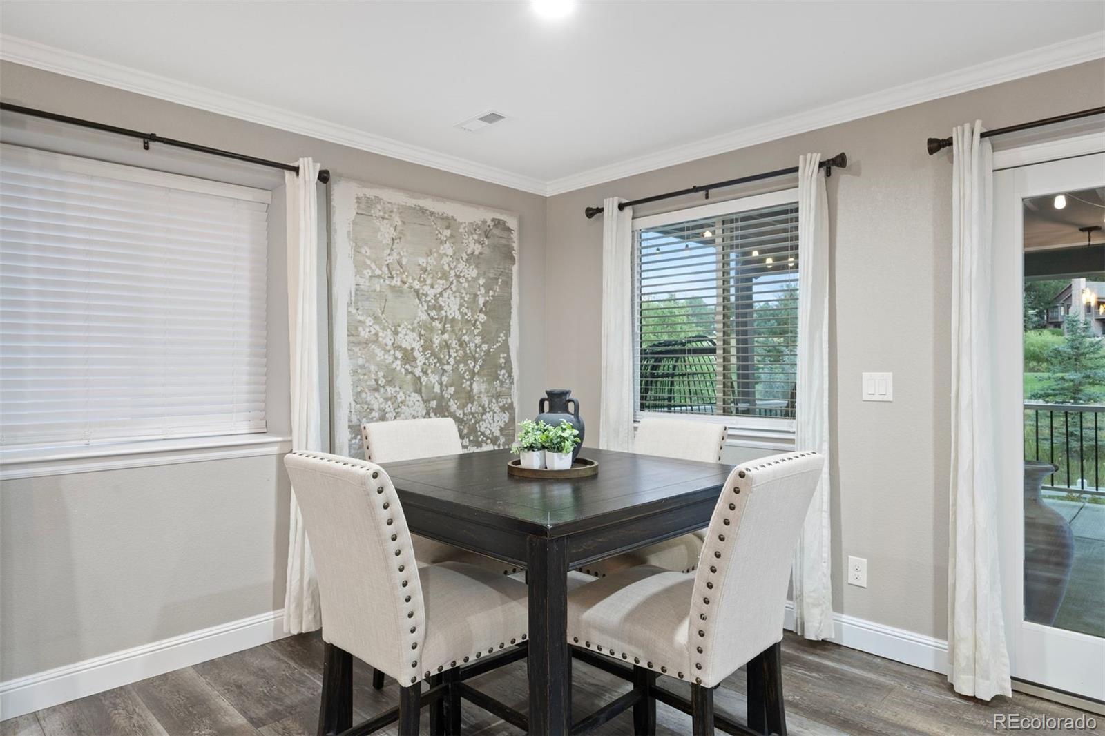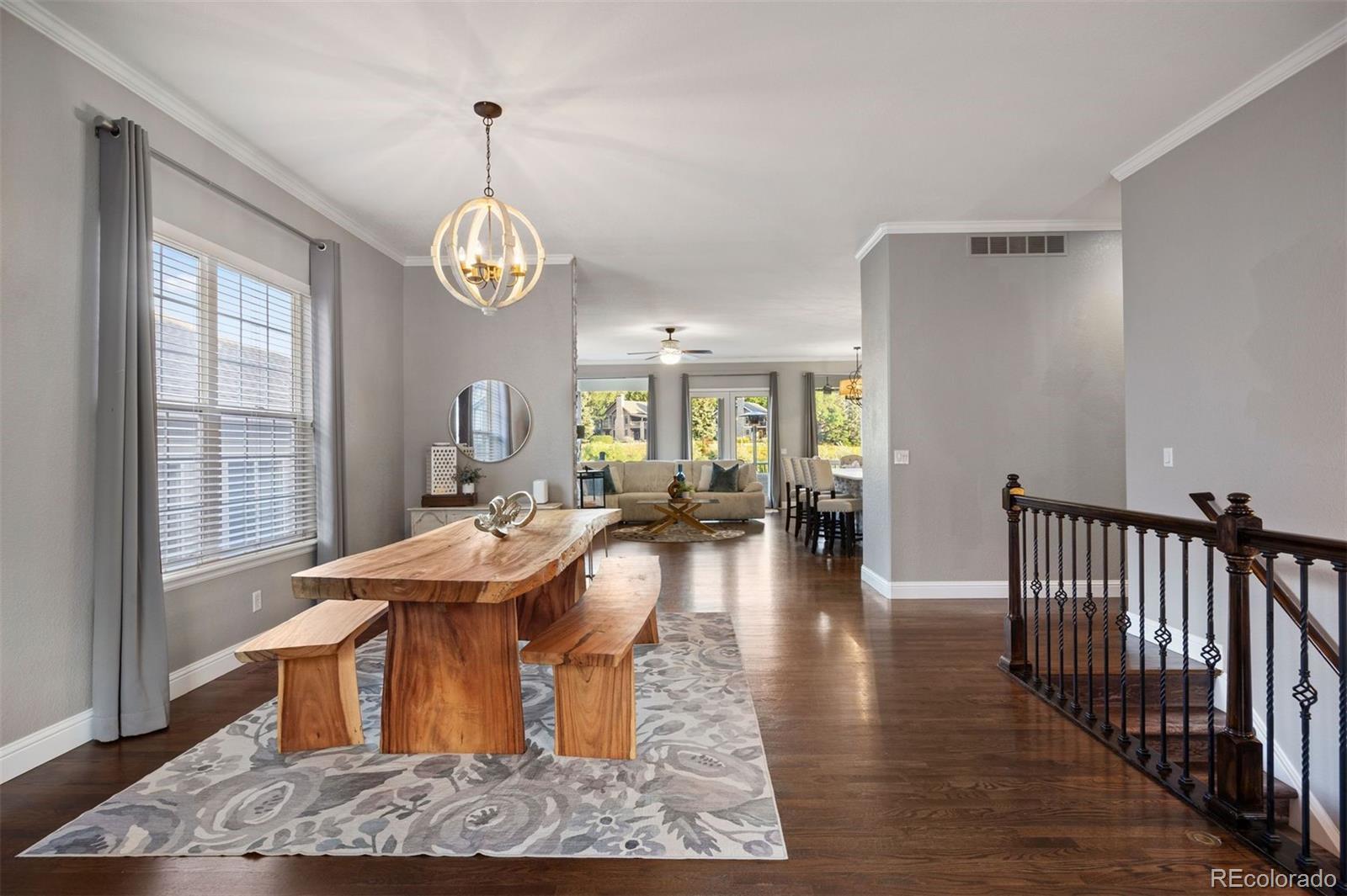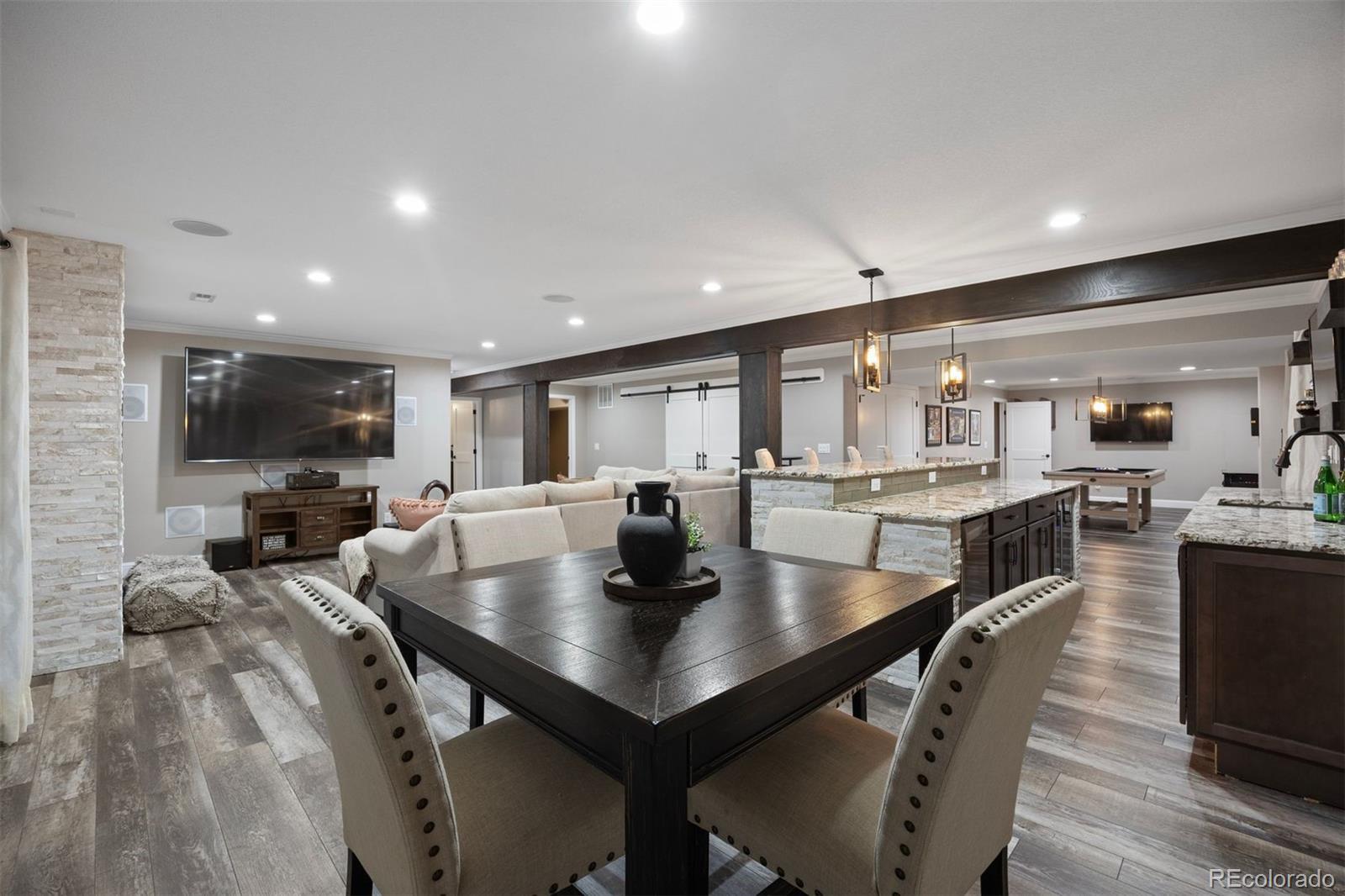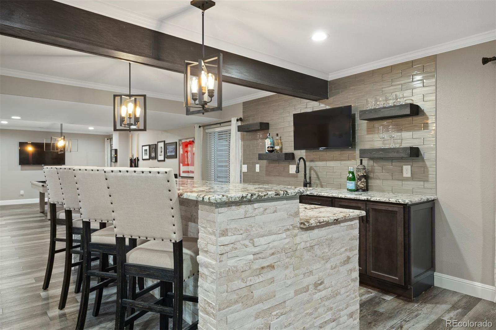 Stunning Ranch Home Backing to the 5th Fairway! With over $200,000 in renovations and upgrades, this home blends luxury, comfort, and entertaining spaces in one perfect package. Backing directly to the golf course, enjoy serene views from both levels of this beautiful ranch. The main level boasts gleaming hardwood floors, quartz countertops in the kitchen and every bath, and updated lighting and fixtures throughout. The open-concept living area flows seamlessly into the gourmet kitchen, complete with a grand center island, walk-in pantry, eat-in nook by a picture window, stainless steel appliances, gas range, and double oven. Step outside to the expansive Trex deck, ideal for entertaining while overlooking the fairway. A cozy fireplace anchors the living room, perfect for Colorado evenings. Also on the main level: •Private office with French doors and large windows •Laundry room and full bath •Two spacious bedrooms •A luxurious primary suite with deck access, spa-like 5-piece bath, and walk-in closet The walk-out lower level is an entertainer’s dream. Every detail was thoughtfully designed with luxury plank flooring, a pool table area, and a spectacular granite bar with beverage cooler, wine fridge, dishwasher, sink, and ample counter space. The spacious family room offers another fireplace, media/entertainment area, and room for dining or game nights. Three additional bedrooms and a stunning ¾ bath complete the finished living space. A massive storage/workshop area adds versatility. Step outside to a covered patio oasis, featuring a hot tub, lounge area, and lush landscaping. A new roof (2024) with a 15-year warranty adds peace of mind. Located in North Castle Pines and feeding into the highly sought-after Rock Canyon High School, this home offers both elegance and convenience.