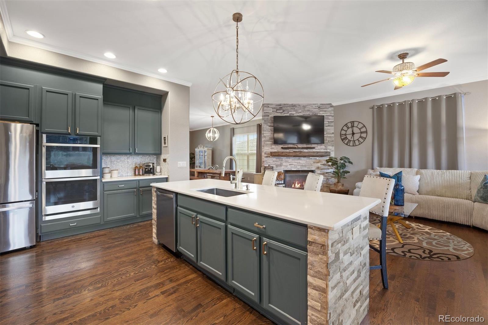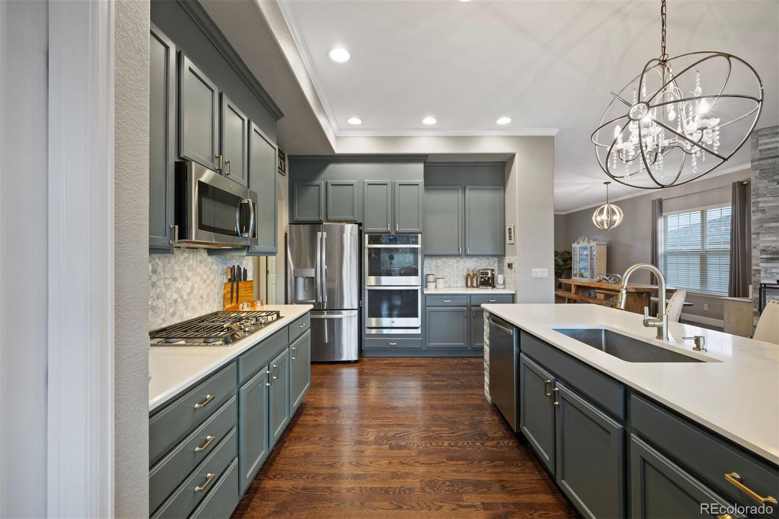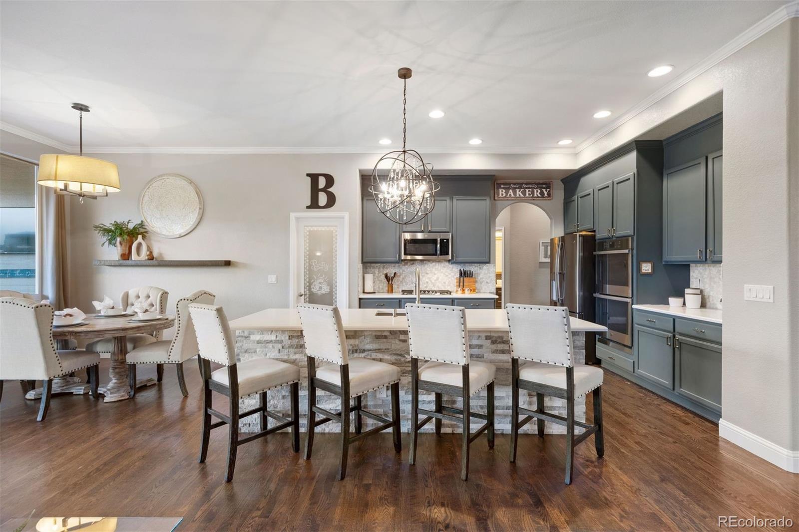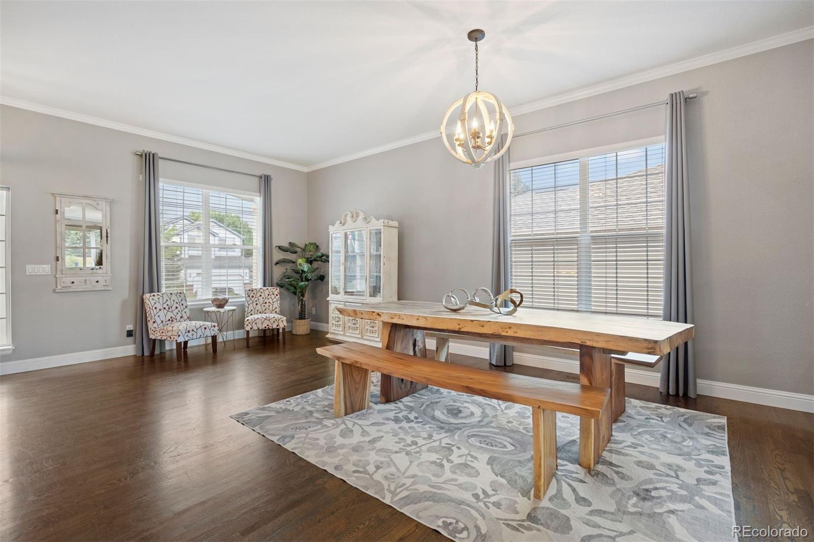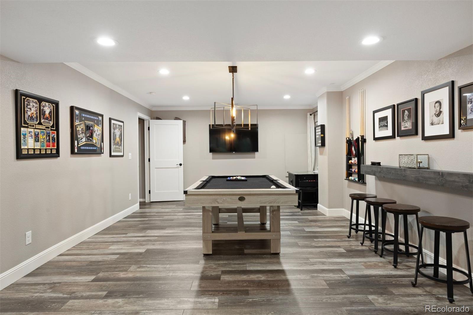 Stunning Ranch Home Backing to the 5th Fairway! With over $200,000 in renovations and upgrades, this home blends luxury, comfort, and entertaining spaces in one perfect package. Backing directly to the golf course, enjoy serene views from both levels of this beautiful ranch. The main level boasts gleaming hardwood floors, quartz countertops in the kitchen and every bath, and updated lighting and fixtures throughout. The open-concept living area flows seamlessly into the gourmet kitchen, complete with a grand center island, walk-in pantry, eat-in nook by a picture window, stainless steel appliances, gas range, and double oven. Step outside to the expansive Trex deck, ideal for entertaining while overlooking the fairway. A cozy fireplace anchors the living room, perfect for Colorado evenings. Also on the main level: •Private office with French doors and large windows •Laundry room and full bath •Two spacious bedrooms •A luxurious primary suite with deck access, spa-like 5-piece bath, and walk-in closet The walk-out lower level is an entertainer’s dream. Every detail was thoughtfully designed with luxury plank flooring, a pool table area, and a spectacular granite bar with beverage cooler, wine fridge, dishwasher, sink, and ample counter space. The spacious family room offers another fireplace, media/entertainment area, and room for dining or game nights. Three additional bedrooms and a stunning ¾ bath complete the finished living space. A massive storage/workshop area adds versatility. Step outside to a covered patio oasis, featuring a hot tub, lounge area, and lush landscaping. A new roof (2024) with a 15-year warranty adds peace of mind. Located in North Castle Pines and feeding into the highly sought-after Rock Canyon High School, this home offers both elegance and convenience.