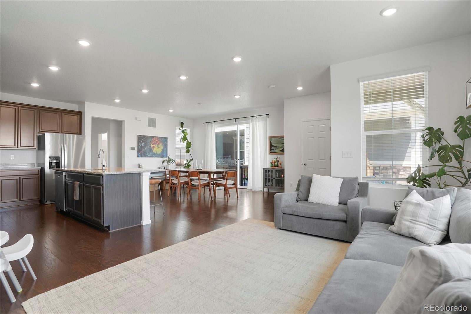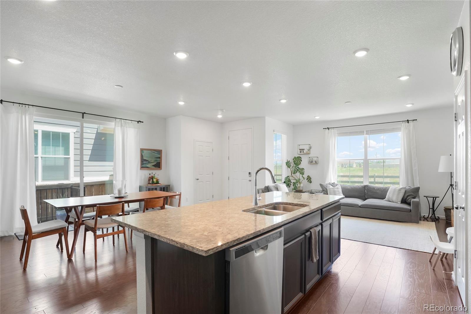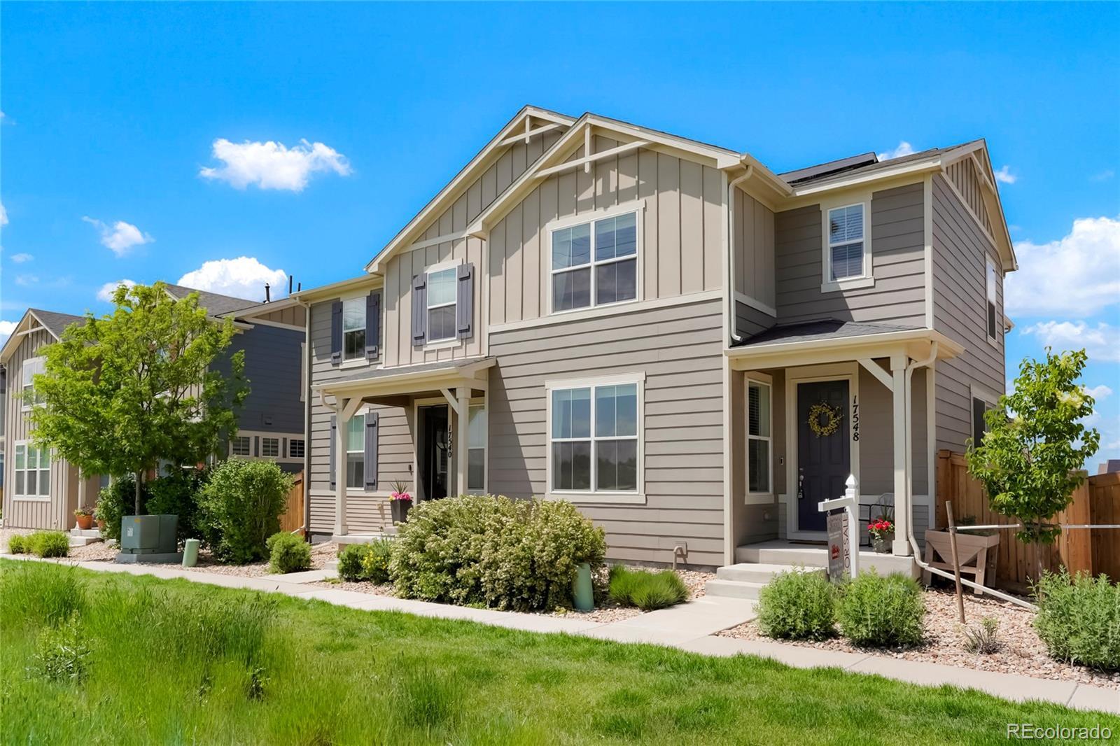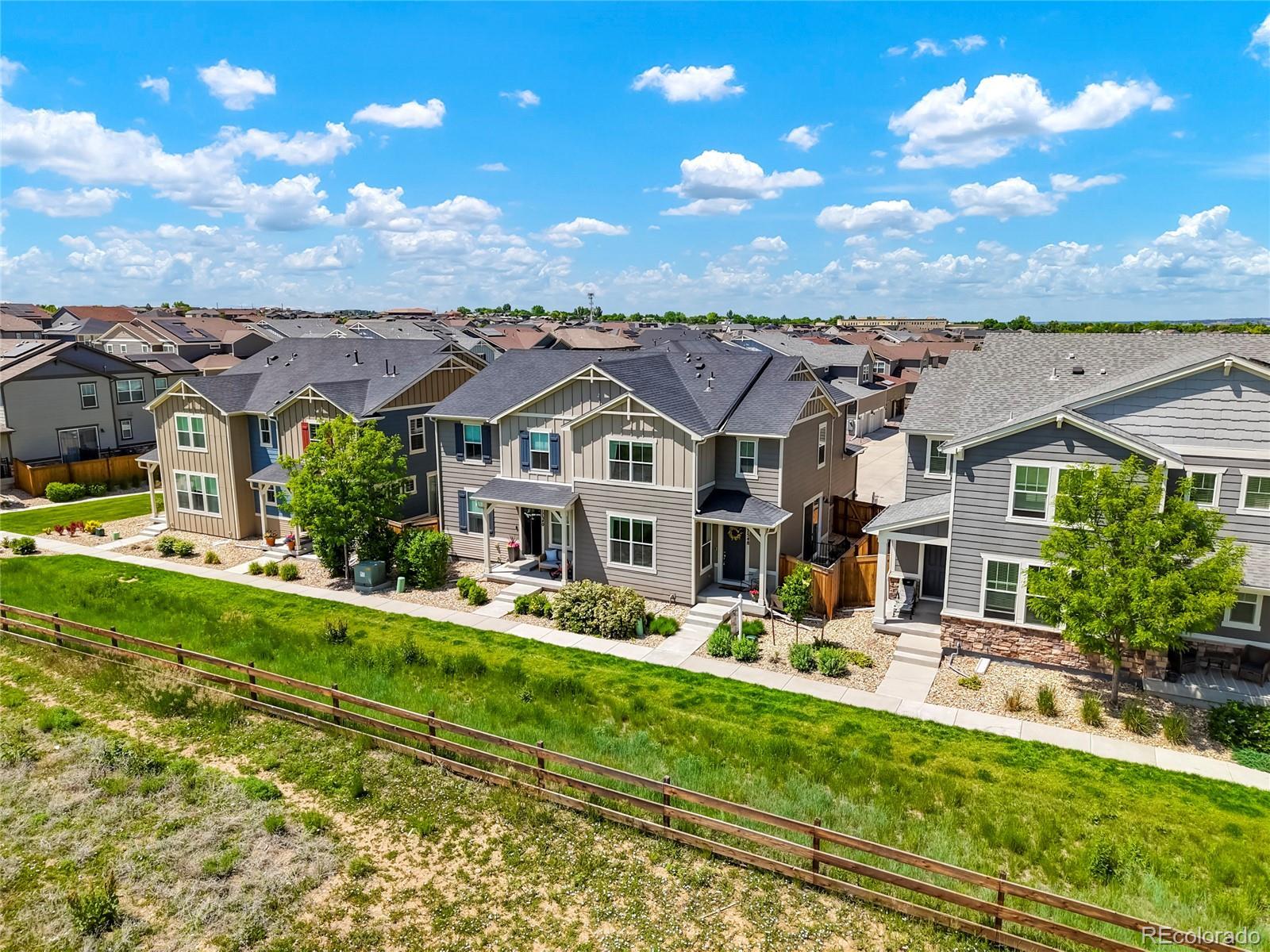 Welcome to this well-maintained 3-bedroom, 3-bathroom paired home located in a desirable Parker neighborhood. This residence offers an open-concept floor plan with tall ceilings, high-end laminate flooring, and expansive windows that bring in abundant natural light and offer scenic views of adjacent open space. The kitchen is equipped with stainless steel appliances, quartz countertops, a large center island with bar seating, a 5-burner gas range, ample wood cabinetry, and a walk-in pantry. Adjacent to the kitchen, the dining area provides access to the fenced backyard through sliding glass doors. The main floor includes a powder bath featuring a modern vessel sink vanity. Upstairs, the home offers three spacious bedrooms, a versatile loft space with a storage closet, and a conveniently located laundry room with built-in shelving. The primary suite includes an ensuite bath and a custom walk-in closet with organizers. The unfinished basement provides additional space for storage or future expansion. The attached two-car garage includes a LiftMaster smart garage door opener. Located on a quiet street at the end of the row, the home also benefits from additional guest parking. Close to Old Town Parker, shopping, dining, parks, and commuter routes.