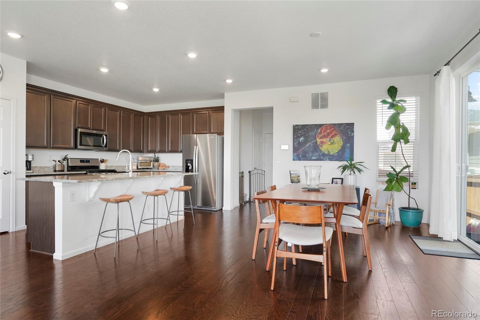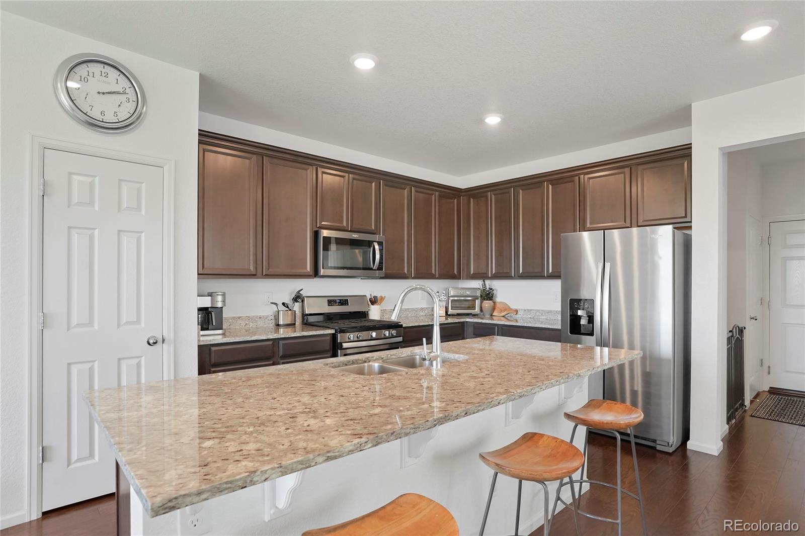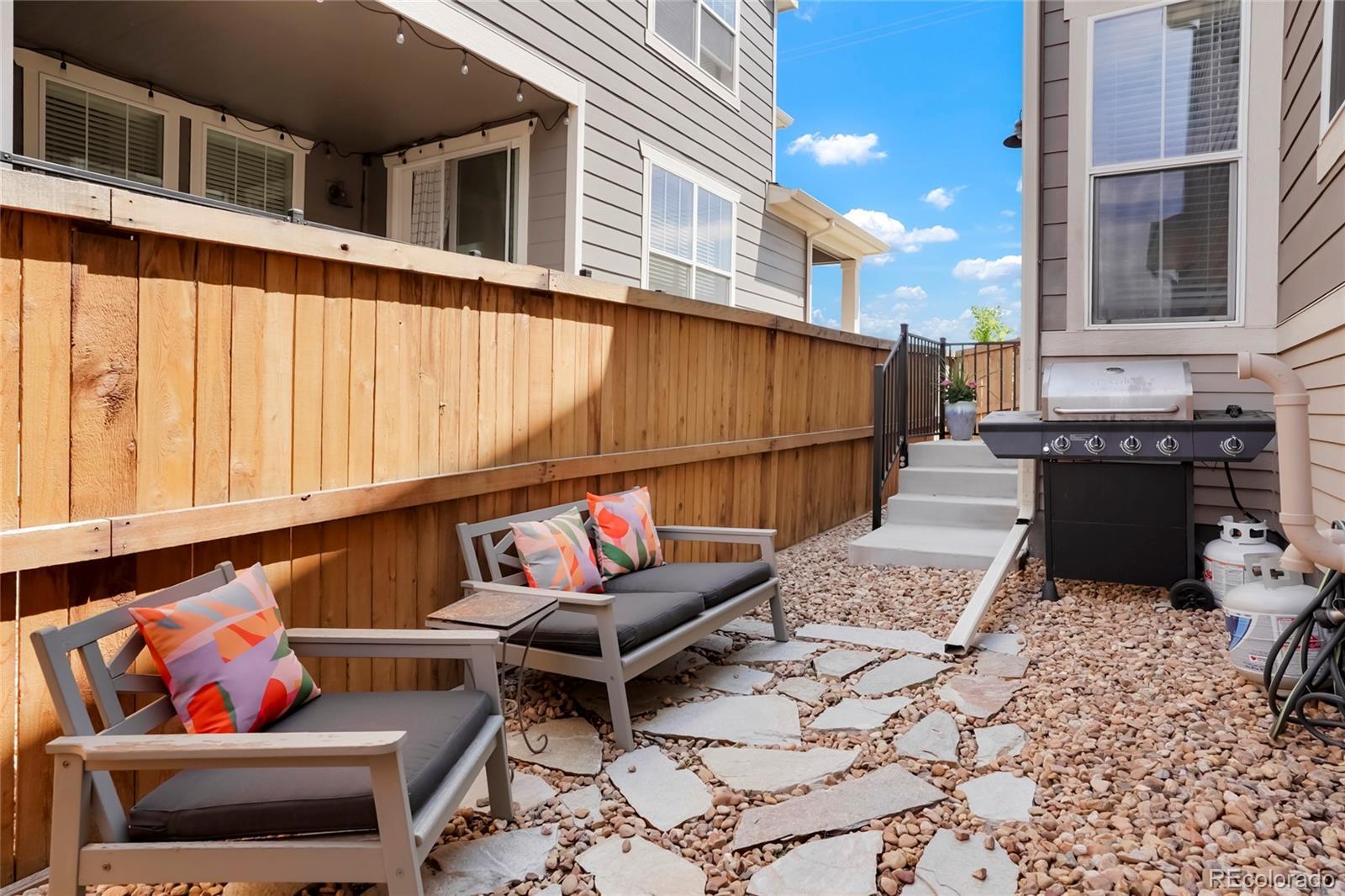 Welcome to this well-maintained 3-bedroom, 3-bathroom paired home located in a desirable Parker neighborhood. This residence offers an open-concept floor plan with tall ceilings, high-end laminate flooring, and expansive windows that bring in abundant natural light and offer scenic views of adjacent open space. The kitchen is equipped with stainless steel appliances, quartz countertops, a large center island with bar seating, a 5-burner gas range, ample wood cabinetry, and a walk-in pantry. Adjacent to the kitchen, the dining area provides access to the fenced backyard through sliding glass doors. The main floor includes a powder bath featuring a modern vessel sink vanity. Upstairs, the home offers three spacious bedrooms, a versatile loft space with a storage closet, and a conveniently located laundry room with built-in shelving. The primary suite includes an ensuite bath and a custom walk-in closet with organizers. The unfinished basement provides additional space for storage or future expansion. The attached two-car garage includes a LiftMaster smart garage door opener. Located on a quiet street at the end of the row, the home also benefits from additional guest parking. Close to Old Town Parker, shopping, dining, parks, and commuter routes.