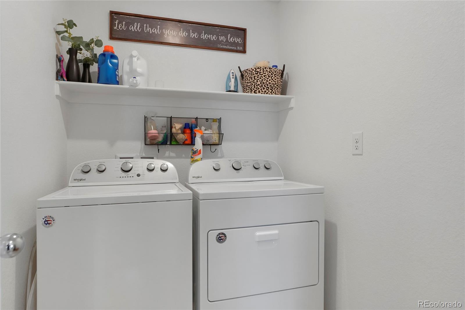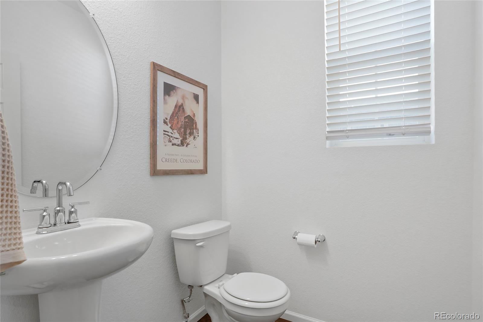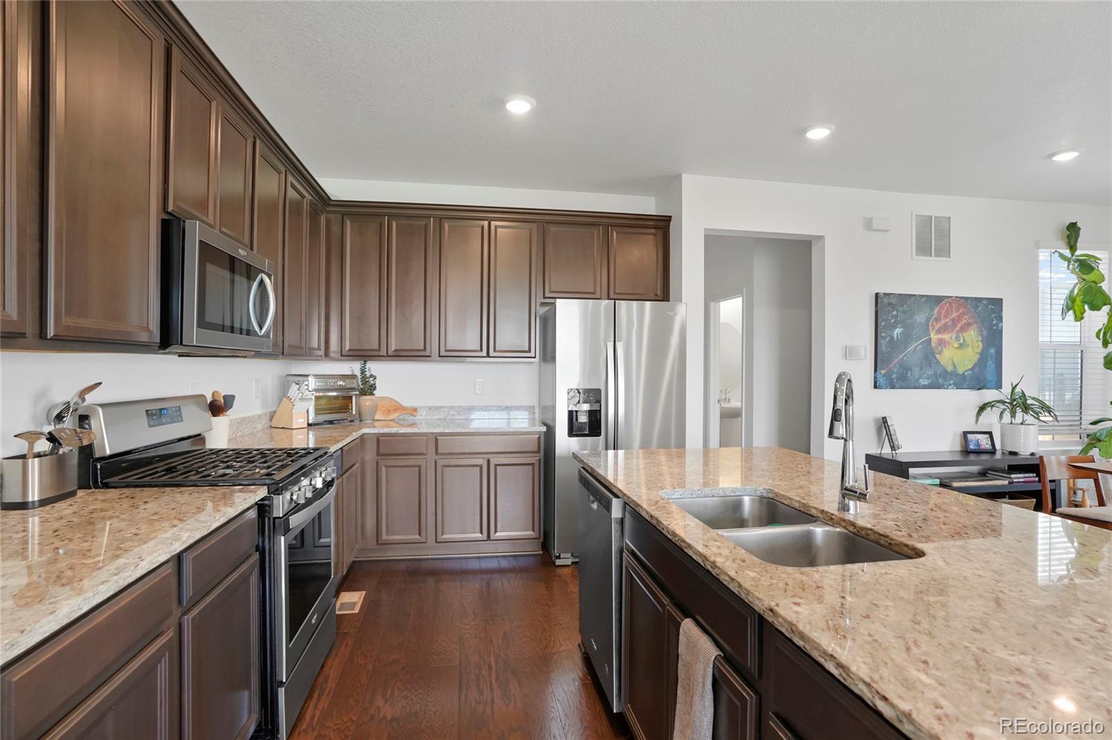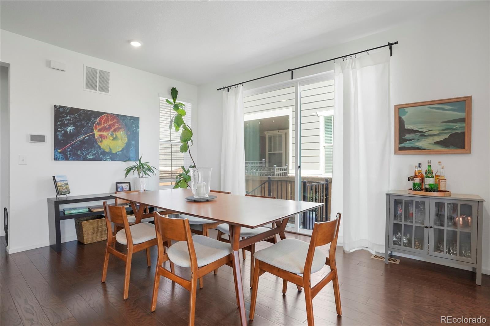 Welcome to this well-maintained 3-bedroom, 3-bathroom paired home located in a desirable Parker neighborhood. This residence offers an open-concept floor plan with tall ceilings, high-end laminate flooring, and expansive windows that bring in abundant natural light and offer scenic views of adjacent open space. The kitchen is equipped with stainless steel appliances, quartz countertops, a large center island with bar seating, a 5-burner gas range, ample wood cabinetry, and a walk-in pantry. Adjacent to the kitchen, the dining area provides access to the fenced backyard through sliding glass doors. The main floor includes a powder bath featuring a modern vessel sink vanity. Upstairs, the home offers three spacious bedrooms, a versatile loft space with a storage closet, and a conveniently located laundry room with built-in shelving. The primary suite includes an ensuite bath and a custom walk-in closet with organizers. The unfinished basement provides additional space for storage or future expansion. The attached two-car garage includes a LiftMaster smart garage door opener. Located on a quiet street at the end of the row, the home also benefits from additional guest parking. Close to Old Town Parker, shopping, dining, parks, and commuter routes.