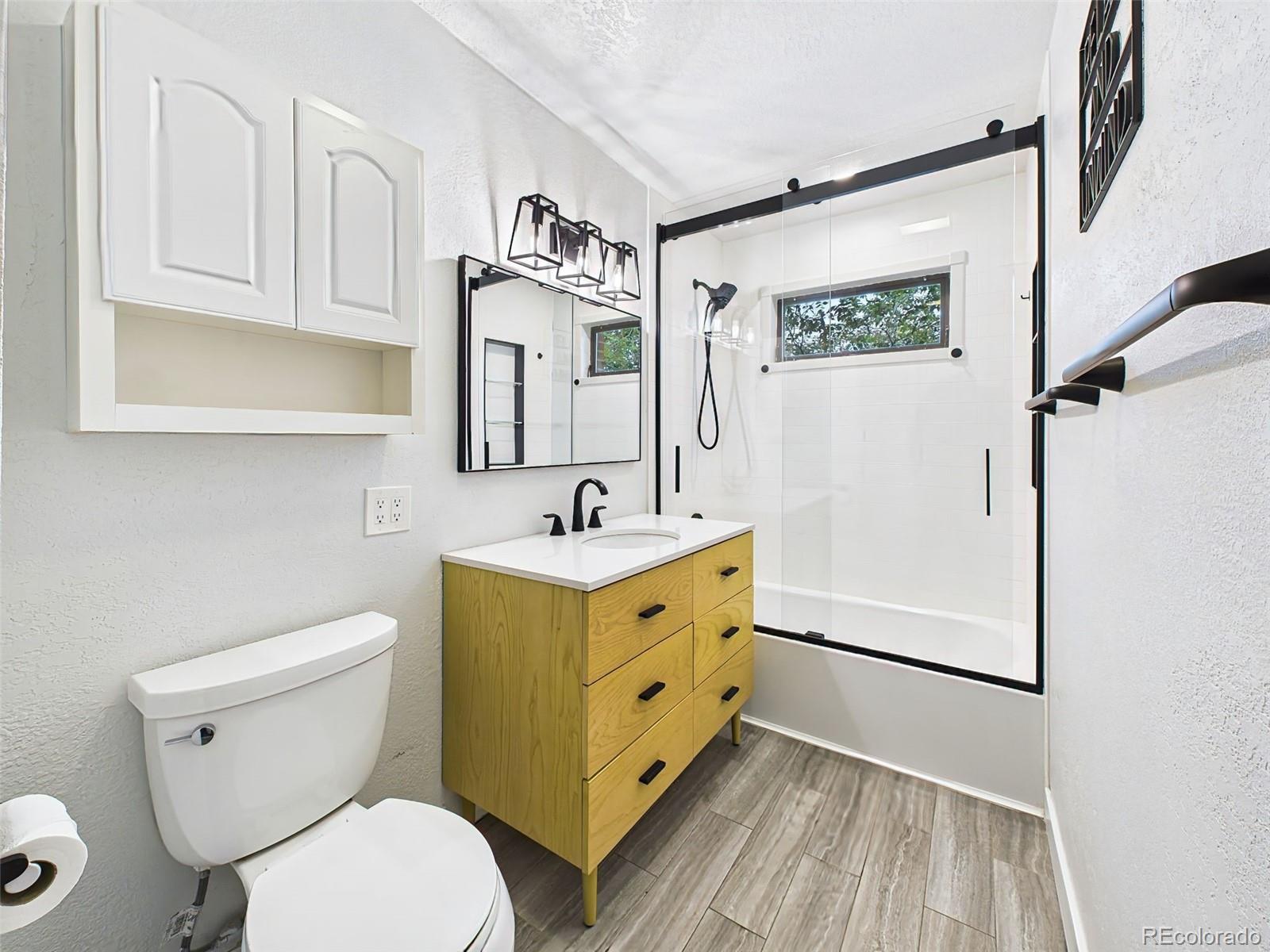 Back on the market! This beautifully remodeled ranch-style home in the desirable Skyway neighborhood blends timeless character with modern upgrades. Inside, luxury vinyl plank flooring creates a seamless flow through the open-concept living and dining areas, highlighted by a striking brick accent wall, built-in shelving, and a cozy gas fireplace. The kitchen shines with quartz countertops, stainless steel appliances, abundant cabinetry, and a redesigned pantry for extra storage. Just off the living room, the expansive sunroom offers year-round enjoyment—perfect for entertaining or relaxing. The main level includes three spacious bedrooms and a stylishly updated full bath. The finished basement adds versatility with a large recreation room, bonus space for hobbies or storage, an oversized laundry room, and a non-conforming bedroom with its own en suite bath. Outside, enjoy low-maintenance living with new backyard turf. Additional updates include central A/C, new lighting, smart home wiring, and fresh interior and exterior paint. Seller will install a brand-new roof prior to closing—pick your color! Located near top-rated District 12 schools, Broadmoor Towne Center, and scenic Cheyenne Canyon trails, this upgraded Skyway gem is move-in ready.
