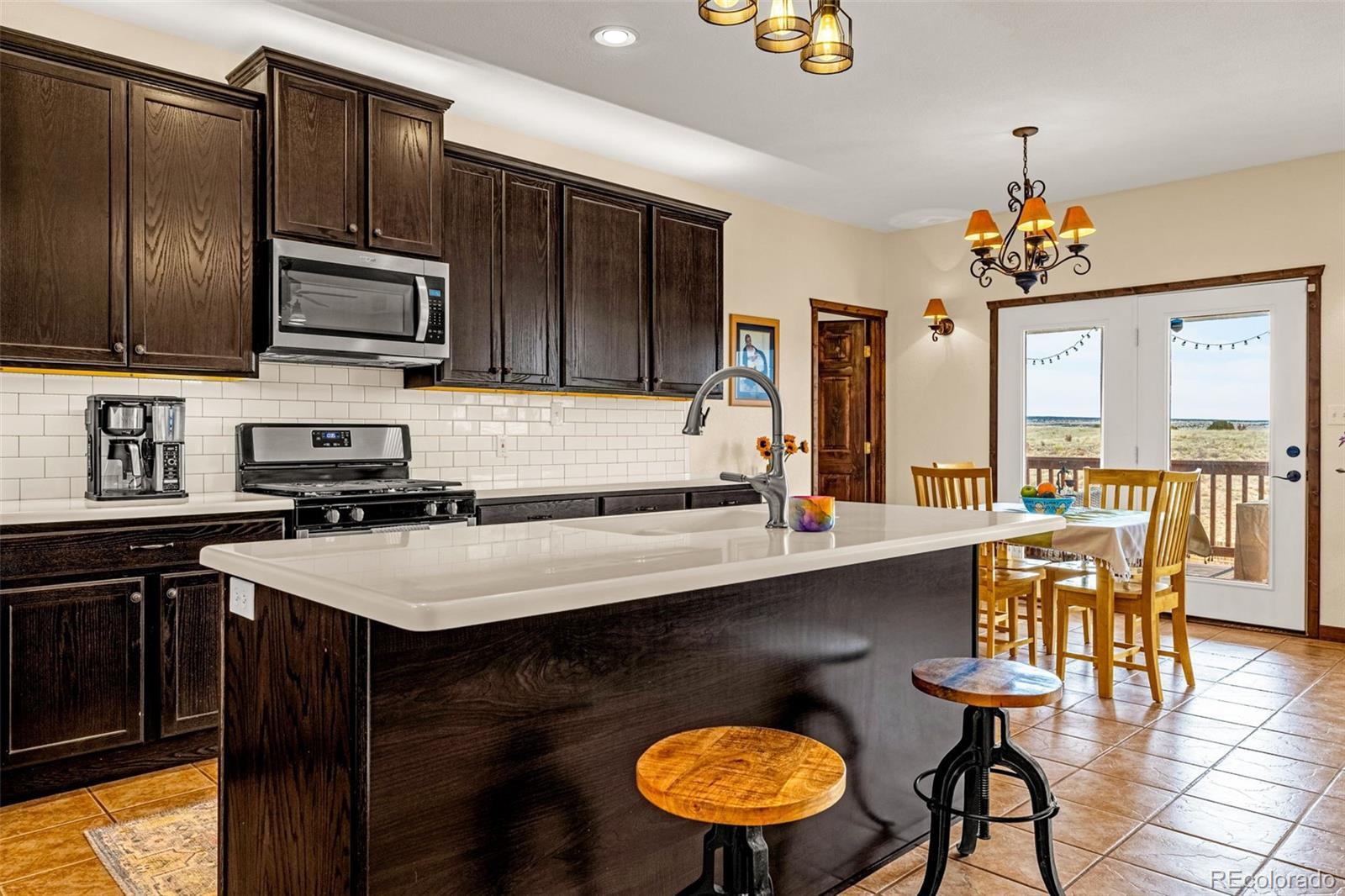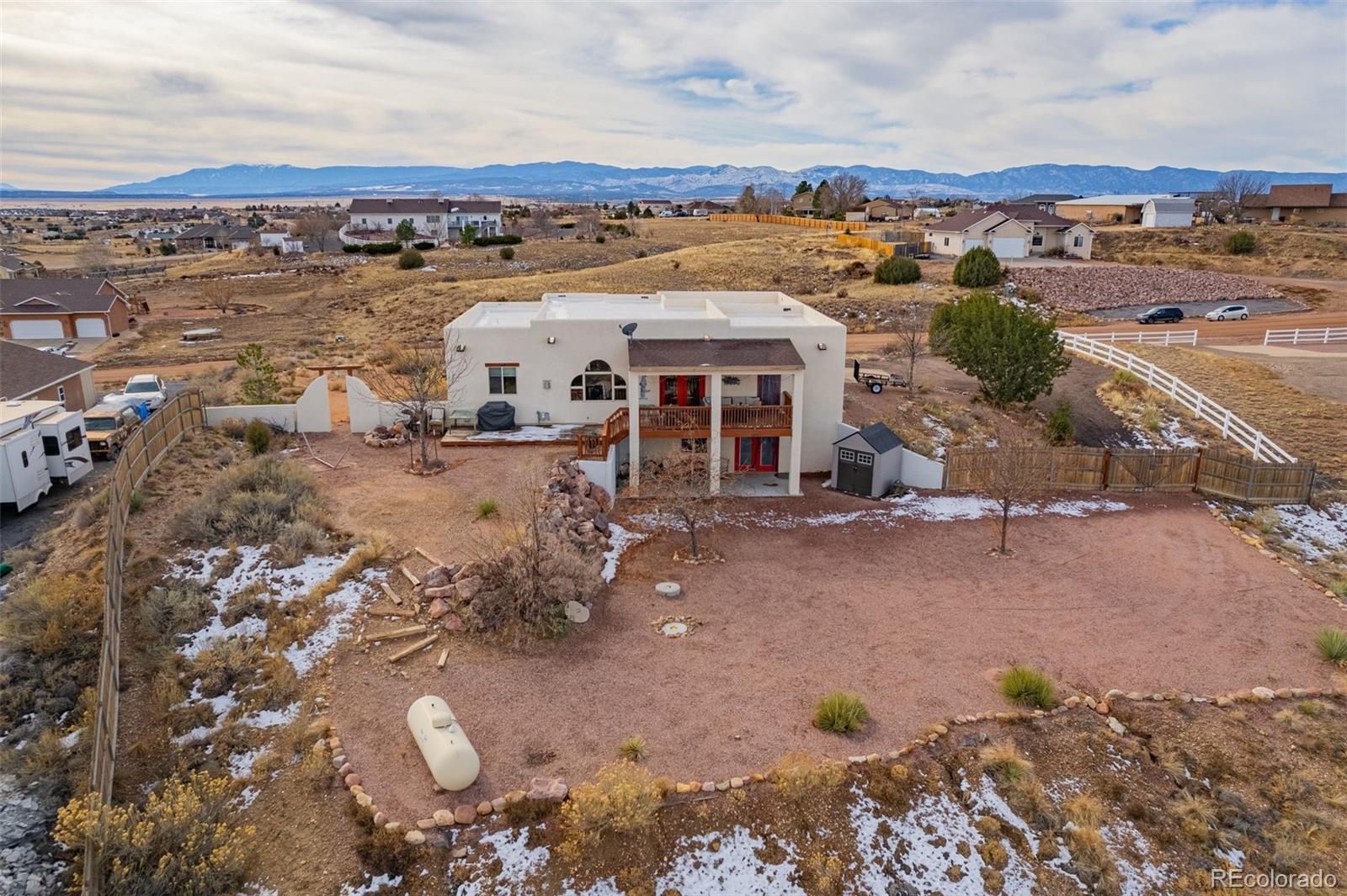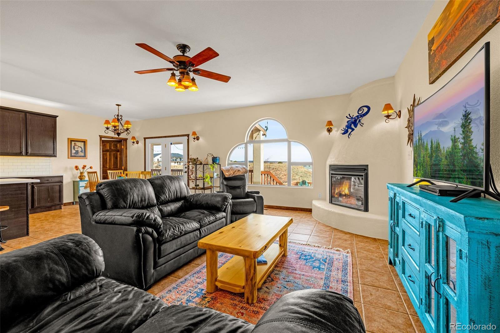 Nestled on a sprawling 1.03-acre lot just minutes from the outdoor playground of Pueblo Reservoir, this Adobe-style stunner delivers space, style, and serious Colorado lifestyle vibes. With a wide open layout, the upper level is the heart of the home, featuring a spacious primary suite with jetted tub, dual vanities, water closet and walk in shower. Additionally on the main floor are 2 secondary bedrooms, a full bath, and a huge open-concept kitchen, living, and dining area anchored by warm tile floors, arched windows, and a cozy fireplace. Natural light pours in, beaming light on the dark and dramatic kitchen cabinets and creating an inviting space that’s perfect for entertaining or everyday living. A dedicated home office offers the ideal work-from-home setup with peaceful views and plenty of separation. Downstairs, the gigantic family room delivers serious flexibility, whether you’re hosting movie nights, game days, or creating a music or hobby space. This level also includes two more bedrooms, a full bathroom, and large utility room — ideal for gear, hobbies, or storage without feeling like a dungeon. Step outside to enjoy the covered deck, overlooking a fenced backyard and sweeping Colorado skies. There’s room to roam, relax, entertain, and still have space left over for toys, gardens, or future plans. With classic Adobe charm, generous square footage, and quick access to boating, fishing, hiking, and trails, this home offers the perfect balance of comfort, character, and adventure.